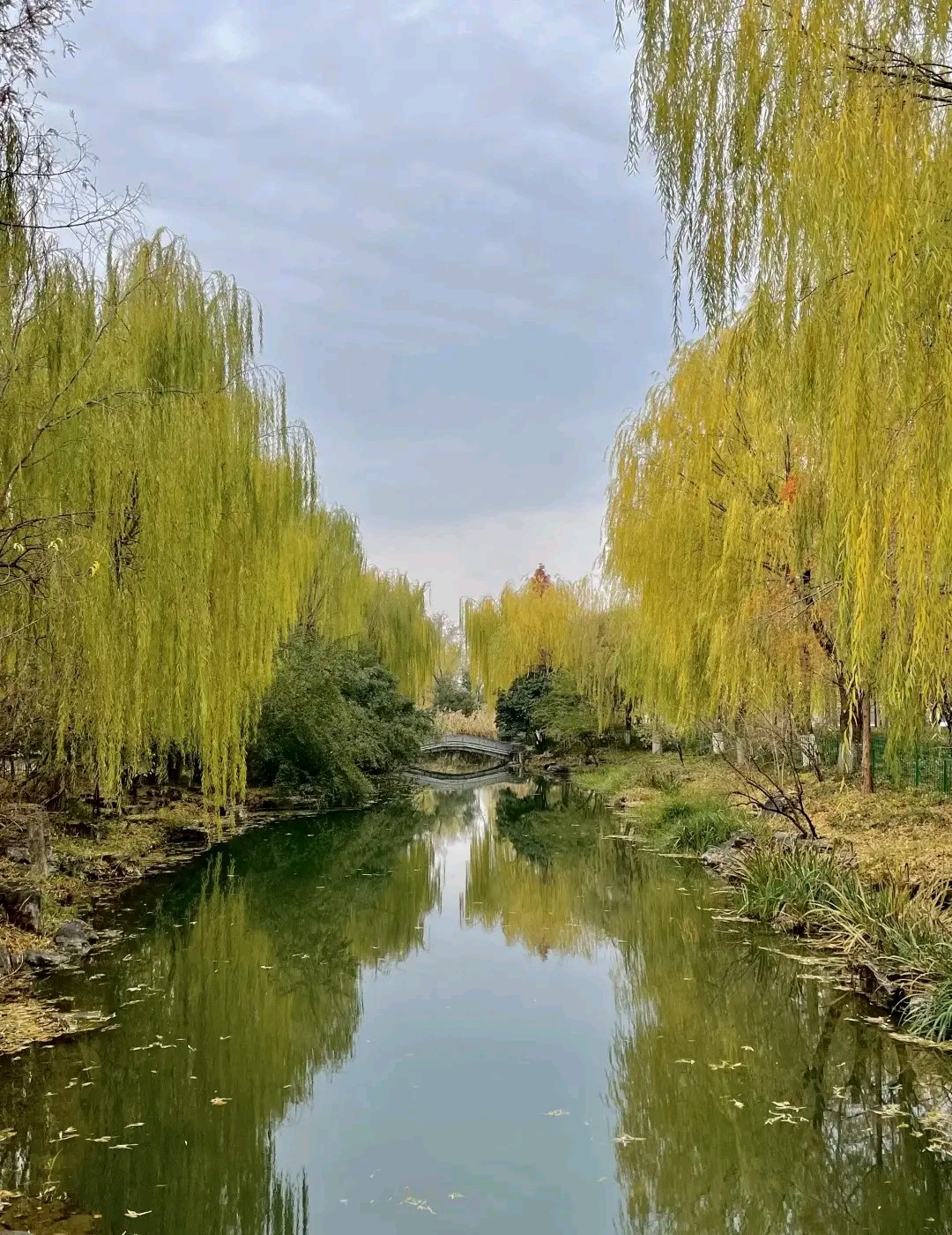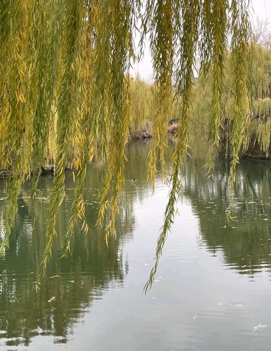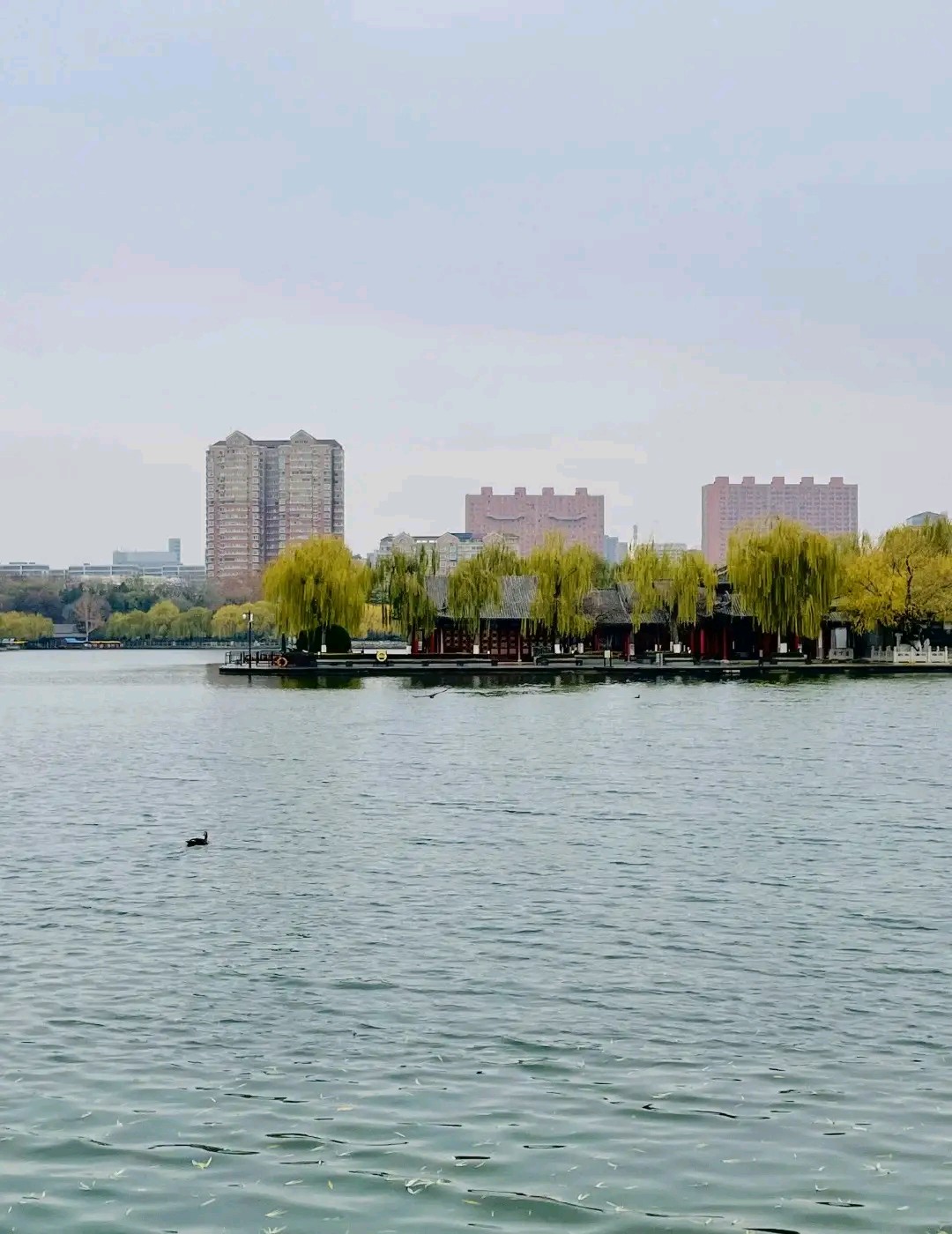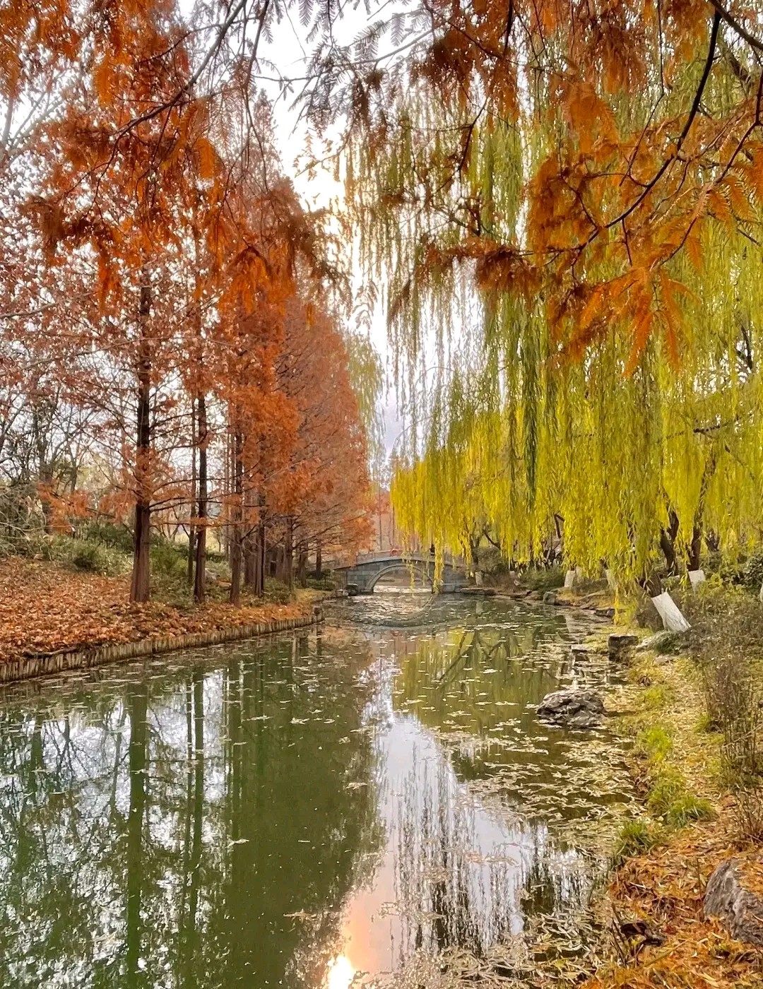 左岸是炽烈的红杉林,右岸摇曳着翠绿垂柳,湖畔绿柳垂,高楼耸立间,湖面波光粼粼,一只鸭子悠然游弋限定美景,尽在这一刻。