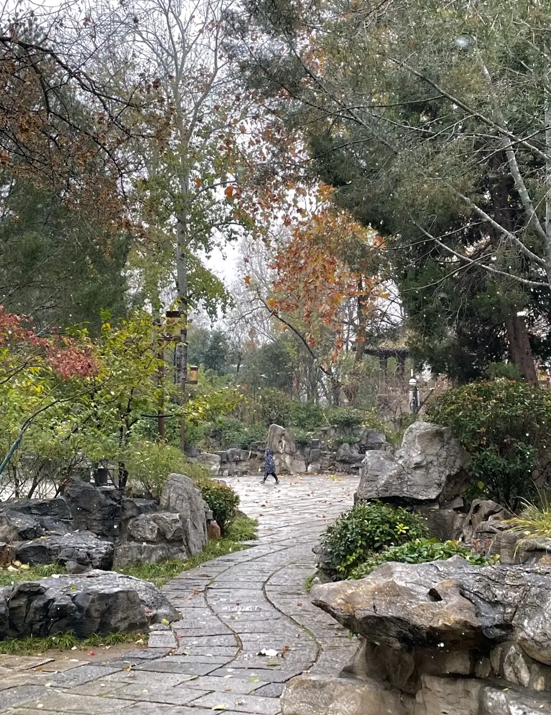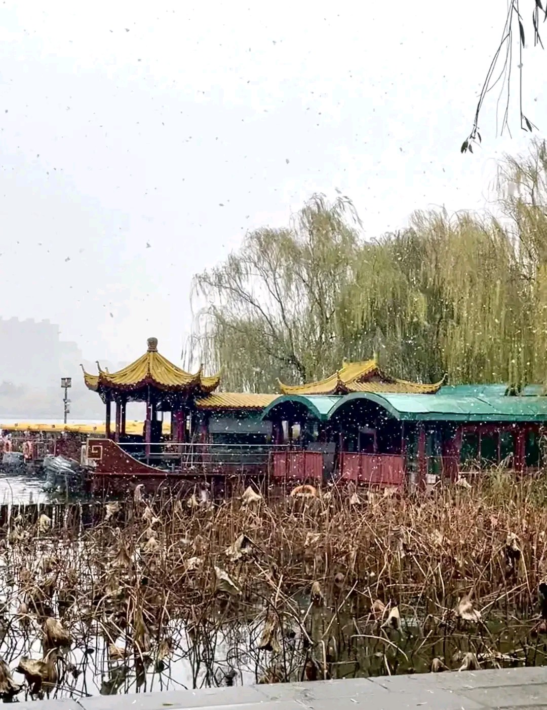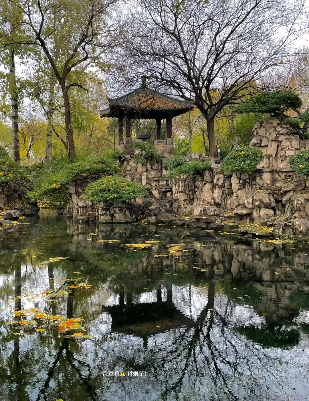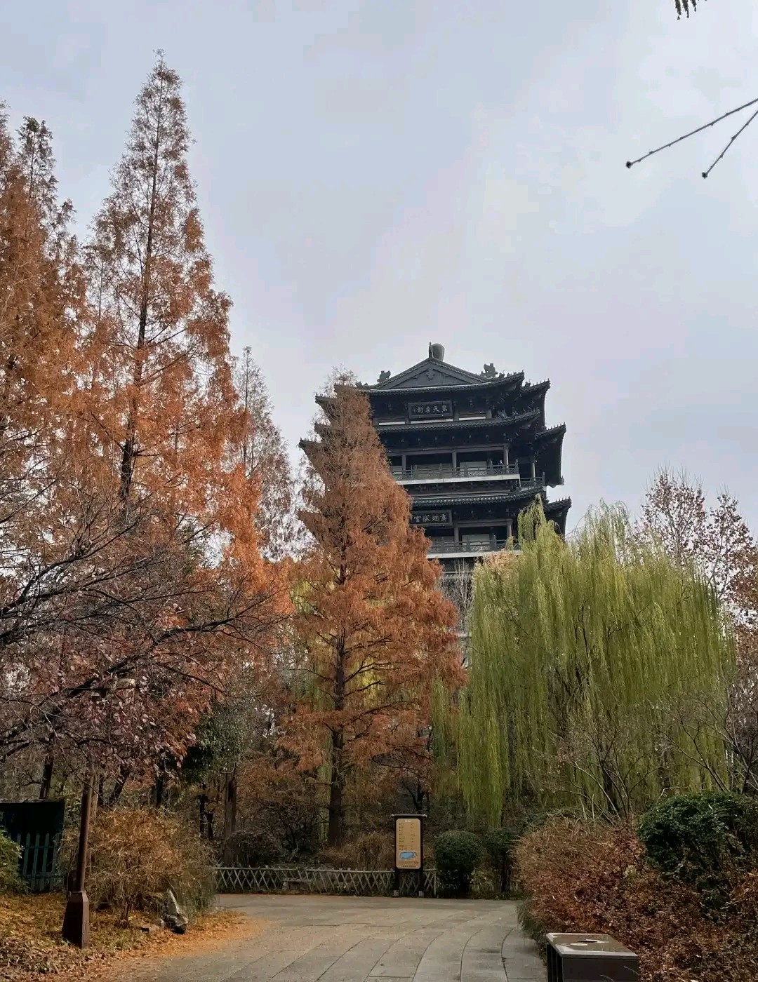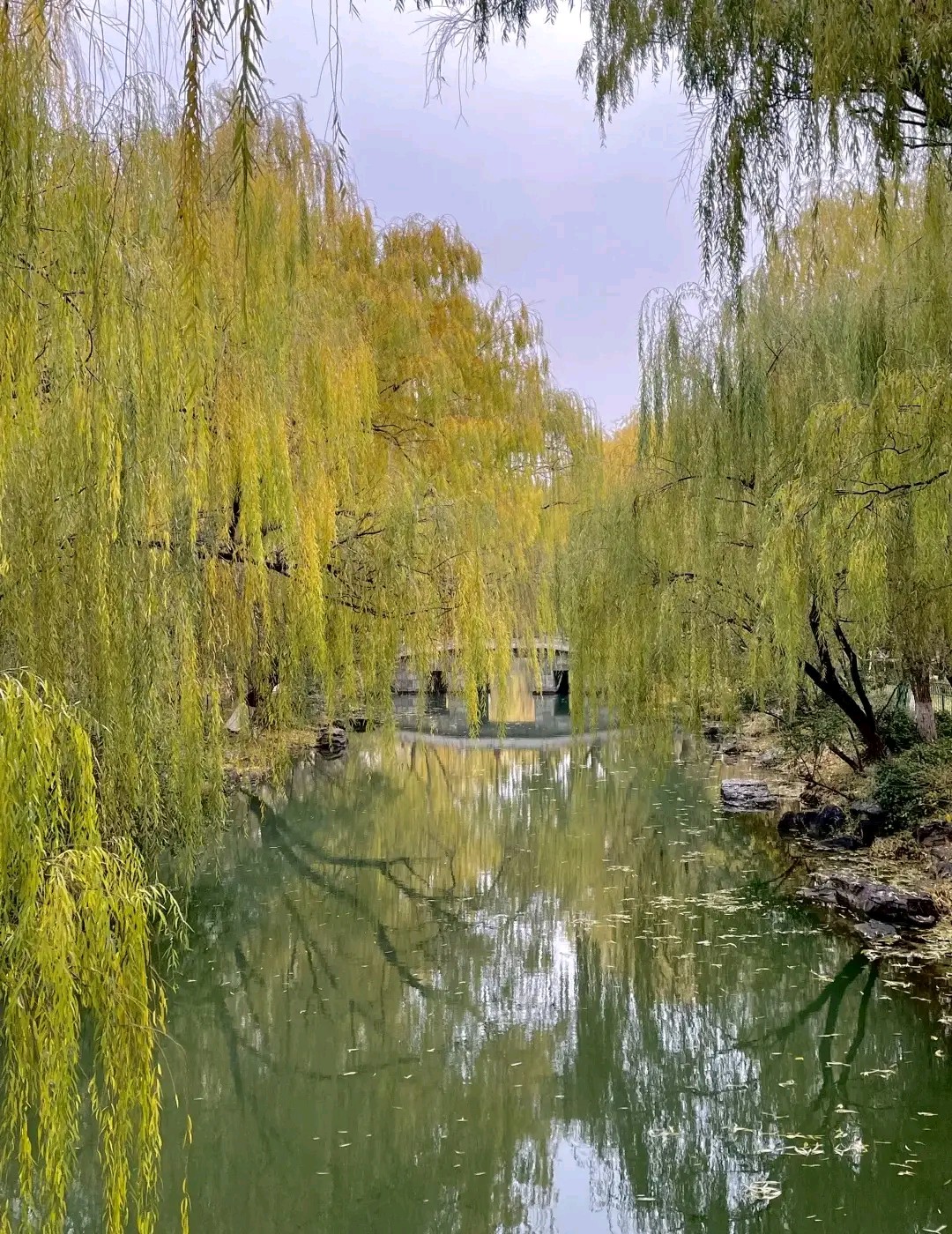 左岸是炽烈的红杉林,右岸摇曳着翠绿垂柳,湖畔绿柳垂,高楼耸立间,湖面波光粼粼,一只鸭子悠然游弋限定美景,尽在这一刻。