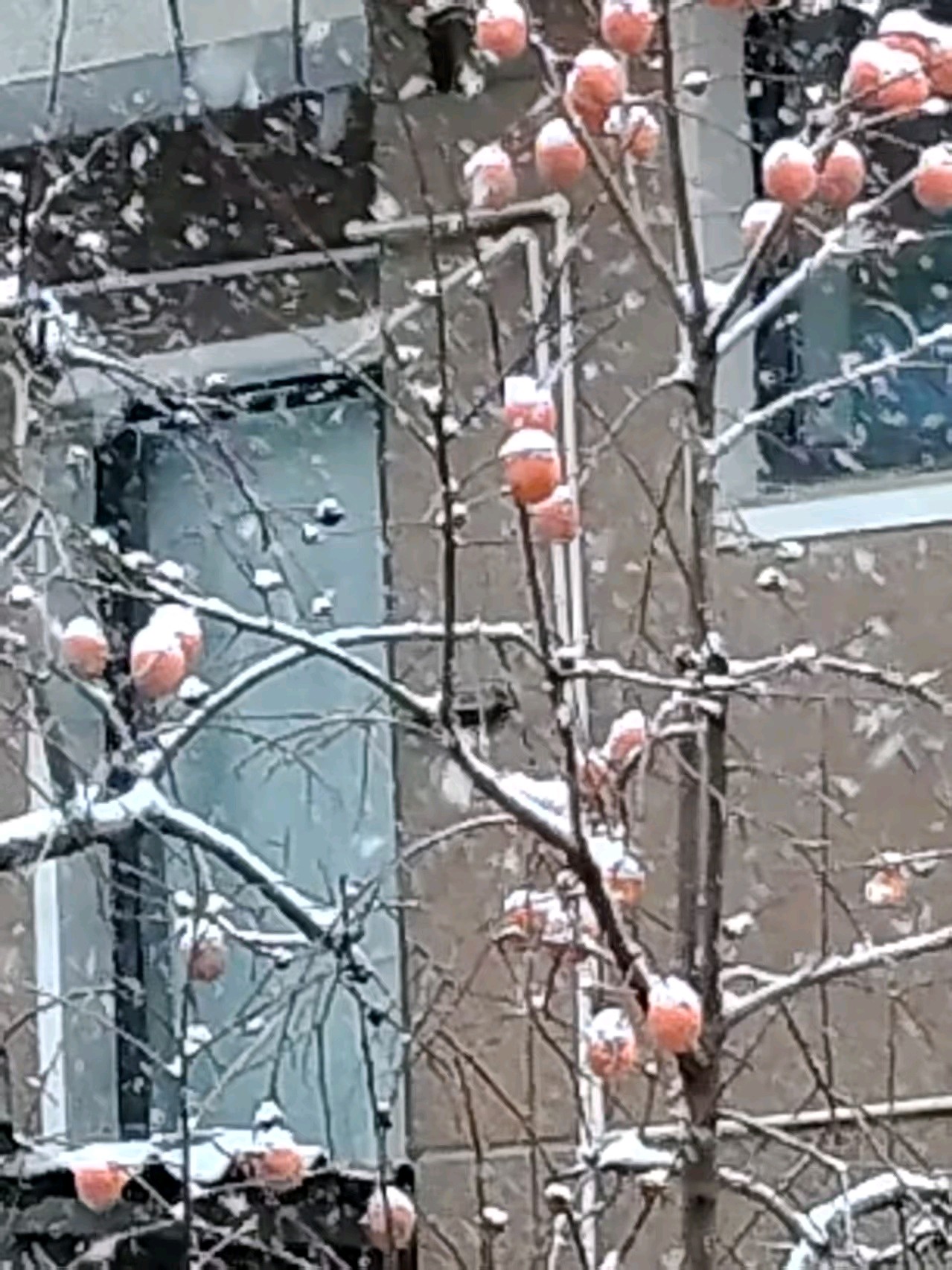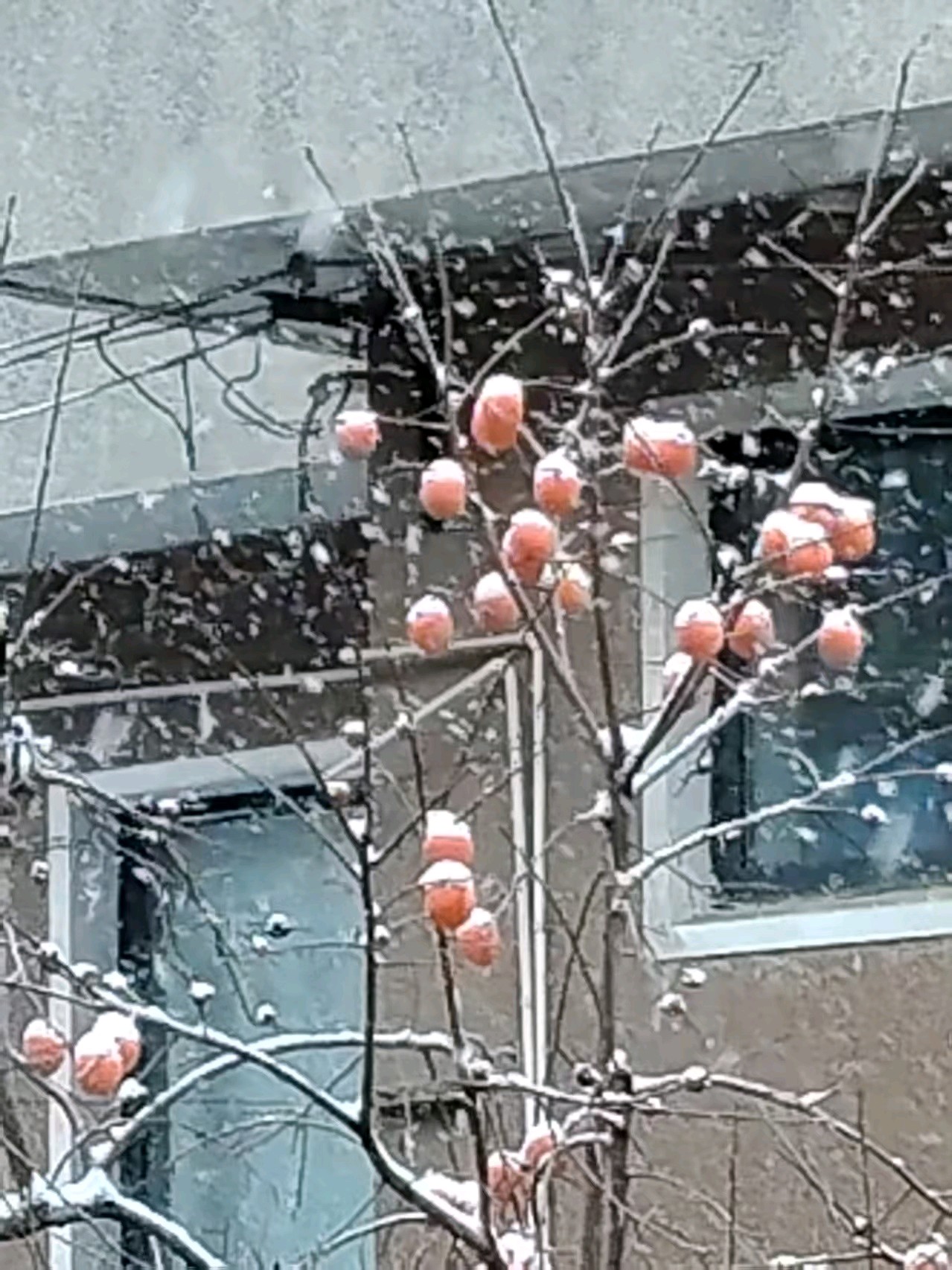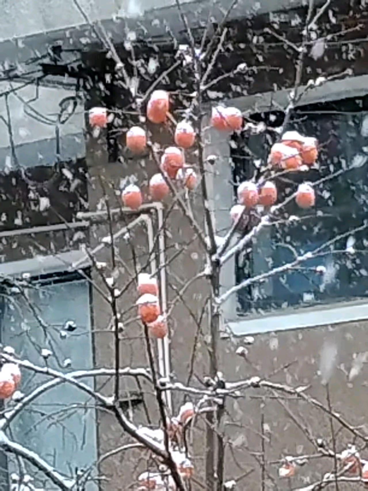 今天迎来了冬天的第一场雪,雪花纷飞中,望见了对面的柿子树,干树枝上挂着十几个柿子,雪花落在上面,形成了一层霜,好一幅雪中的柿柿如意