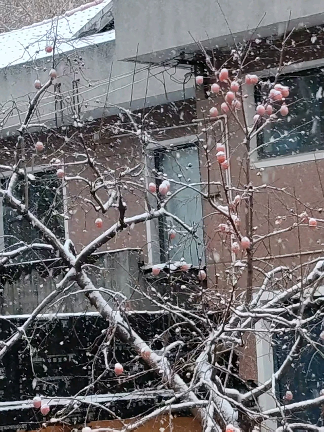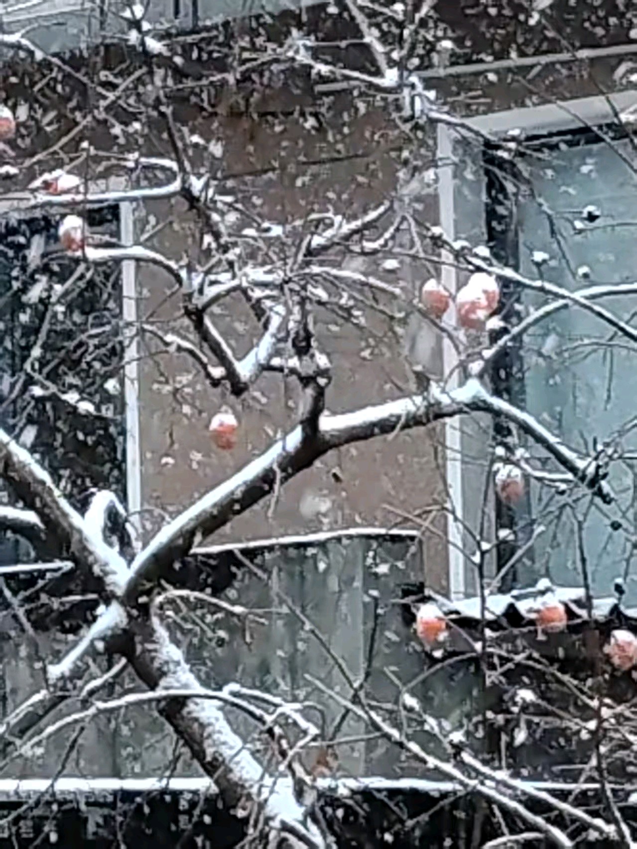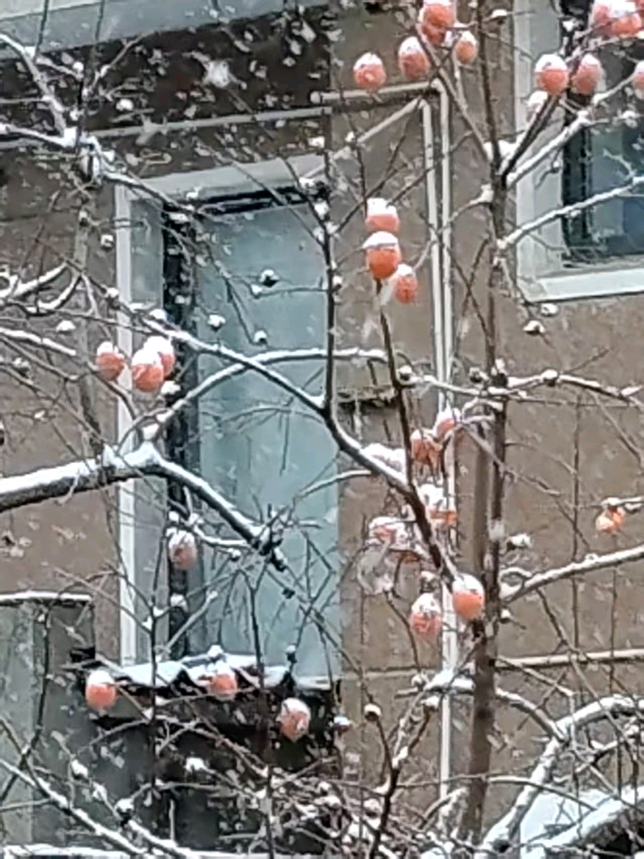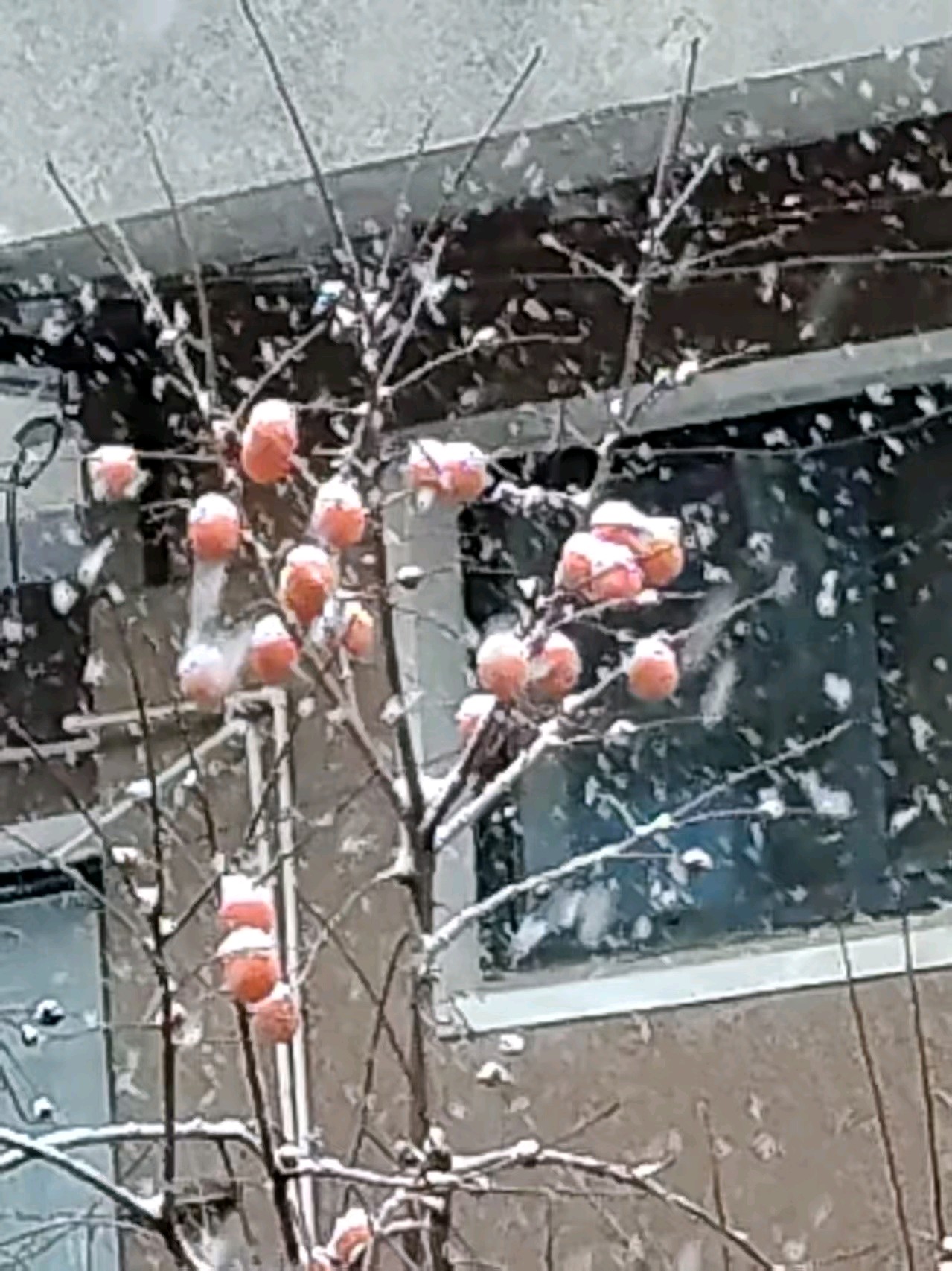 今天迎来了冬天的第一场雪,雪花纷飞中,望见了对面的柿子树,干树枝上挂着十几个柿子,雪花落在上面,形成了一层霜,好一幅雪中的柿柿如意