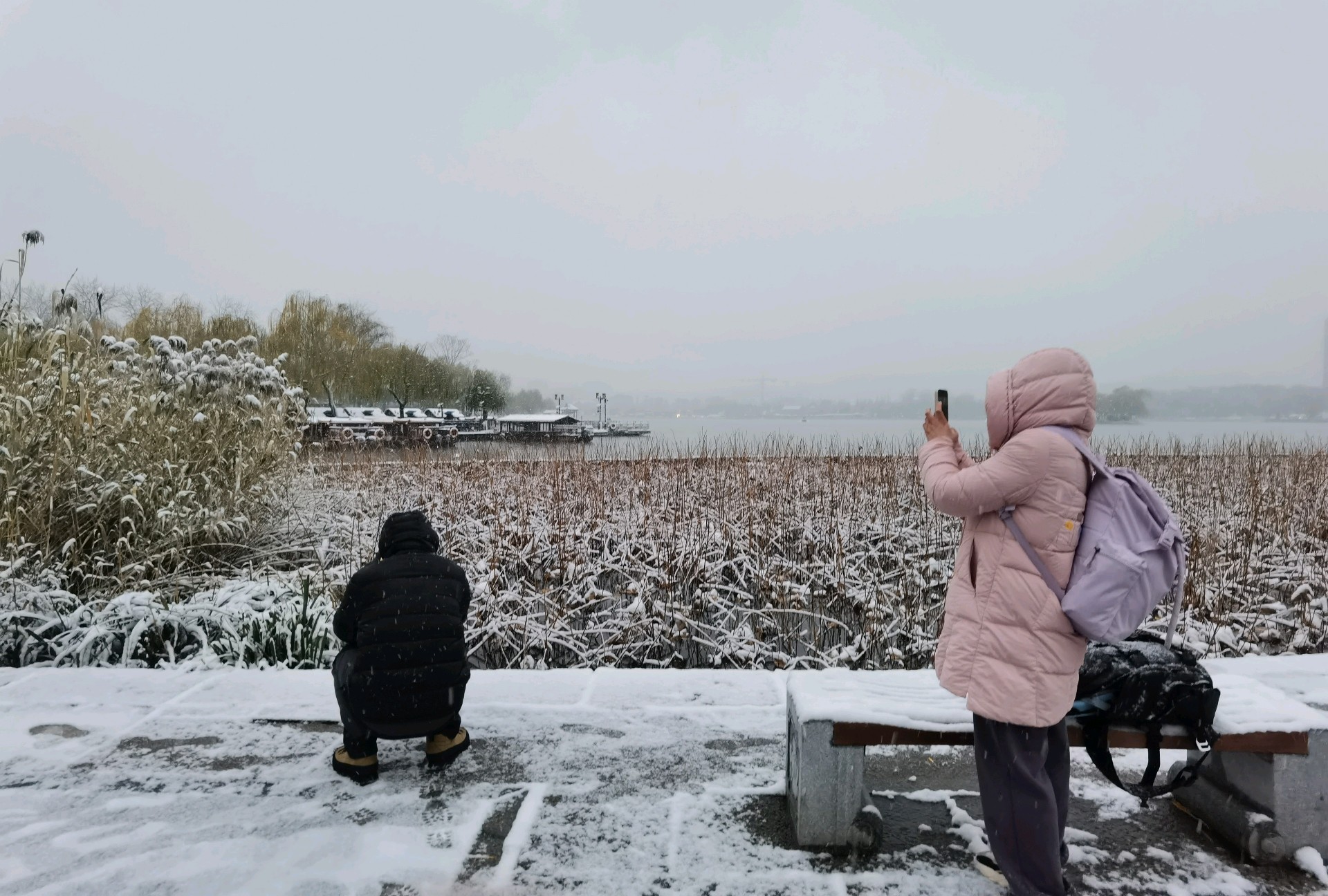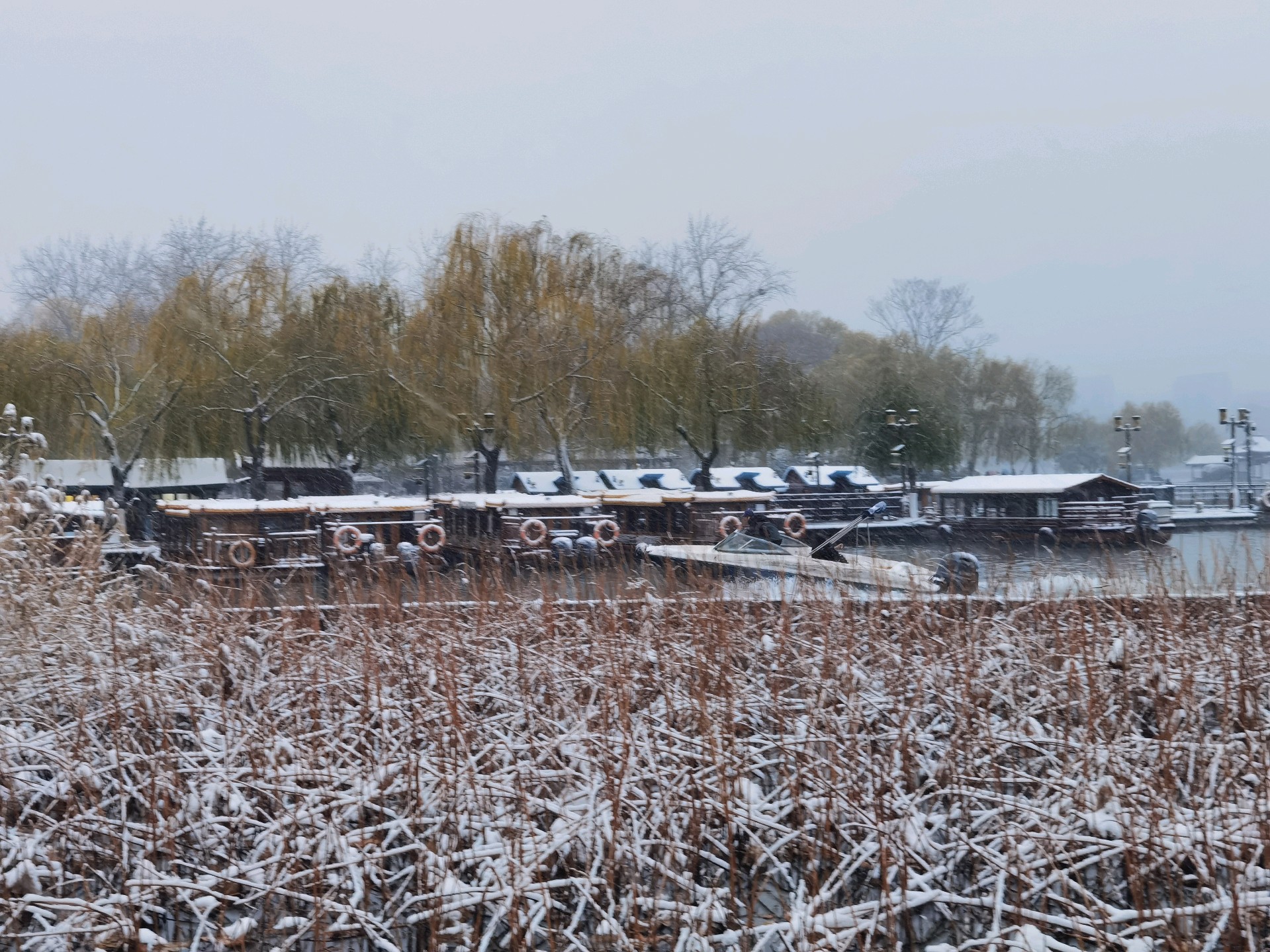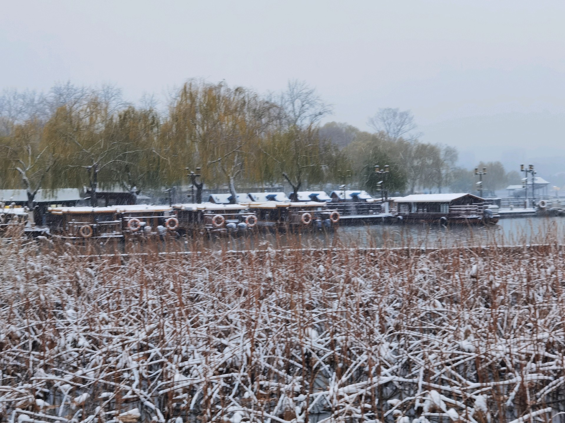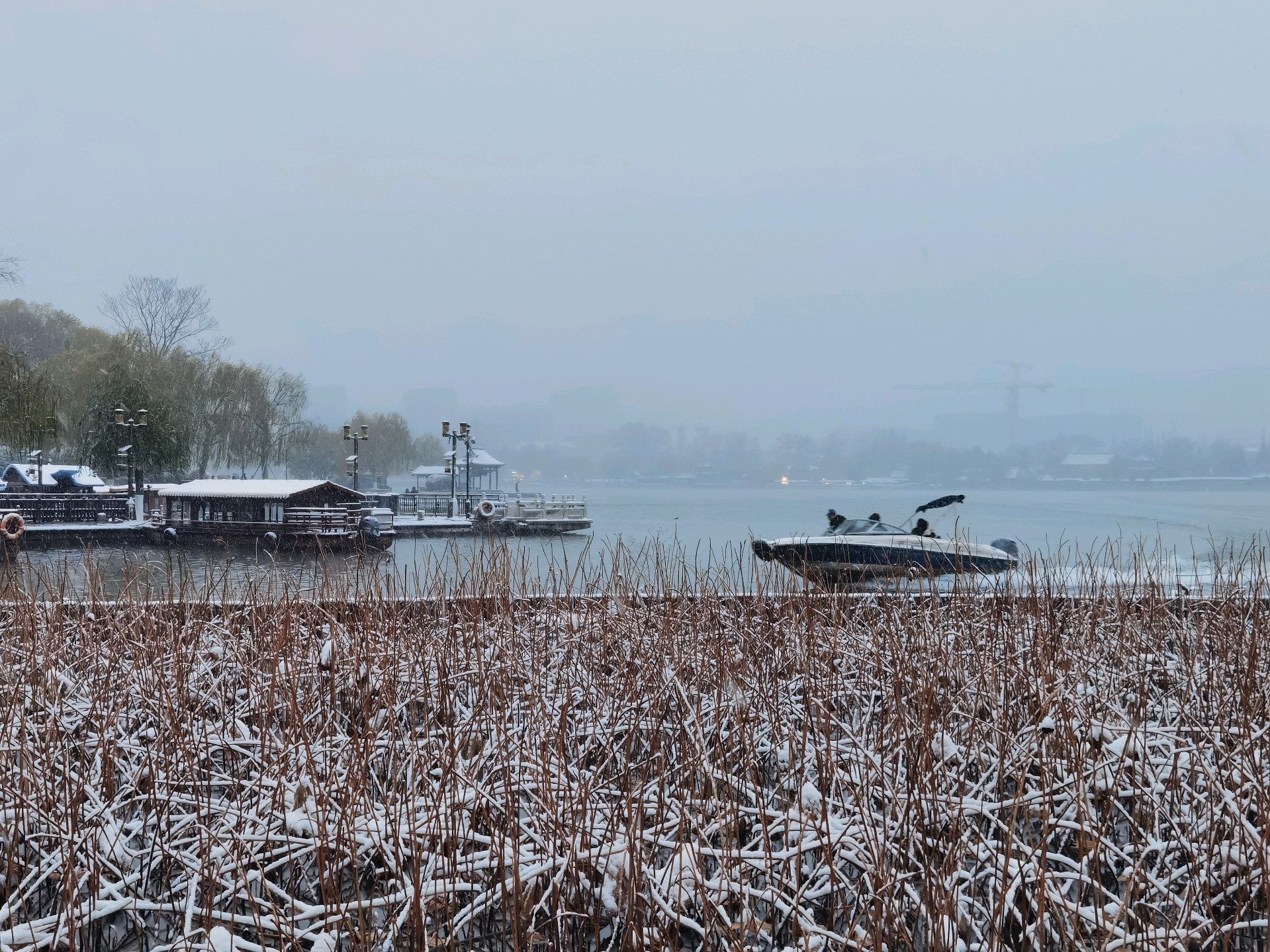 雪落湖边,游客不减芦苇银装素裹,小船破浪前行。冬日的静谧与生机交织,湖畔的风景如画。