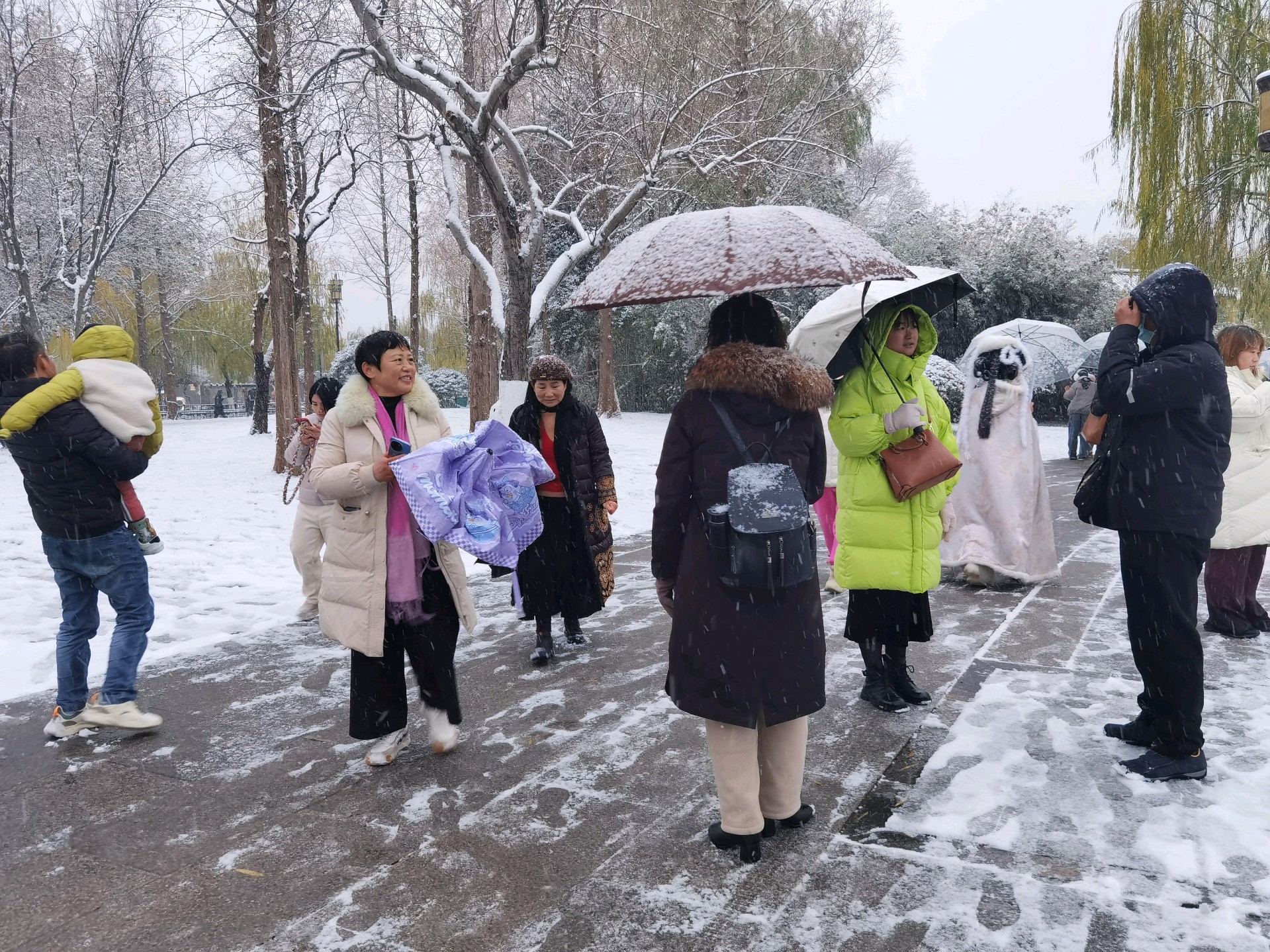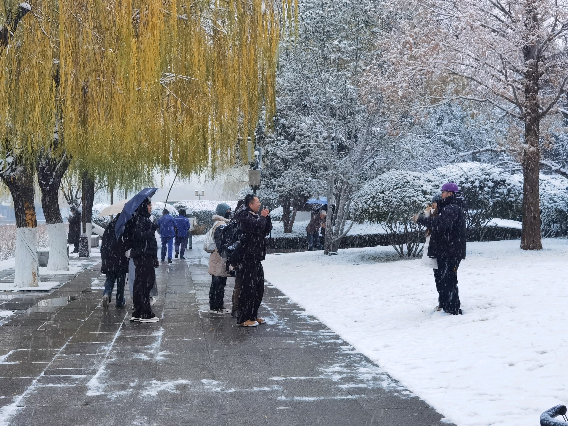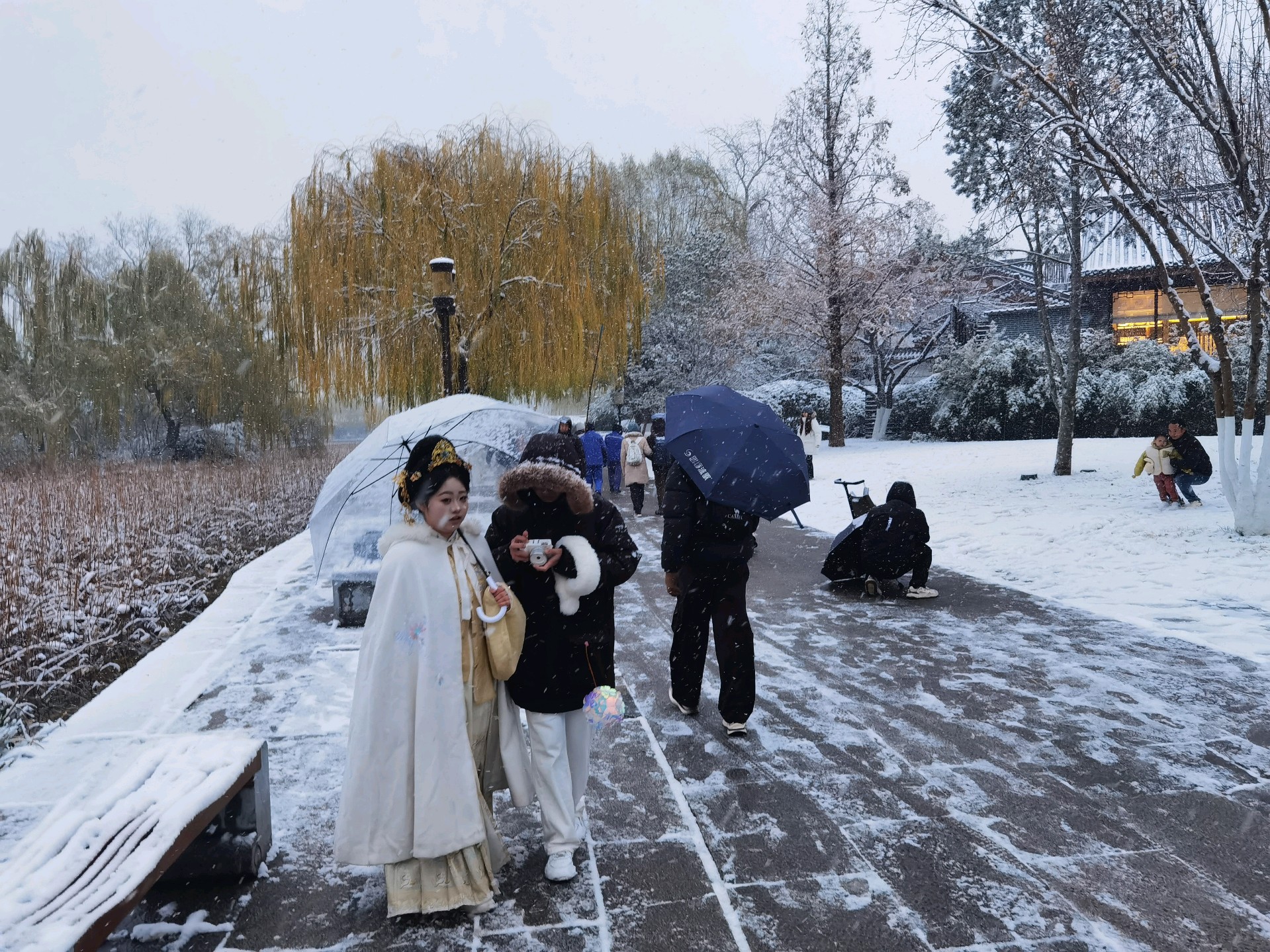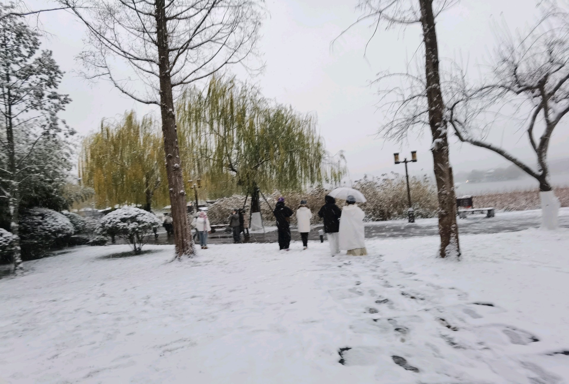 雪落湖边,游客不减芦苇银装素裹,小船破浪前行。冬日的静谧与生机交织,湖畔的风景如画。