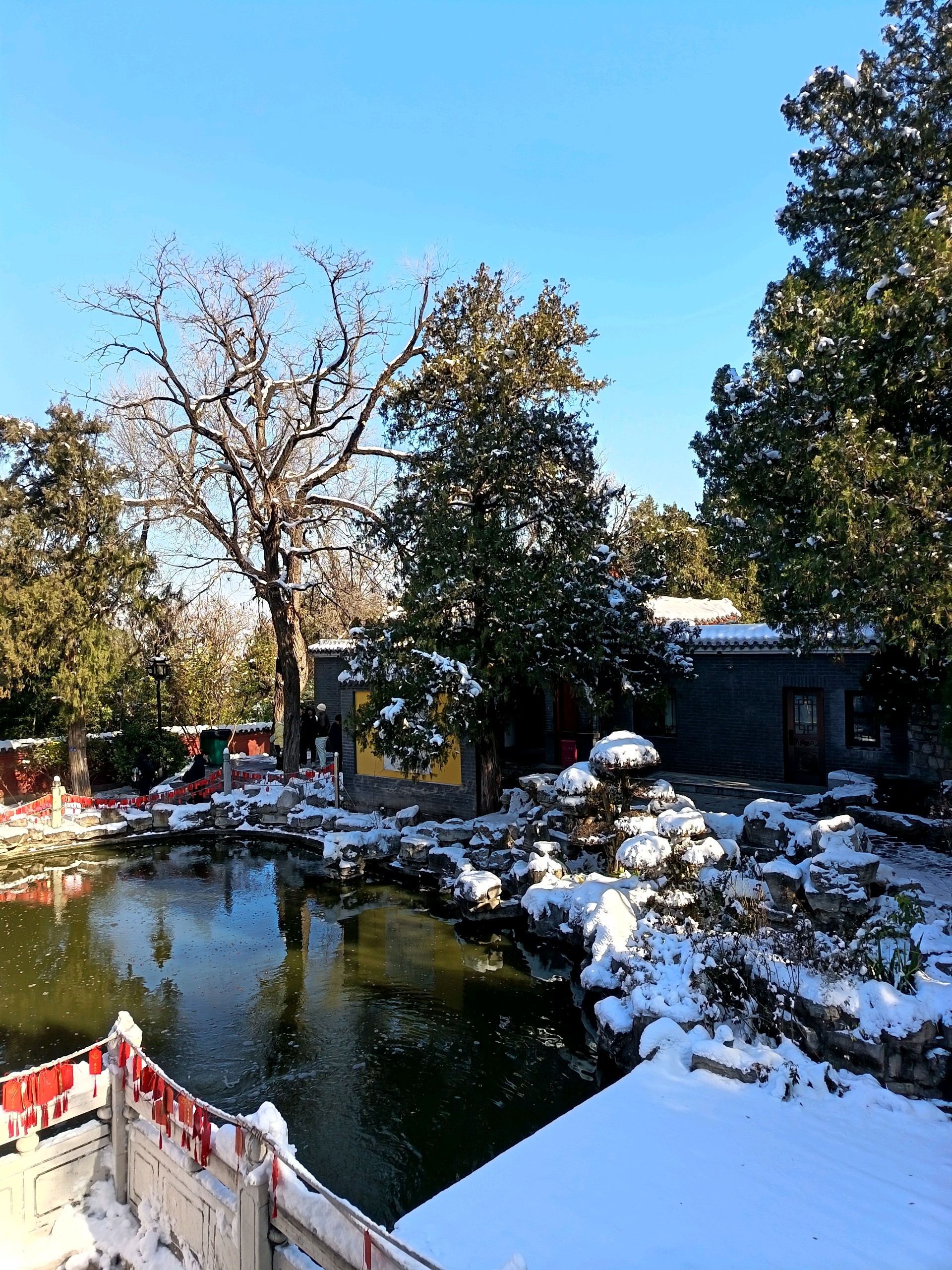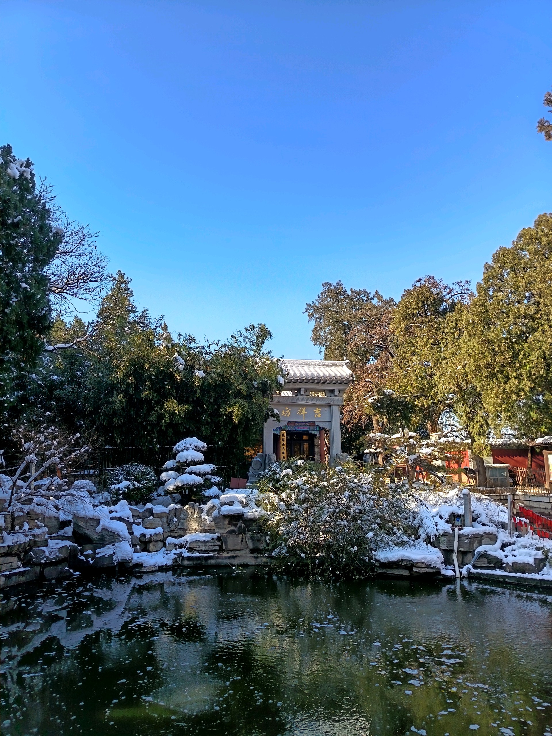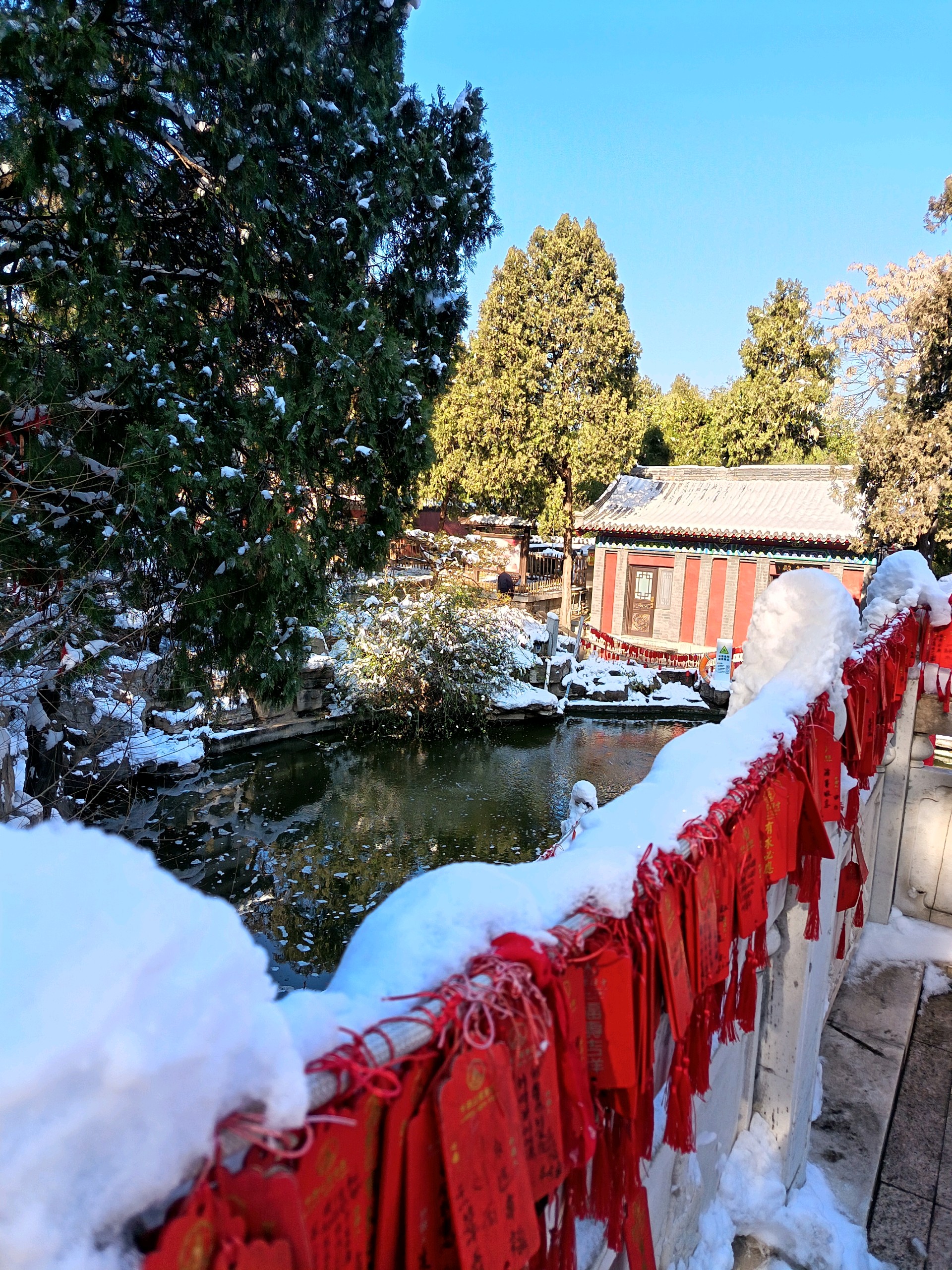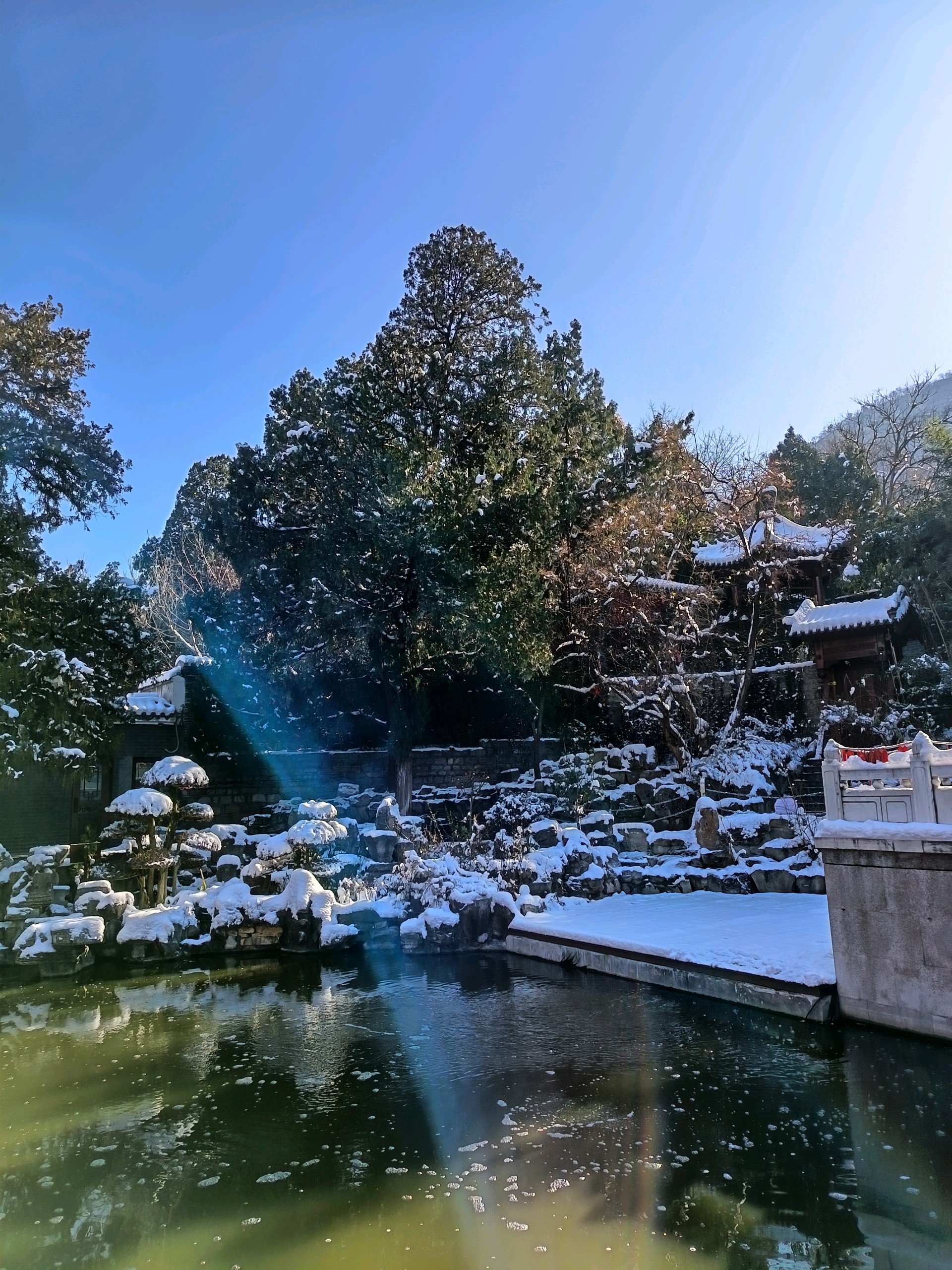 雪后千佛山上,白雪皑皑,观音园内,碧波荡漾,红墙绿树映衬,岁月静好。