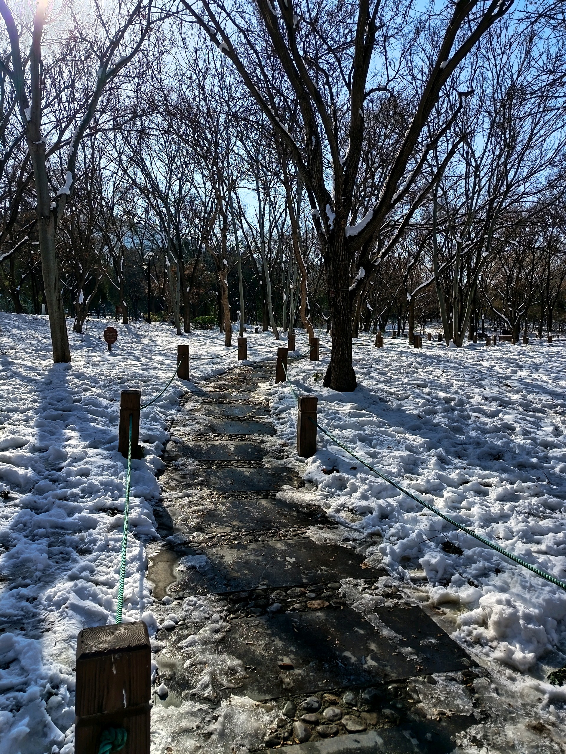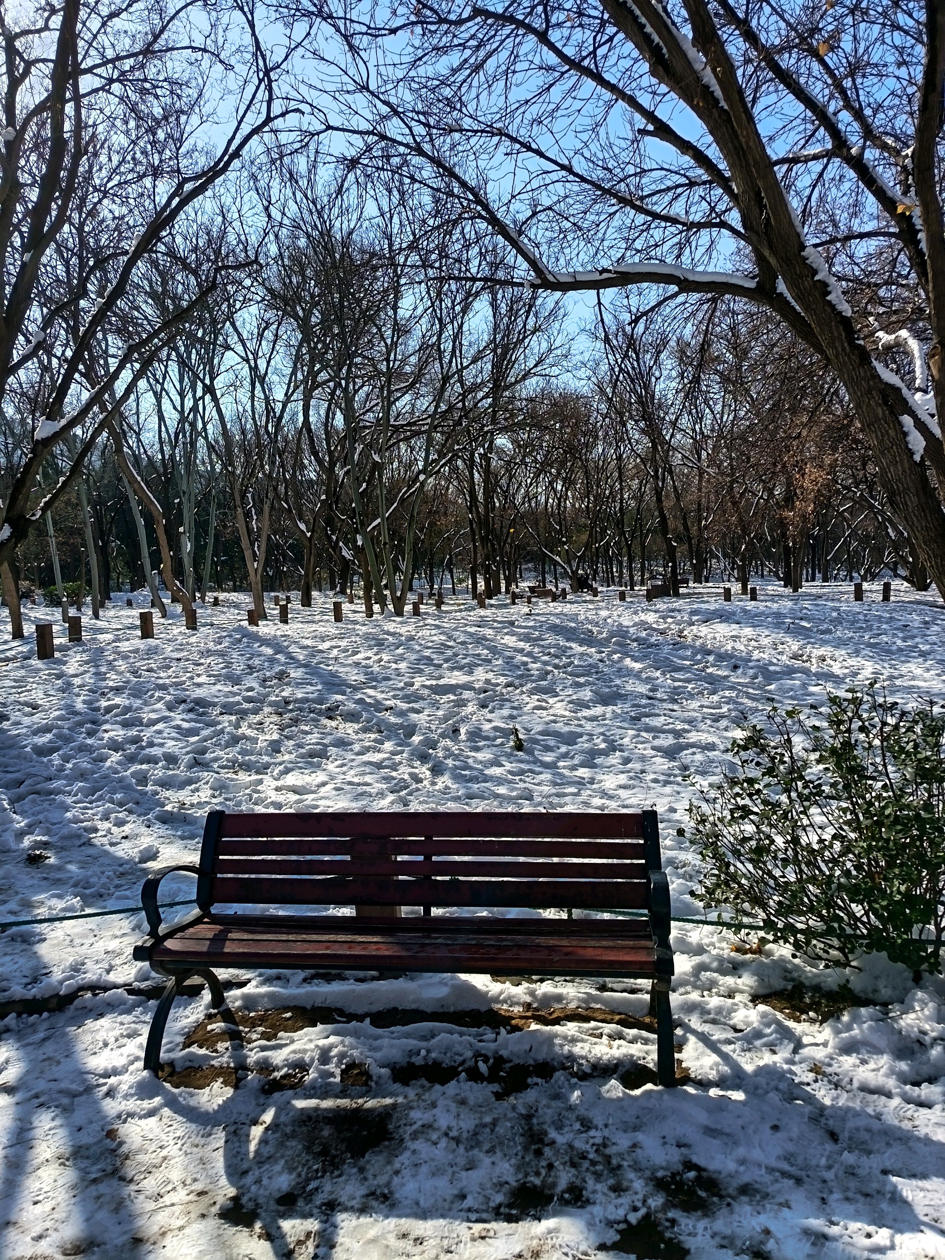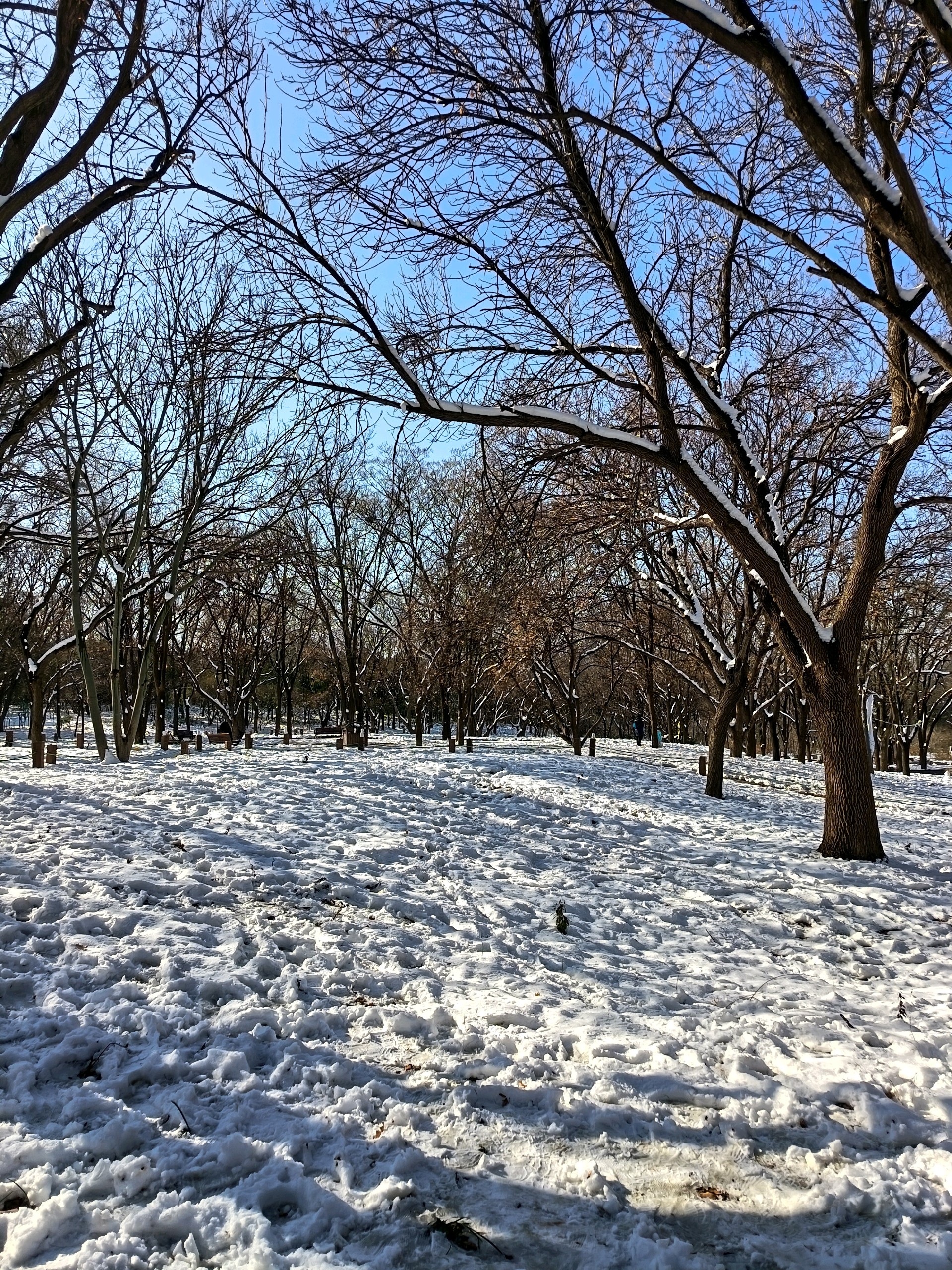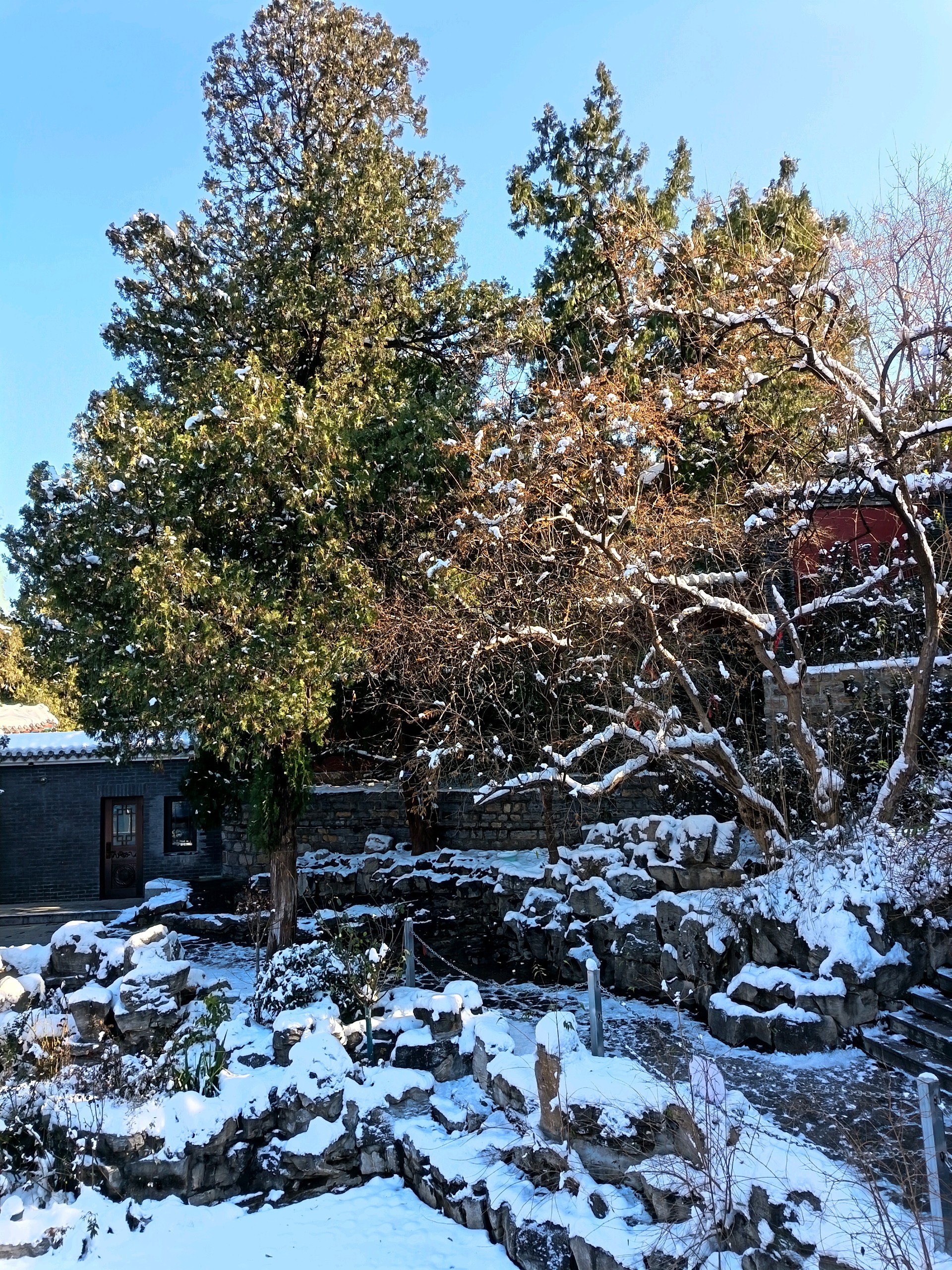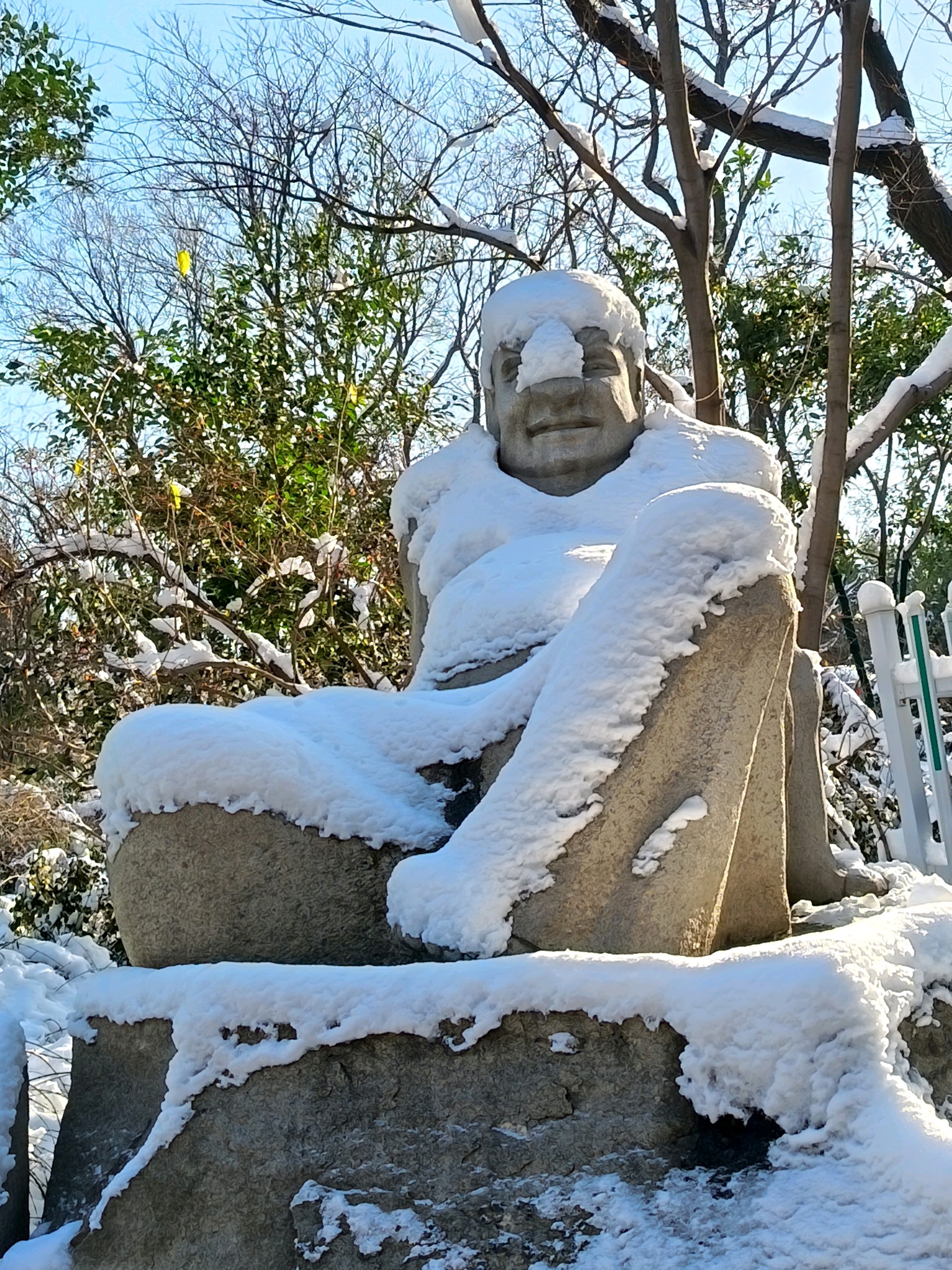雪后千佛山上,白雪皑皑,观音园内,碧波荡漾,红墙绿树映衬,岁月静好。