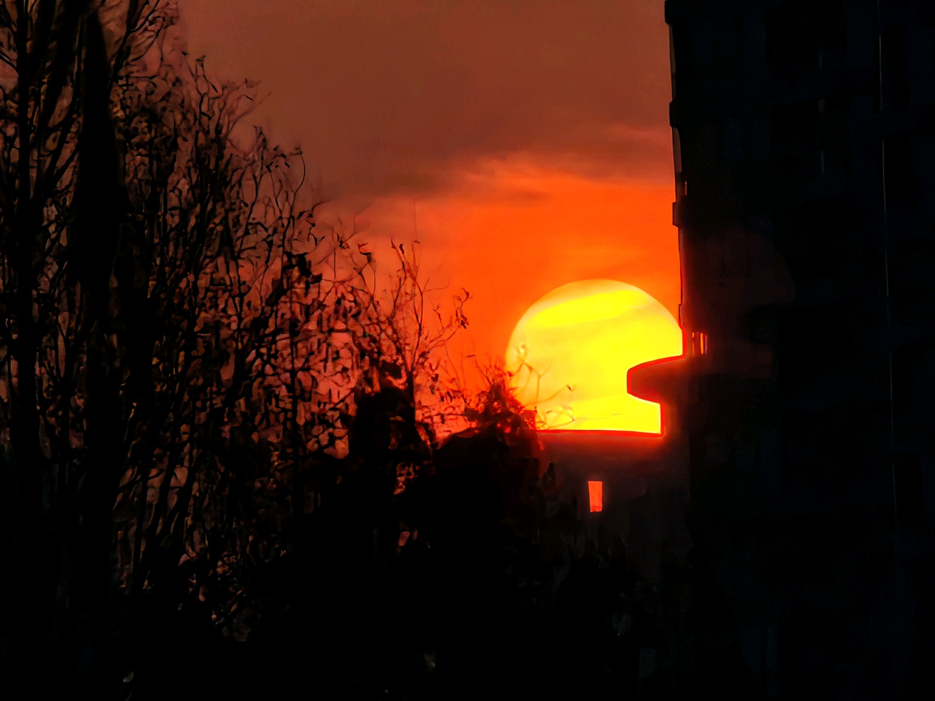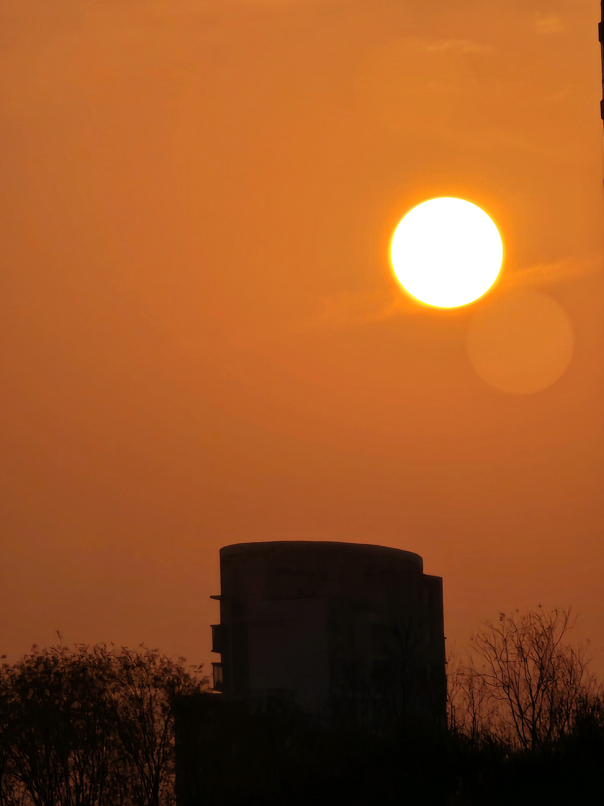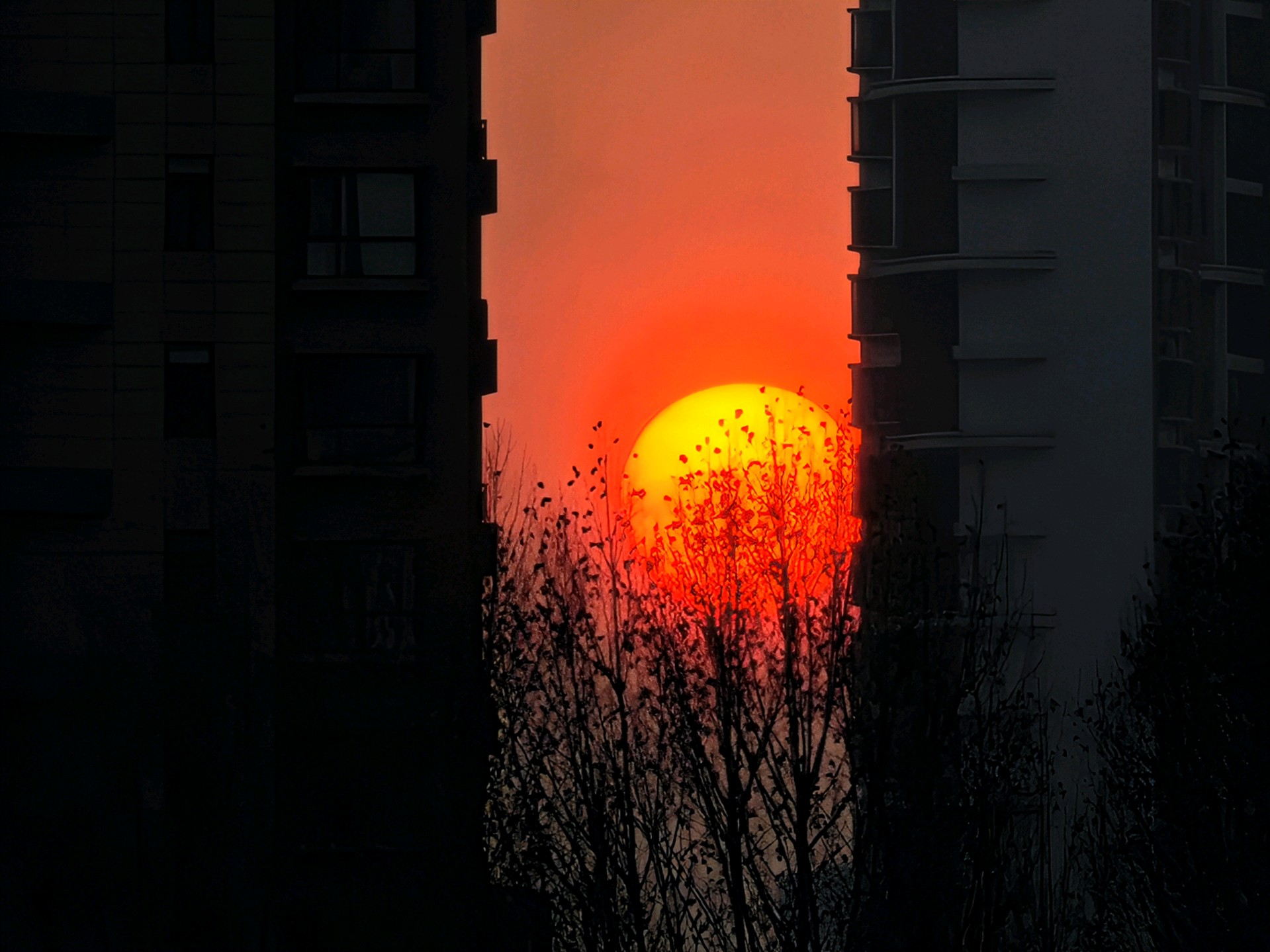 夕阳的余晖把天空染成了橙橘色,圆圆的太阳像一颗红玉挂在空中,温暖而又宁静美好。