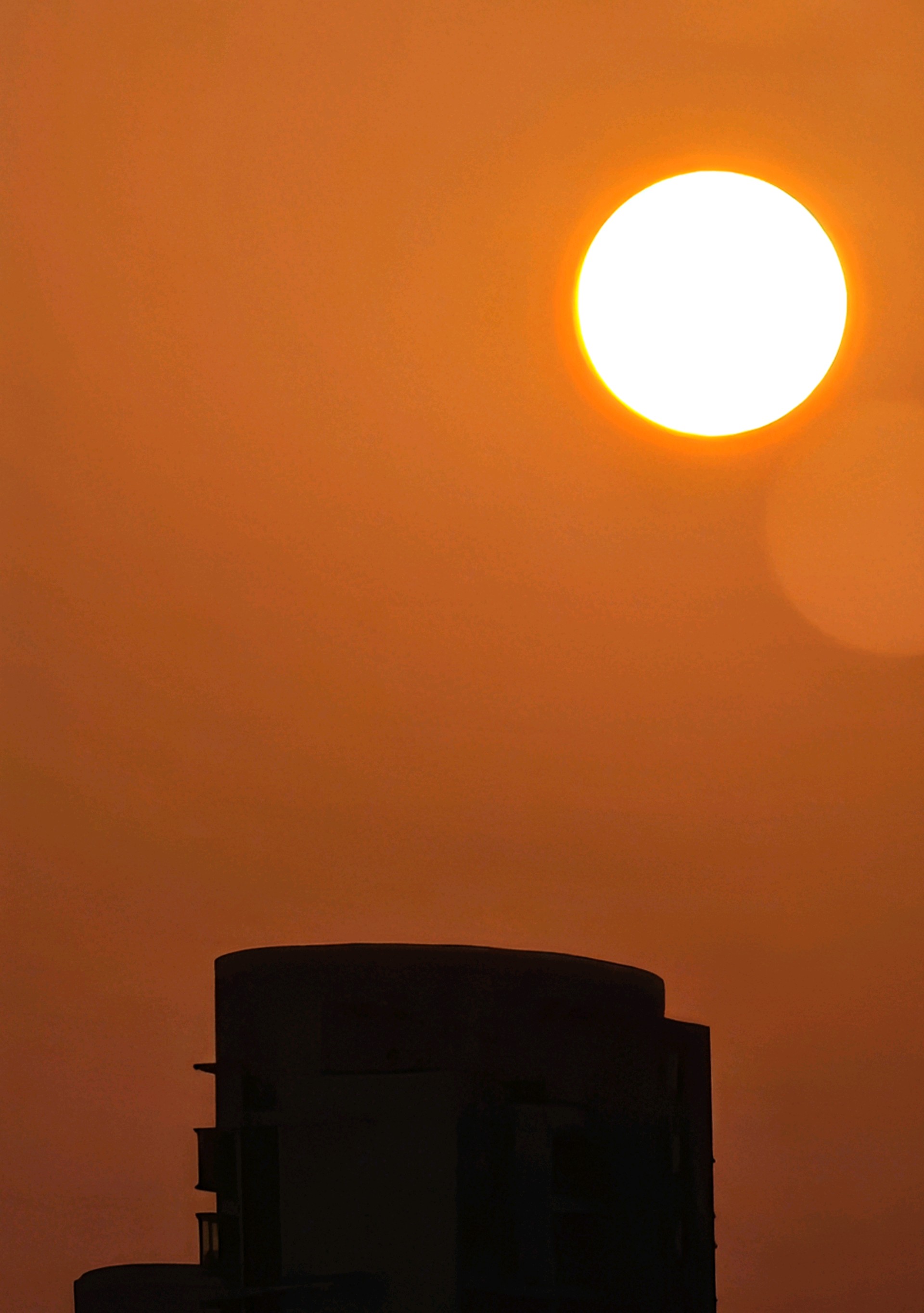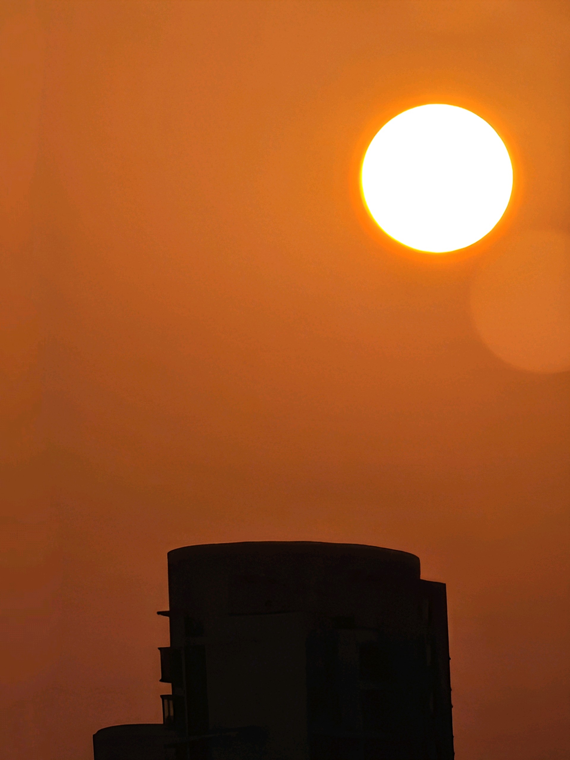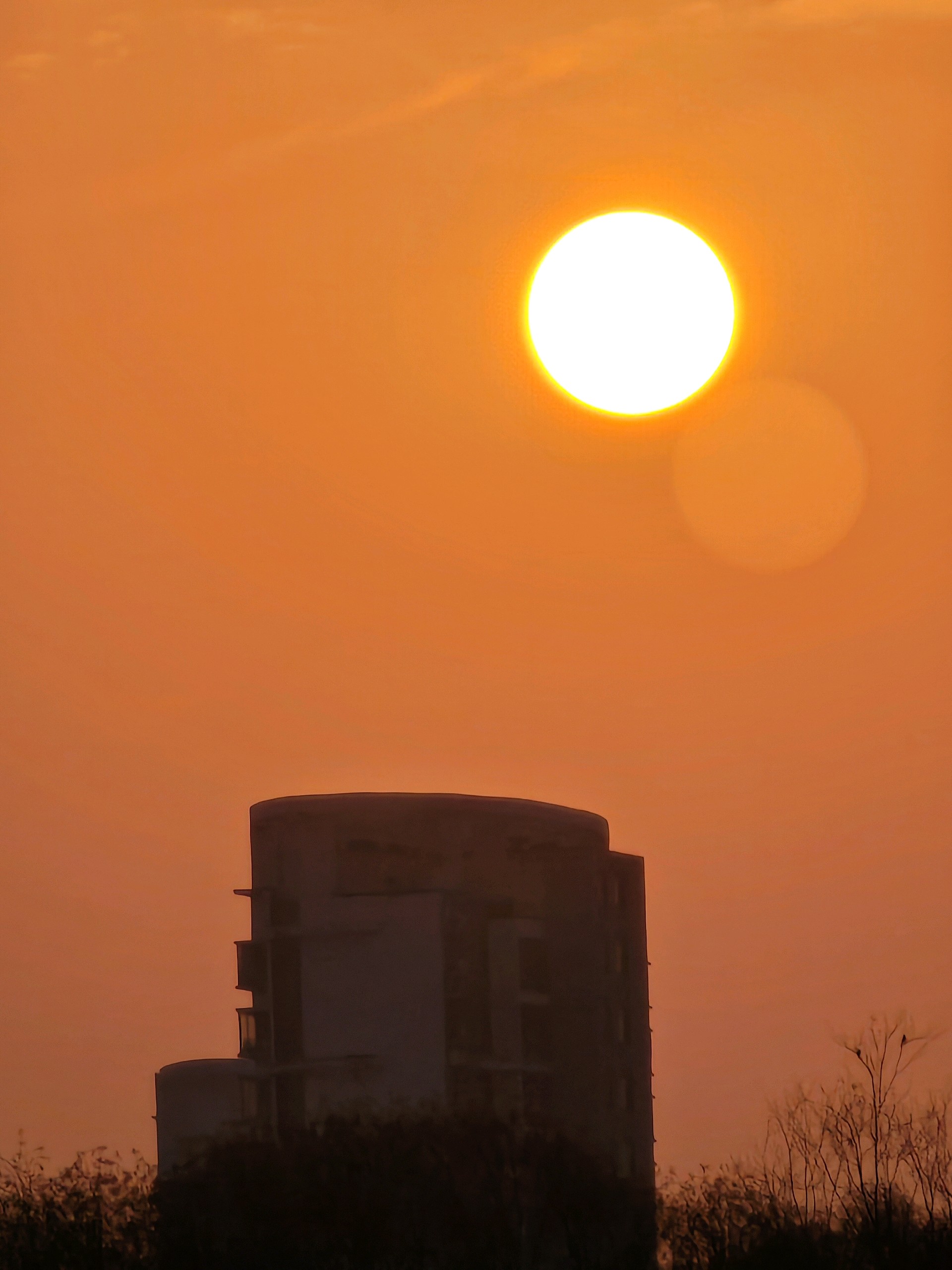 夕阳的余晖把天空染成了橙橘色,圆圆的太阳像一颗红玉挂在空中,温暖而又宁静美好。