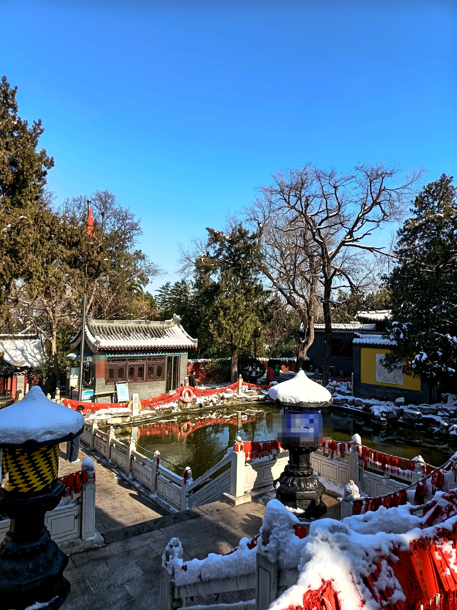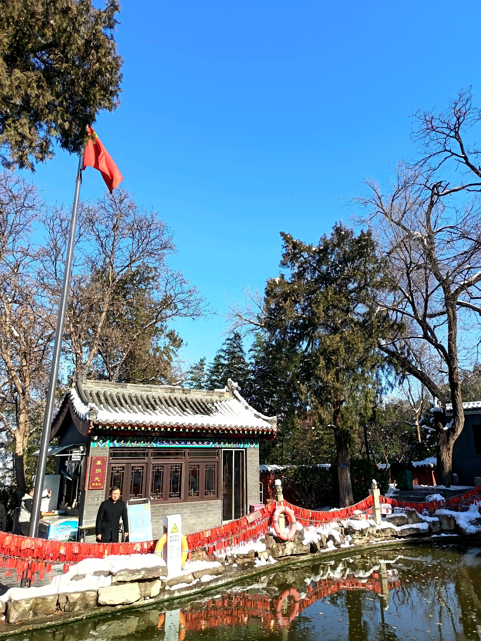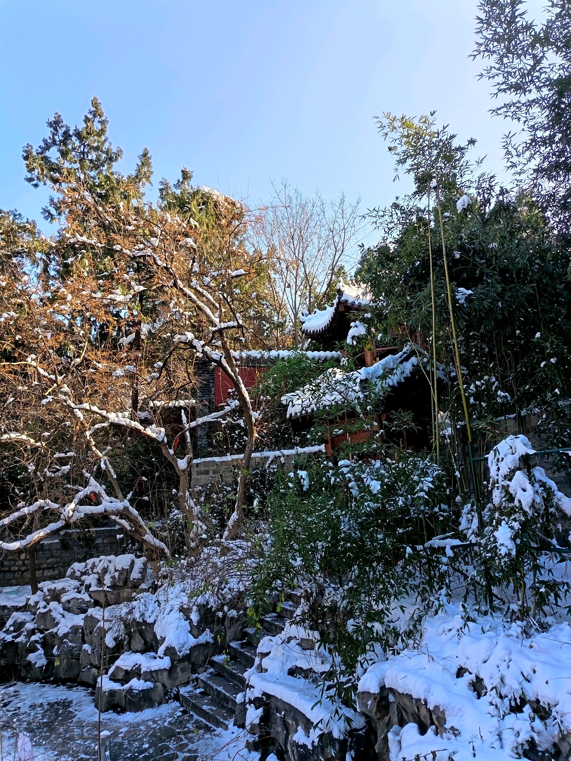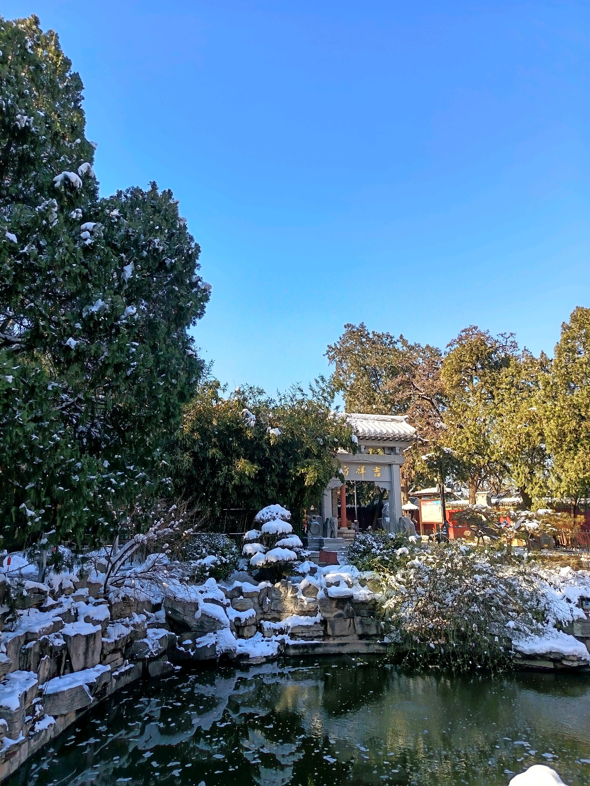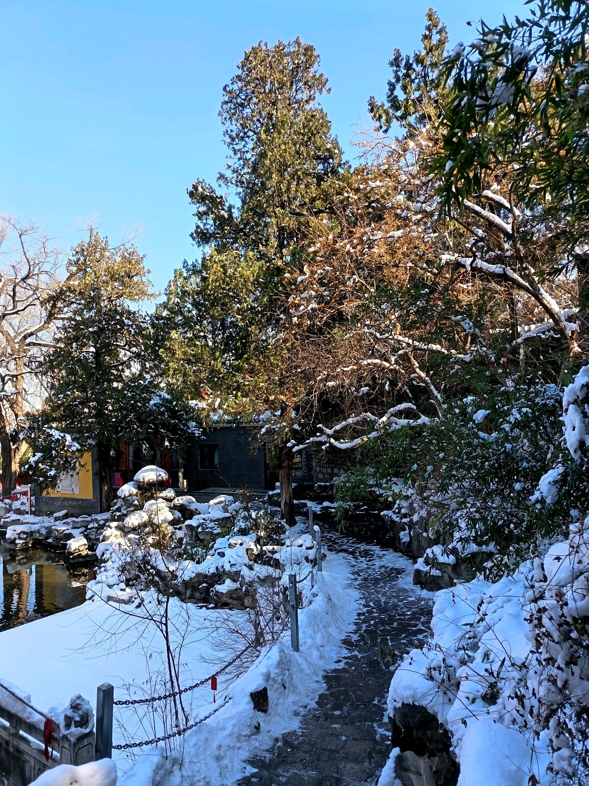 雪后初晴,碧波荡漾,古亭矗立,松柏苍翠。这片静谧的园林,仿佛置身于一幅水墨画中。