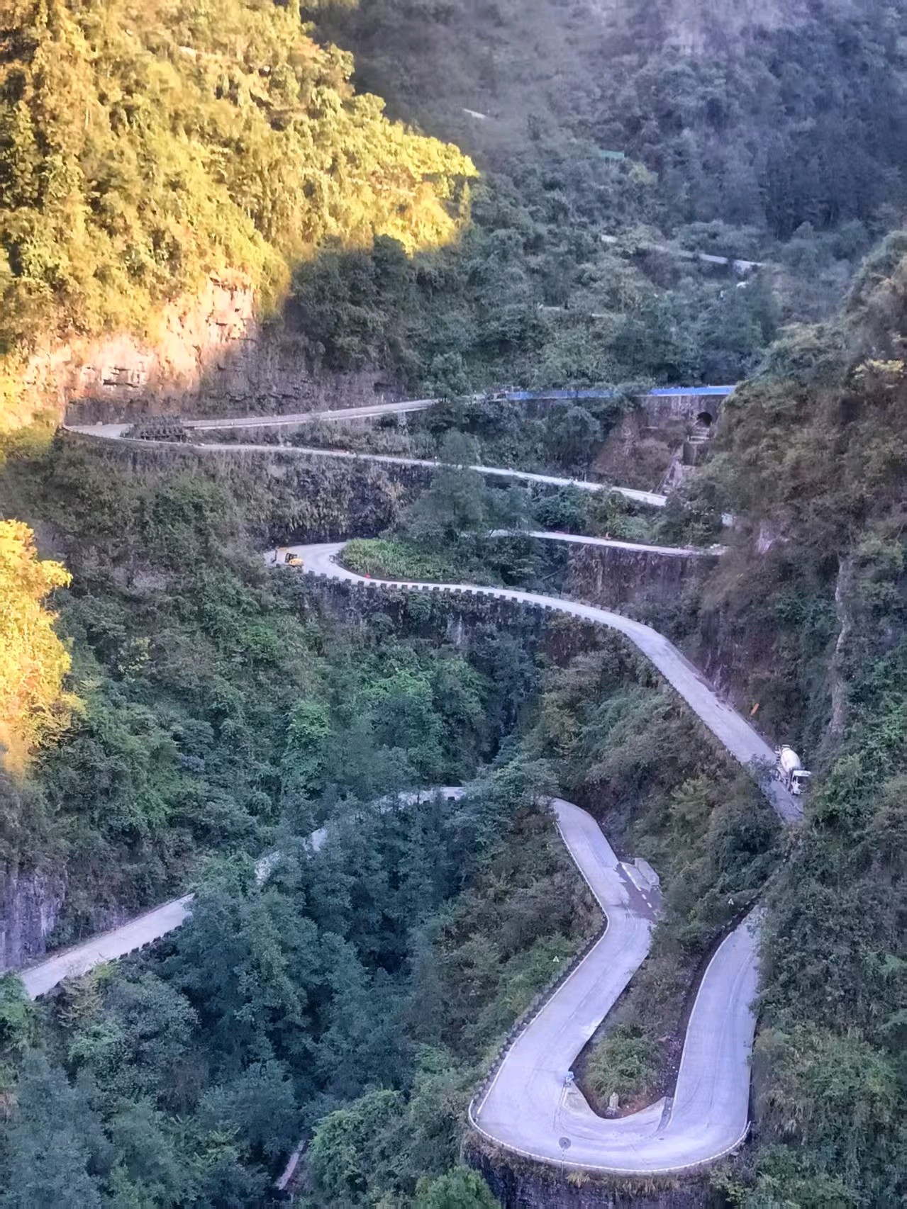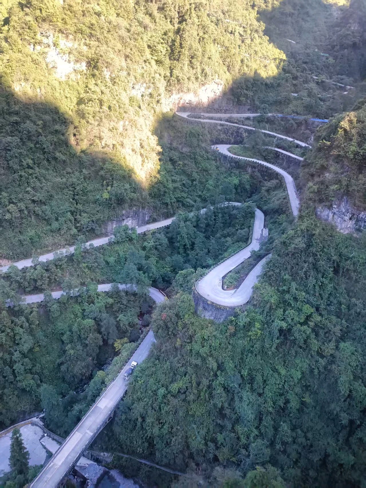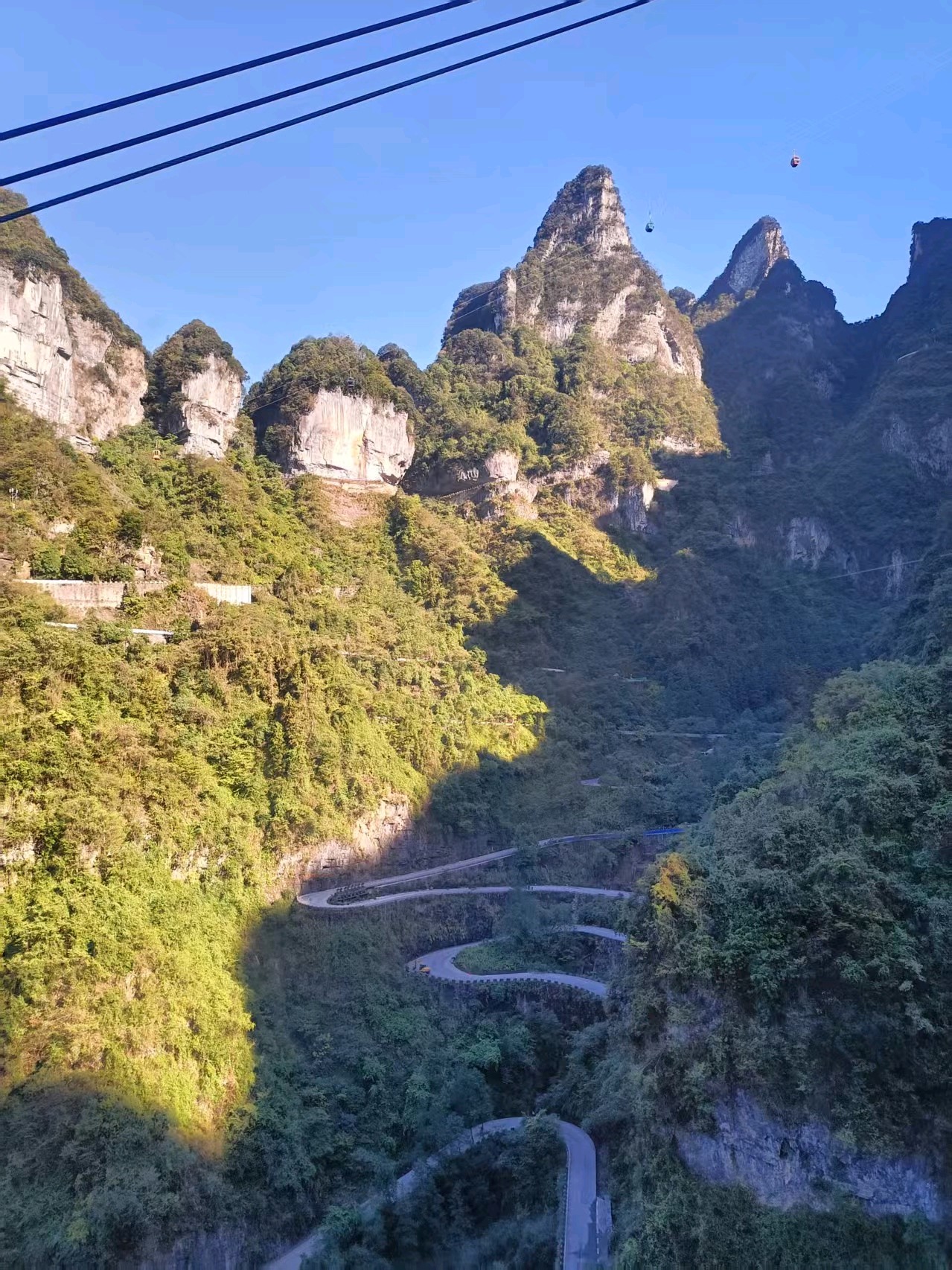 从索道上俯瞰天门山的盘山公路,真是九曲十八弯,道路崎岖弯延,可见当初的施工是多么的艰难,天门山是出奇迹的地方。