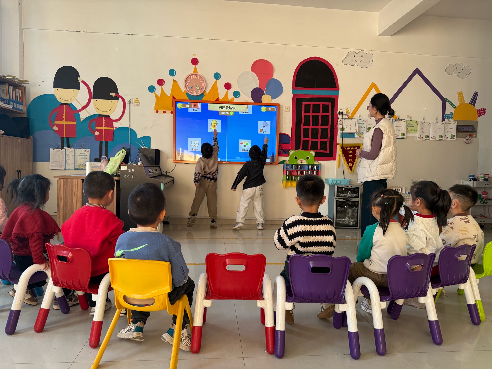 最令人期待的《看谁反应快》垃圾分类游戏环节拉开帷幕。老师将印有各类垃圾图案的卡片分发给孩子们,当“3、2、1”倒计时开始,孩子们迅速辨认并操作。现场气氛热烈,孩子们在紧张又欢乐的游戏中巩固了垃圾分类知识,反应速度和判断能力也得到了锻炼。