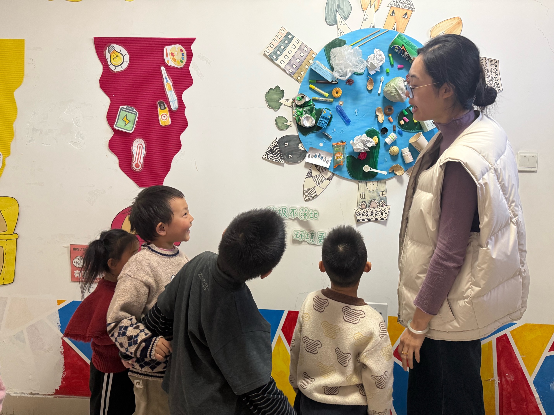 活动伊始,老师带来了四种颜色的分类垃圾桶模型,用生动形象的语言向孩子们讲解不同颜色垃圾桶的用途:蓝色桶是可回收物的“家”,能装废纸、塑料瓶等可循环利用的物品;绿色桶属于厨余垃圾,瓜果皮、剩饭菜都要放进这里;红色桶是有害垃圾的专属“住所”,电池、过期药品等需要妥善投放;灰色桶则收纳其他垃圾。孩子们听得津津有味,纷纷举手抢答老师提出的问题,对分类垃圾桶的认识愈发清晰。