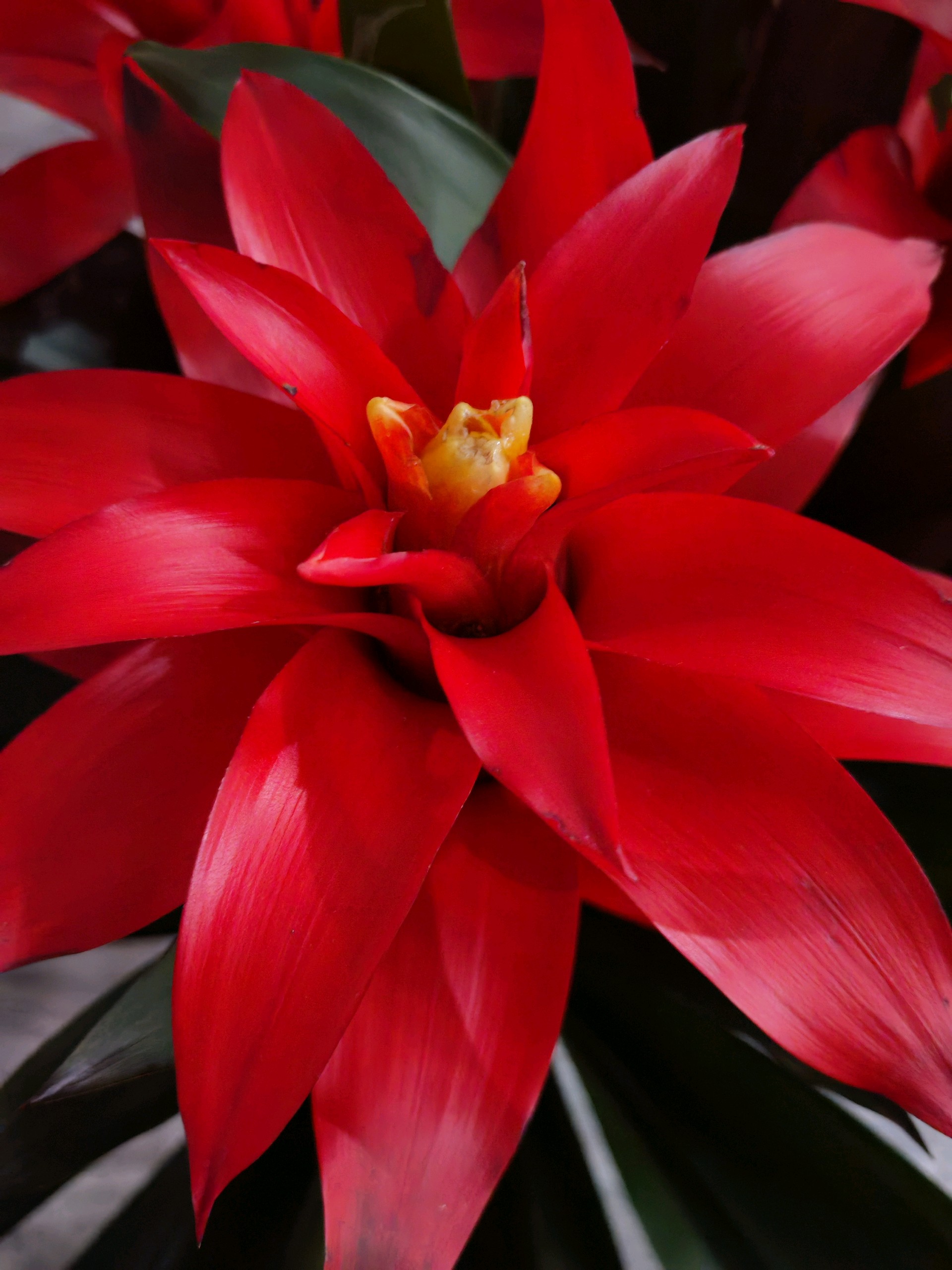 鲜艳的红色花朵绽放着,花瓣层层叠叠,中心是黄色的花蕊,美丽极了!