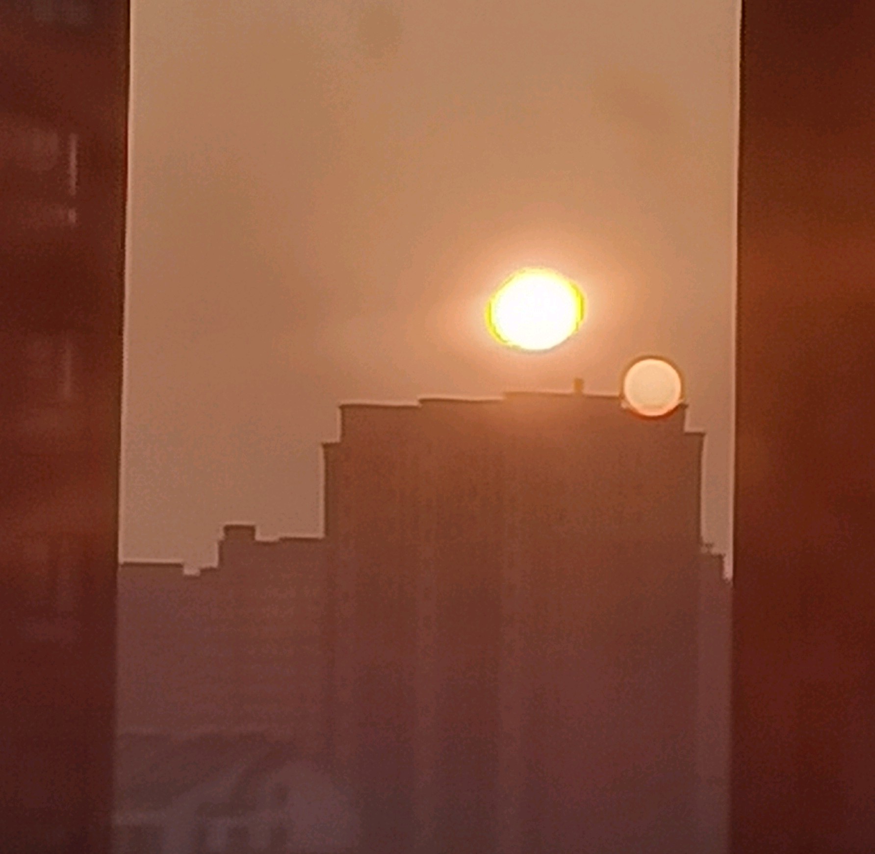 清晨,一轮红日从东方冉冉升起,透过玻璃窗就能感受到它的温暖,玻璃的反光映照了一个小的太阳,好美啊!