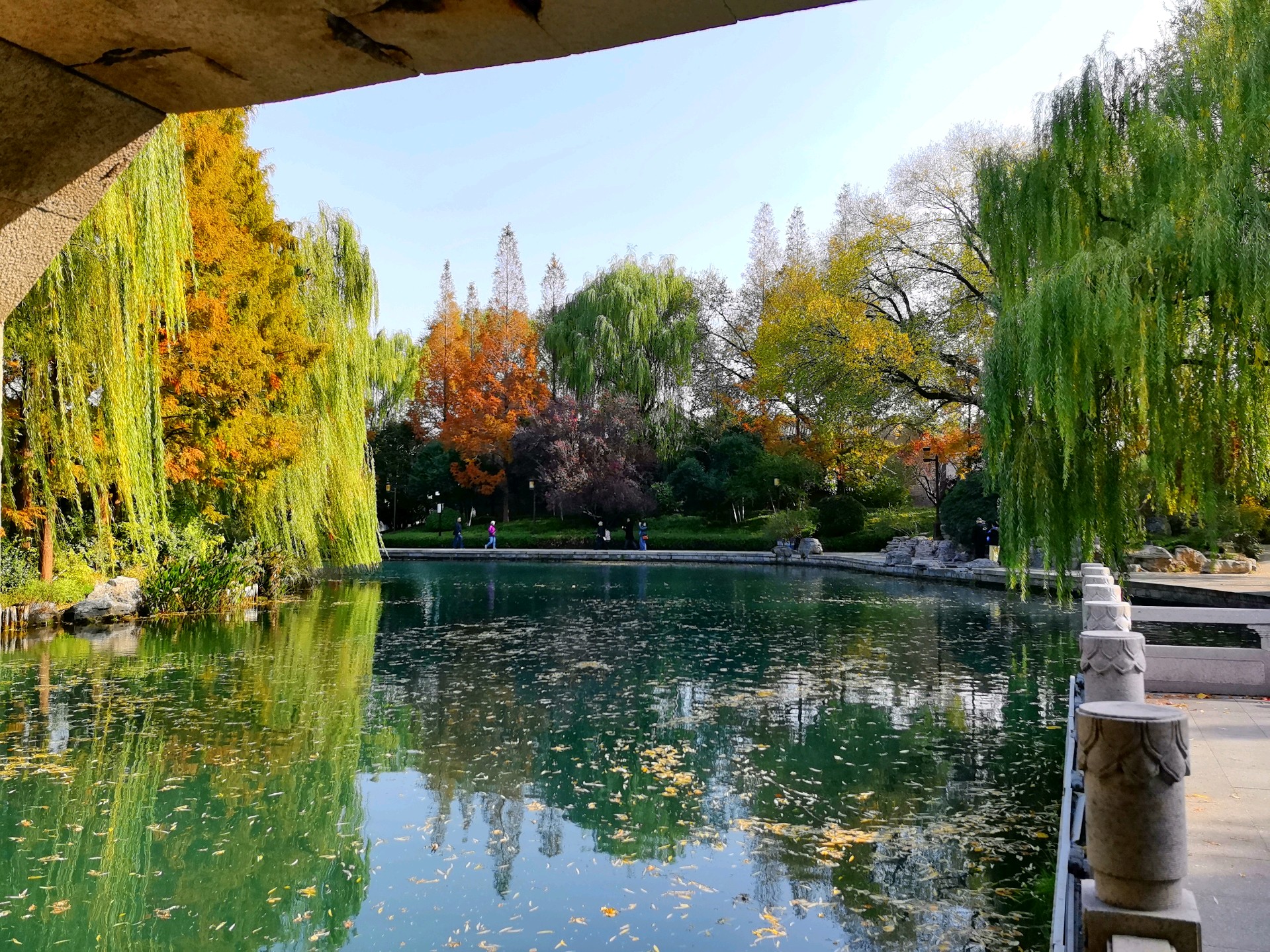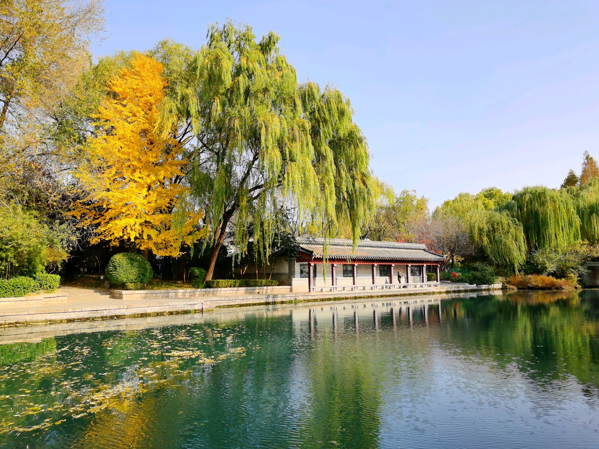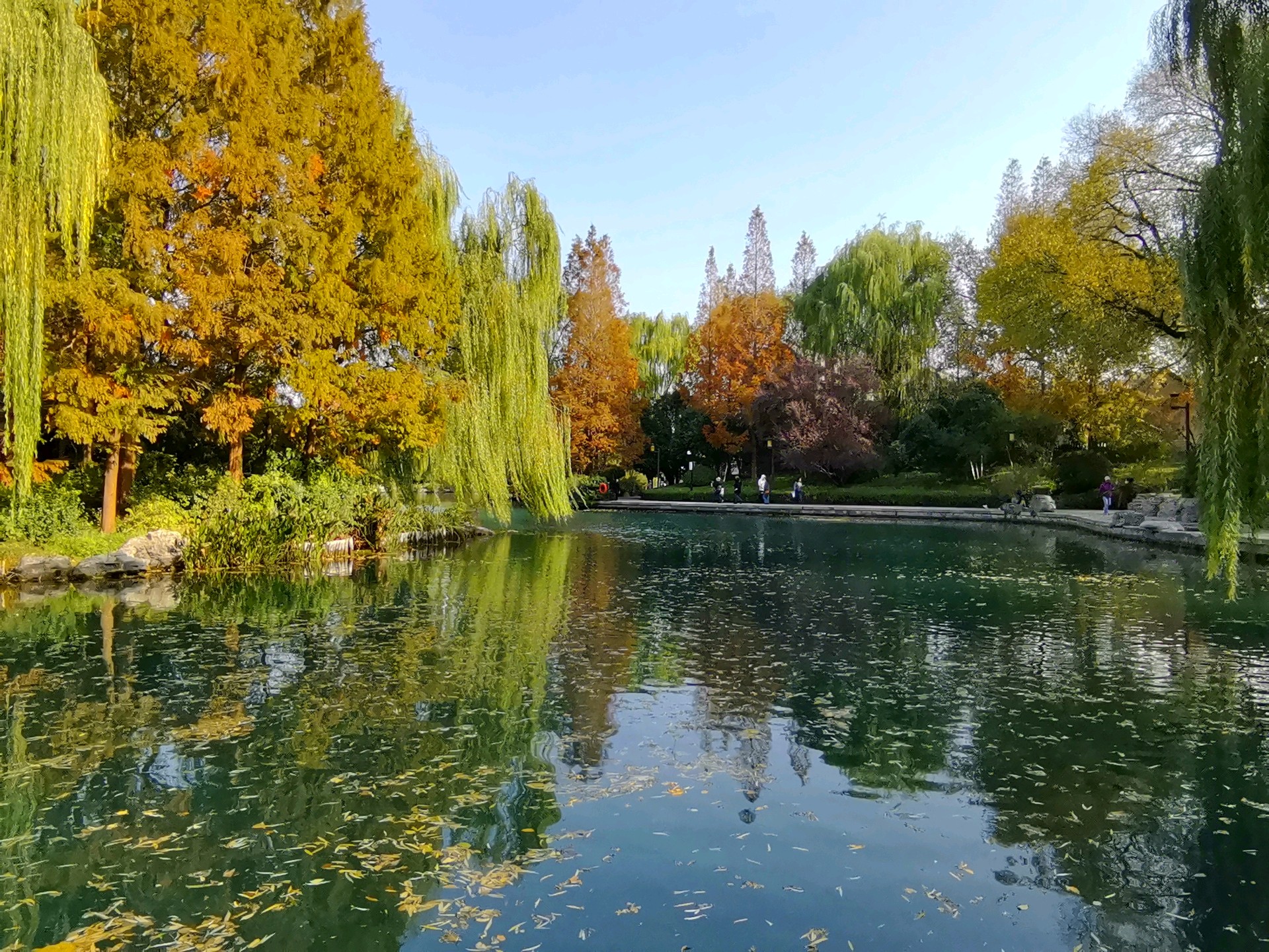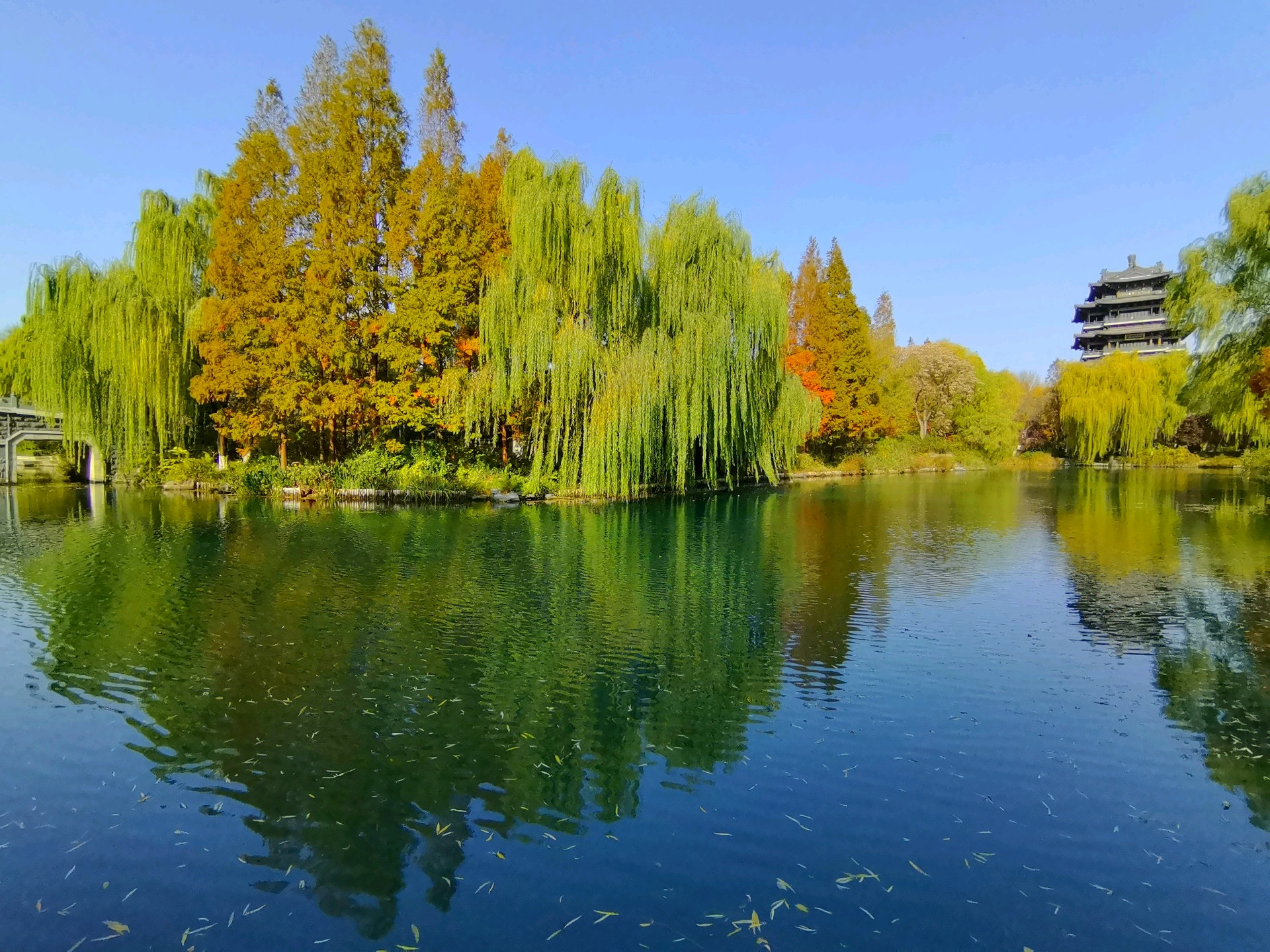 秋日的明湖,别有一番雅致。岸边的垂柳染上浅金,梧桐叶簌簌飘落,铺满青石小径;澄澈的湖水如一块透亮的琉璃,倒映着超然楼的飞檐翘角与天边的流云。夕阳西下时,金辉洒满湖面,波光粼粼,恍若一幅流动的丹青。