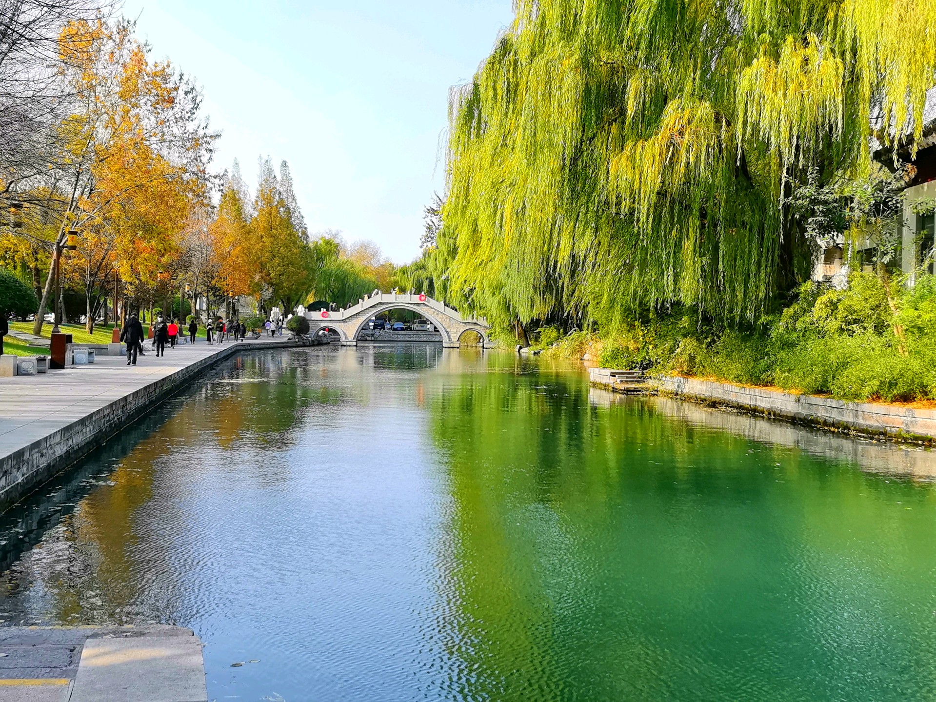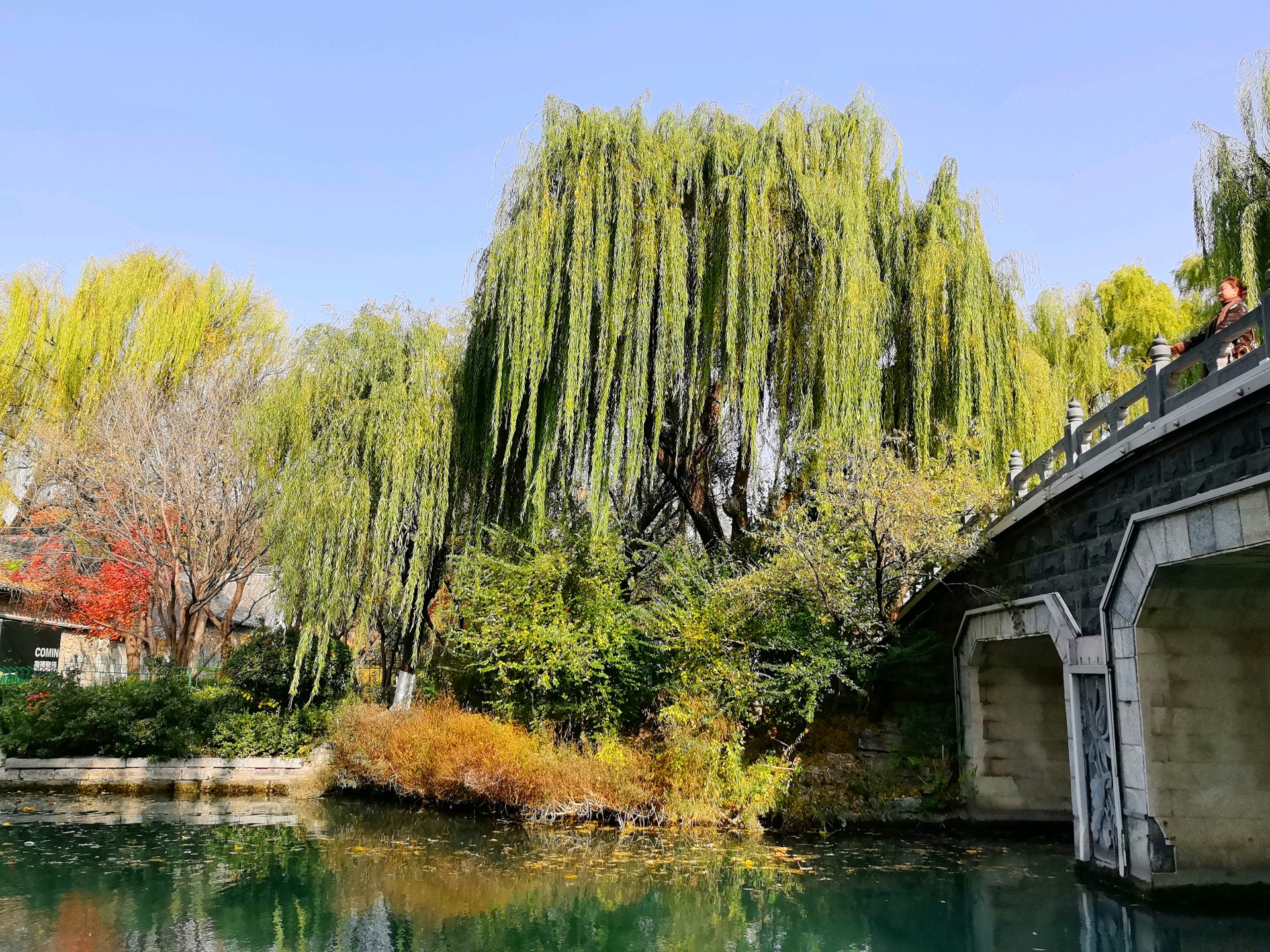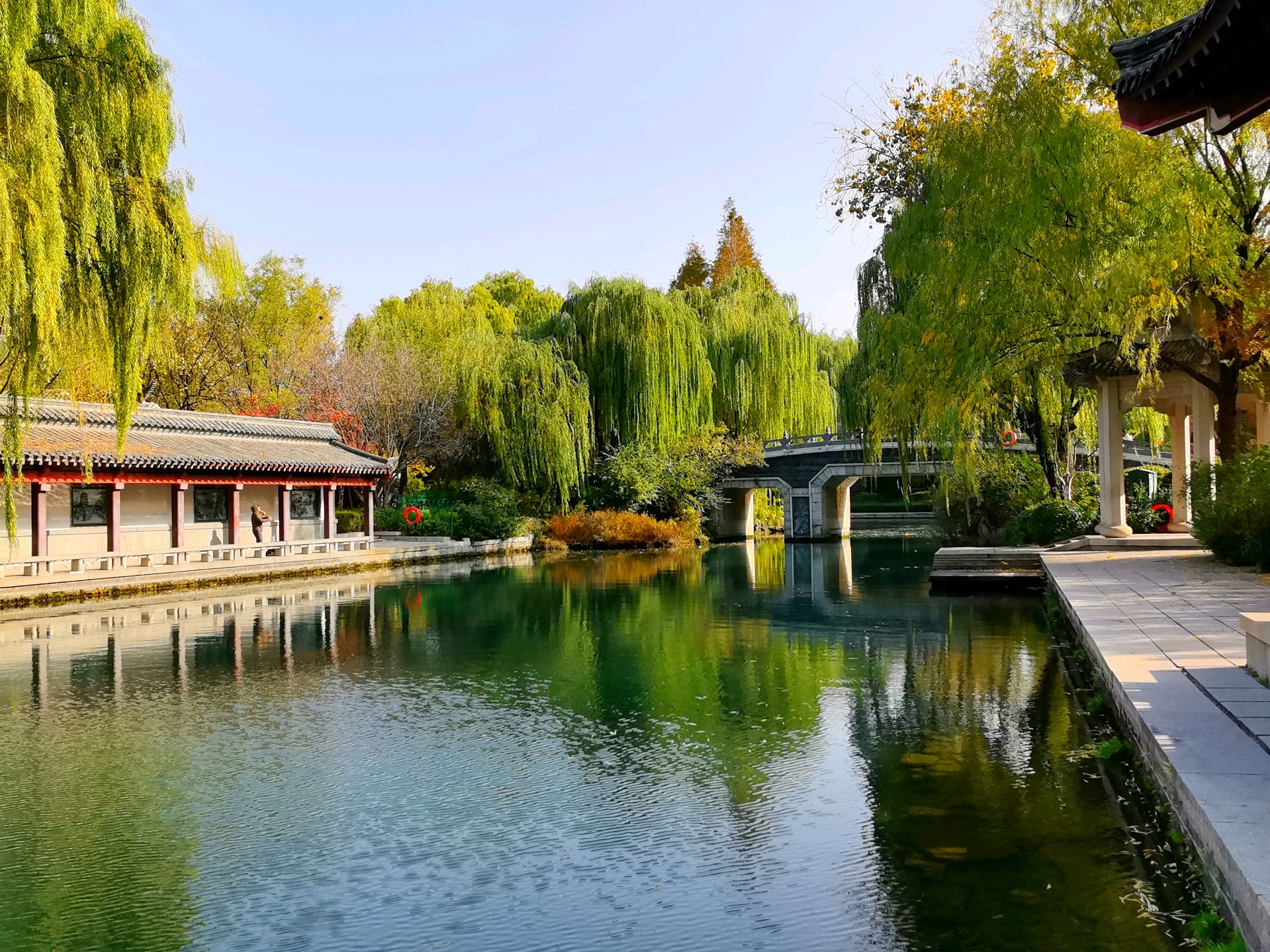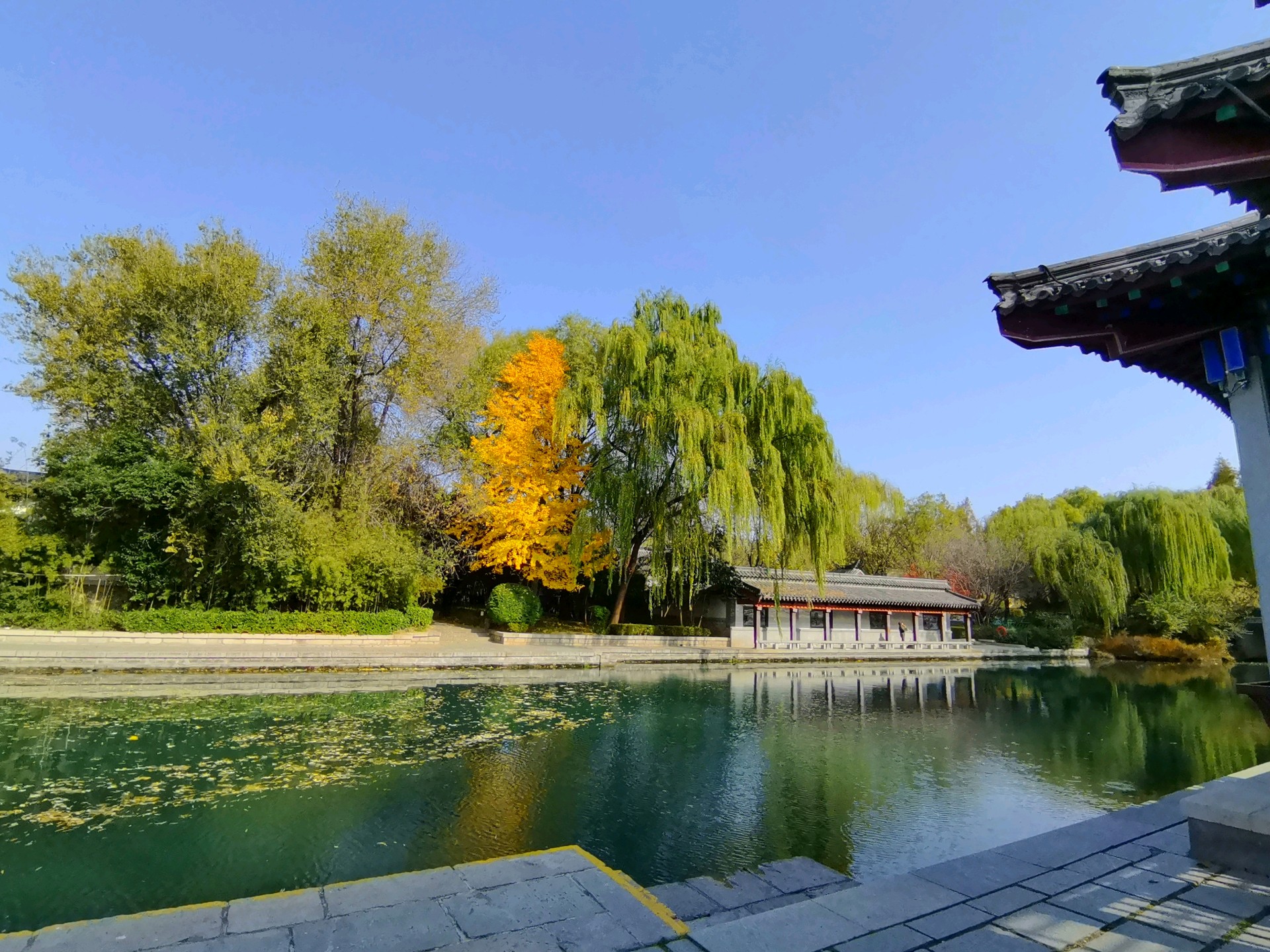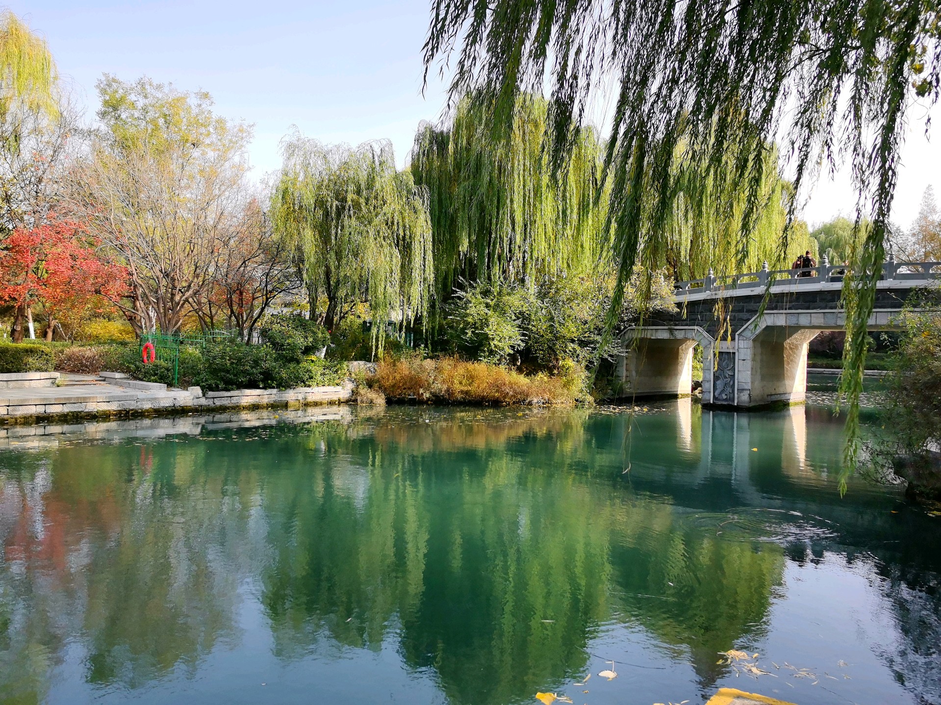 秋日的明湖,别有一番雅致。岸边的垂柳染上浅金,梧桐叶簌簌飘落,铺满青石小径;澄澈的湖水如一块透亮的琉璃,倒映着超然楼的飞檐翘角与天边的流云。夕阳西下时,金辉洒满湖面,波光粼粼,恍若一幅流动的丹青。