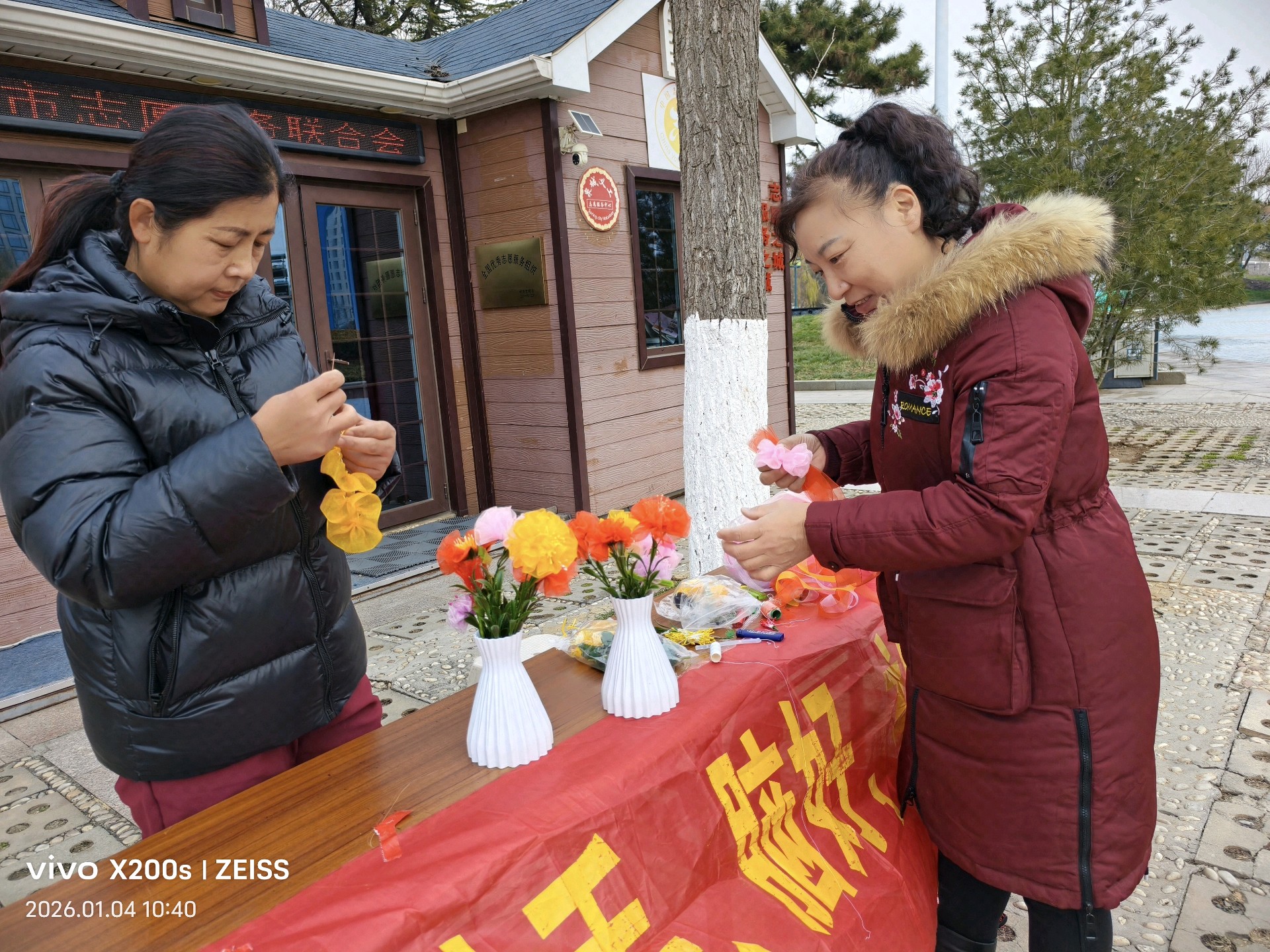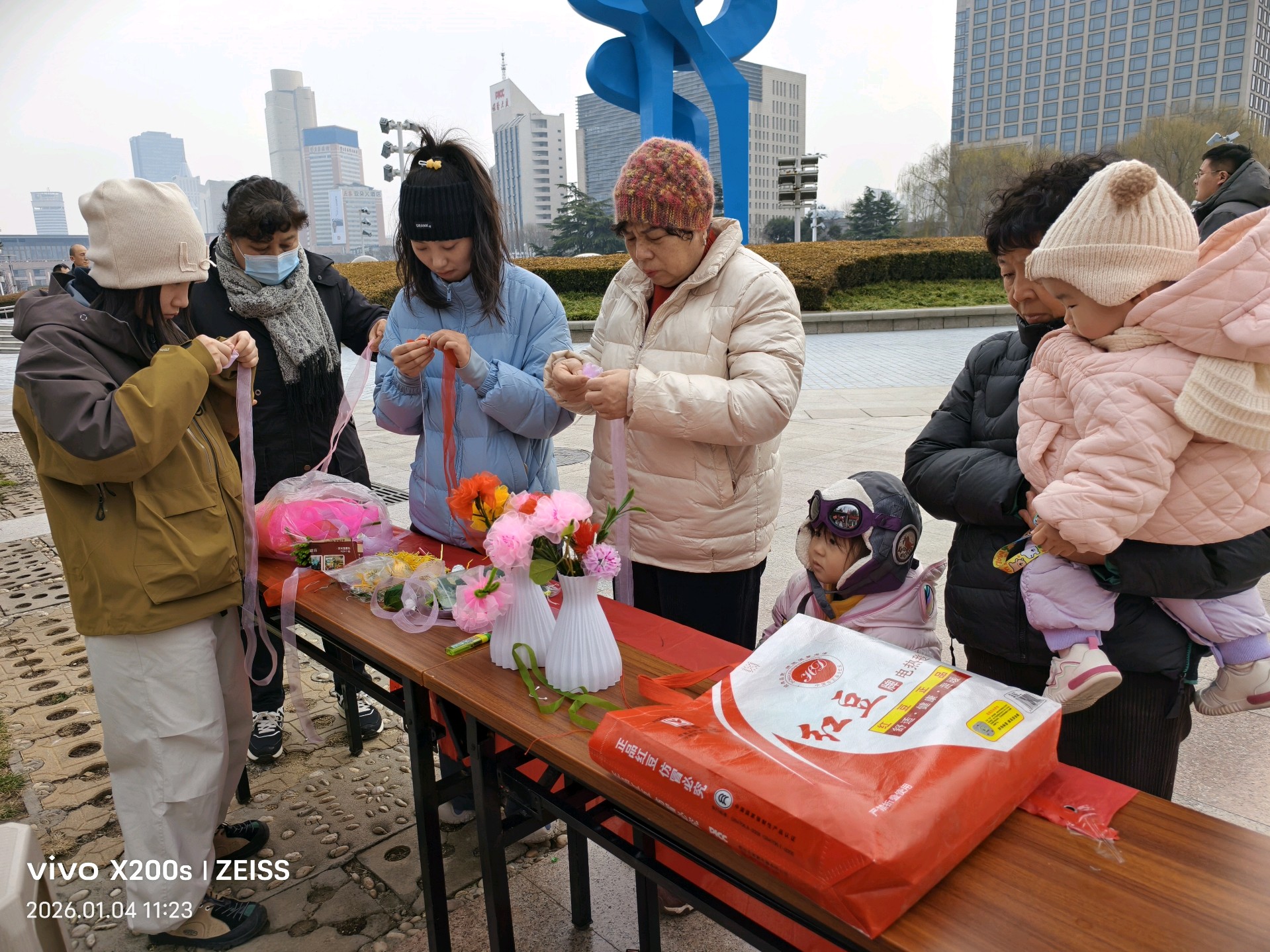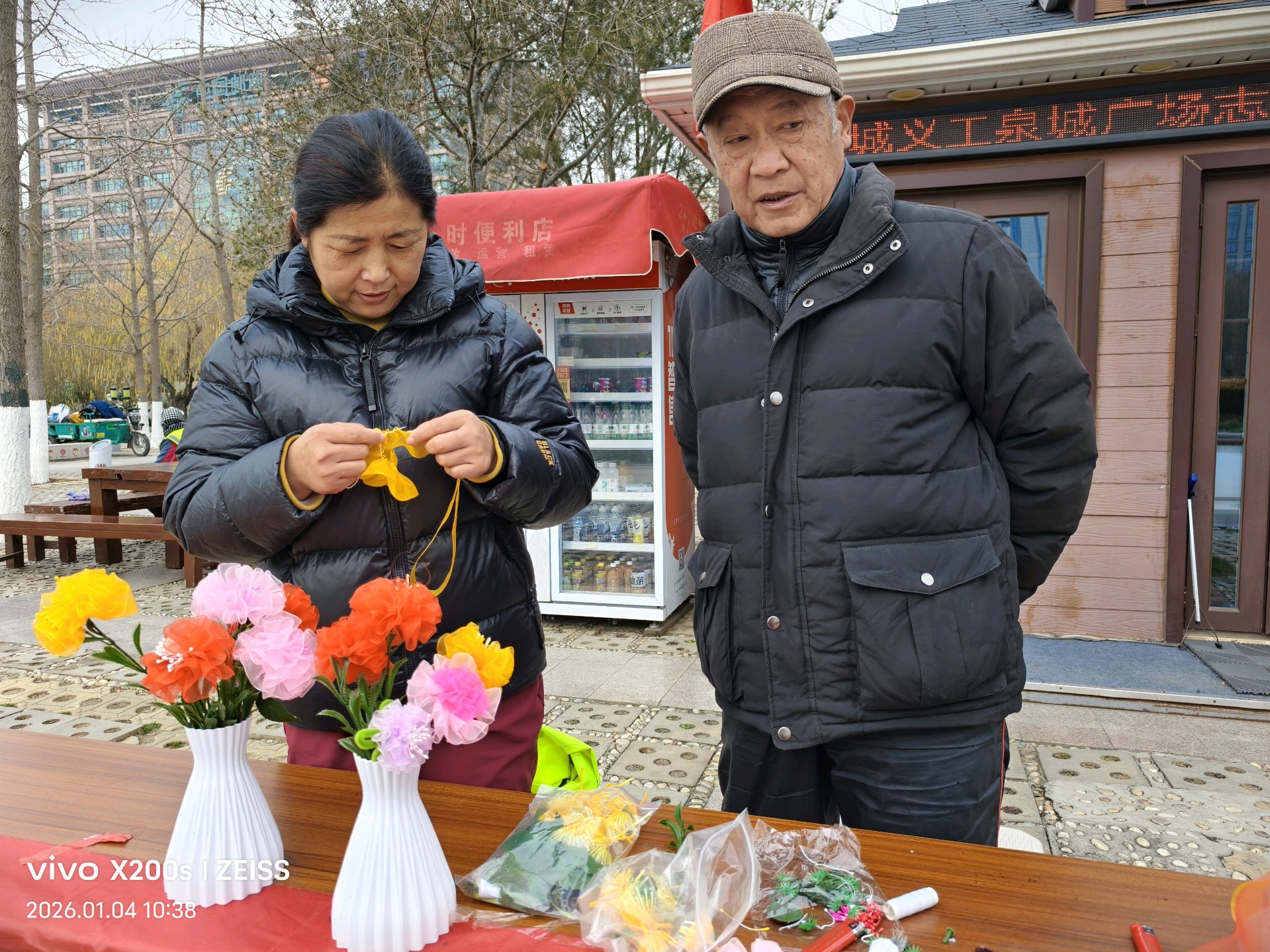 十佳泉城义工魏喜菊和马新华也来到现场,他们指导大家做绢花,俩位外地女大学生很快做成绢花,无比兴福,拍照留念;几位老人,完成第一朵作品时,脸上绽放的成就感和满足笑容,便是冬日里最暖的风景。