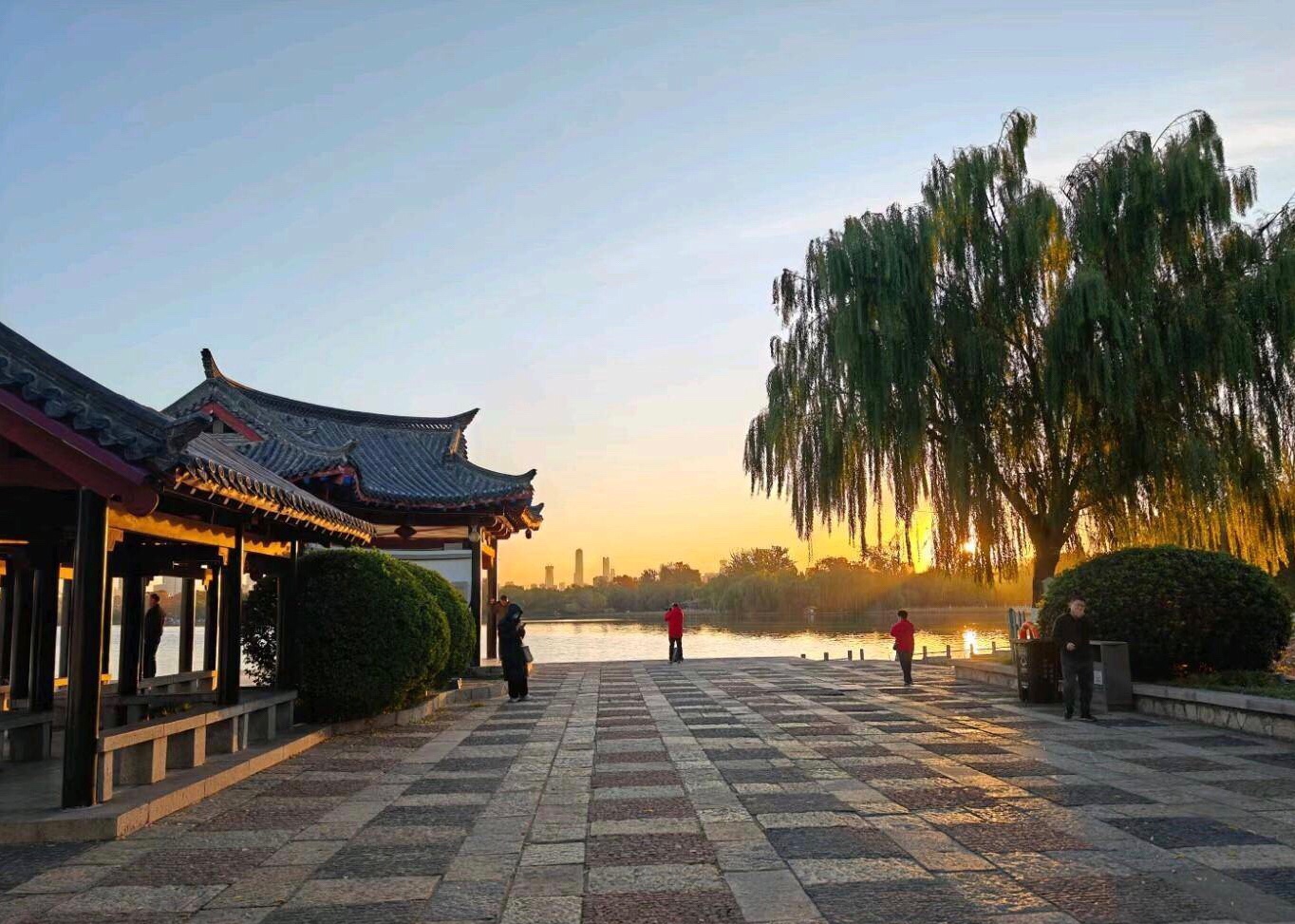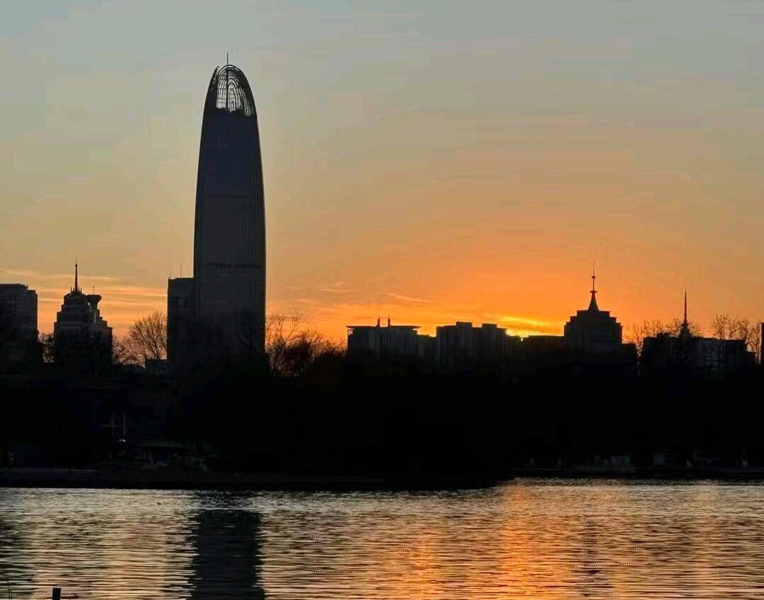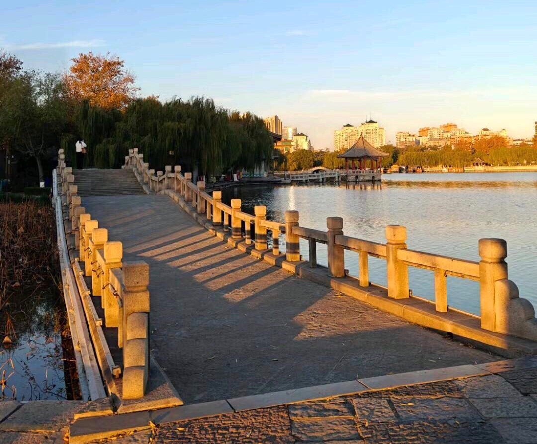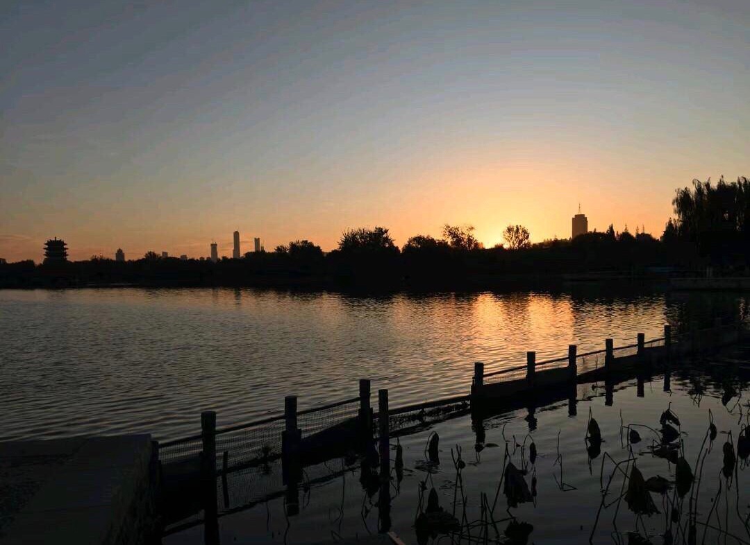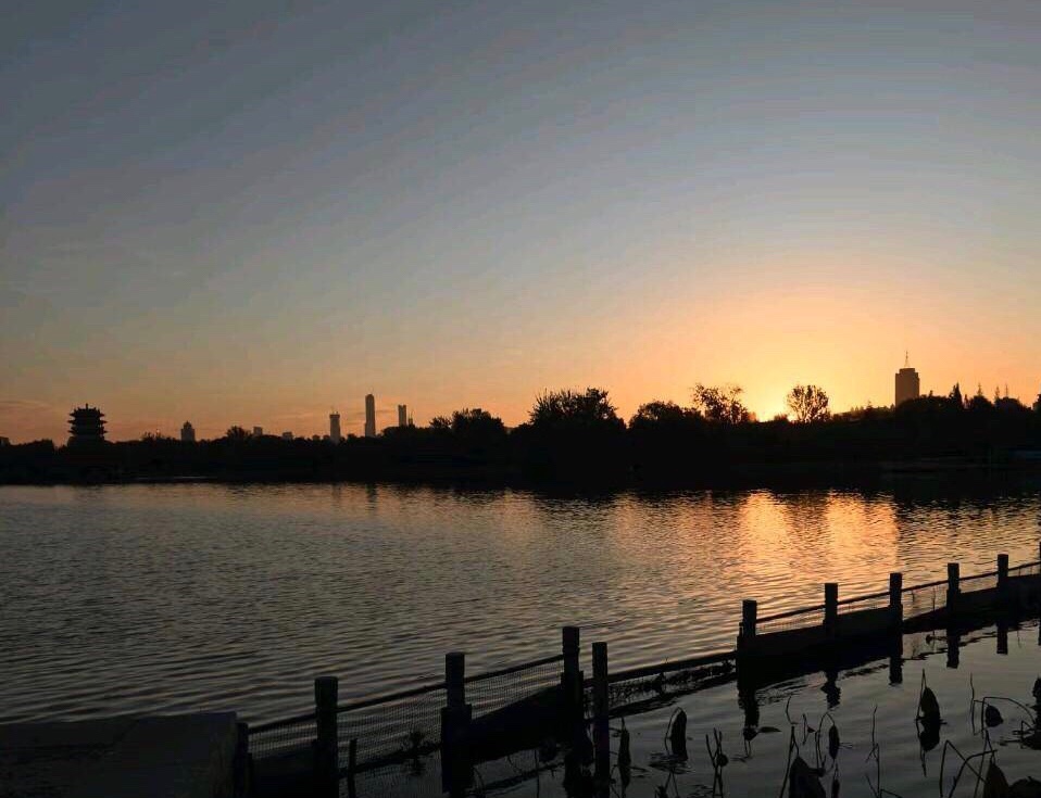 落日把金辉泼在大明湖的波心上,粼粼碎光随涟漪漫开,岸边的垂柳披着薄金,与水中的倒影相拥成一幅温柔的画。