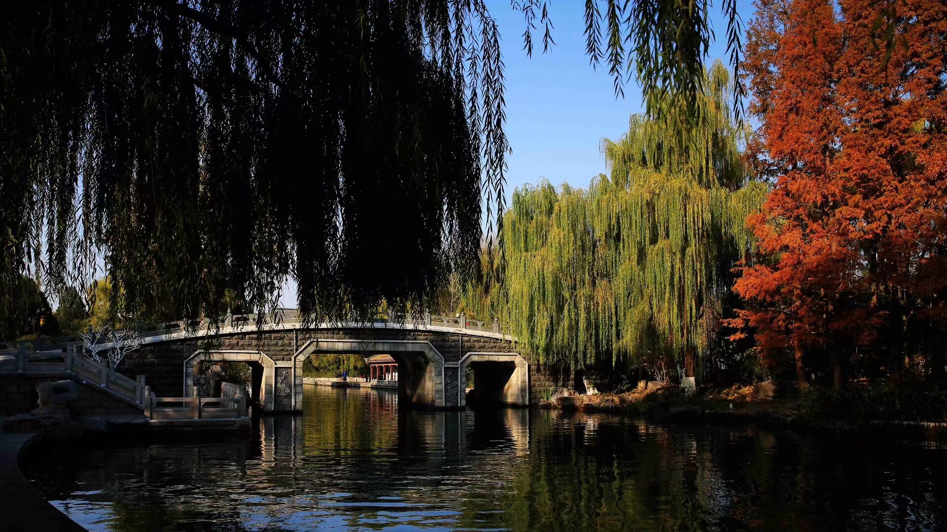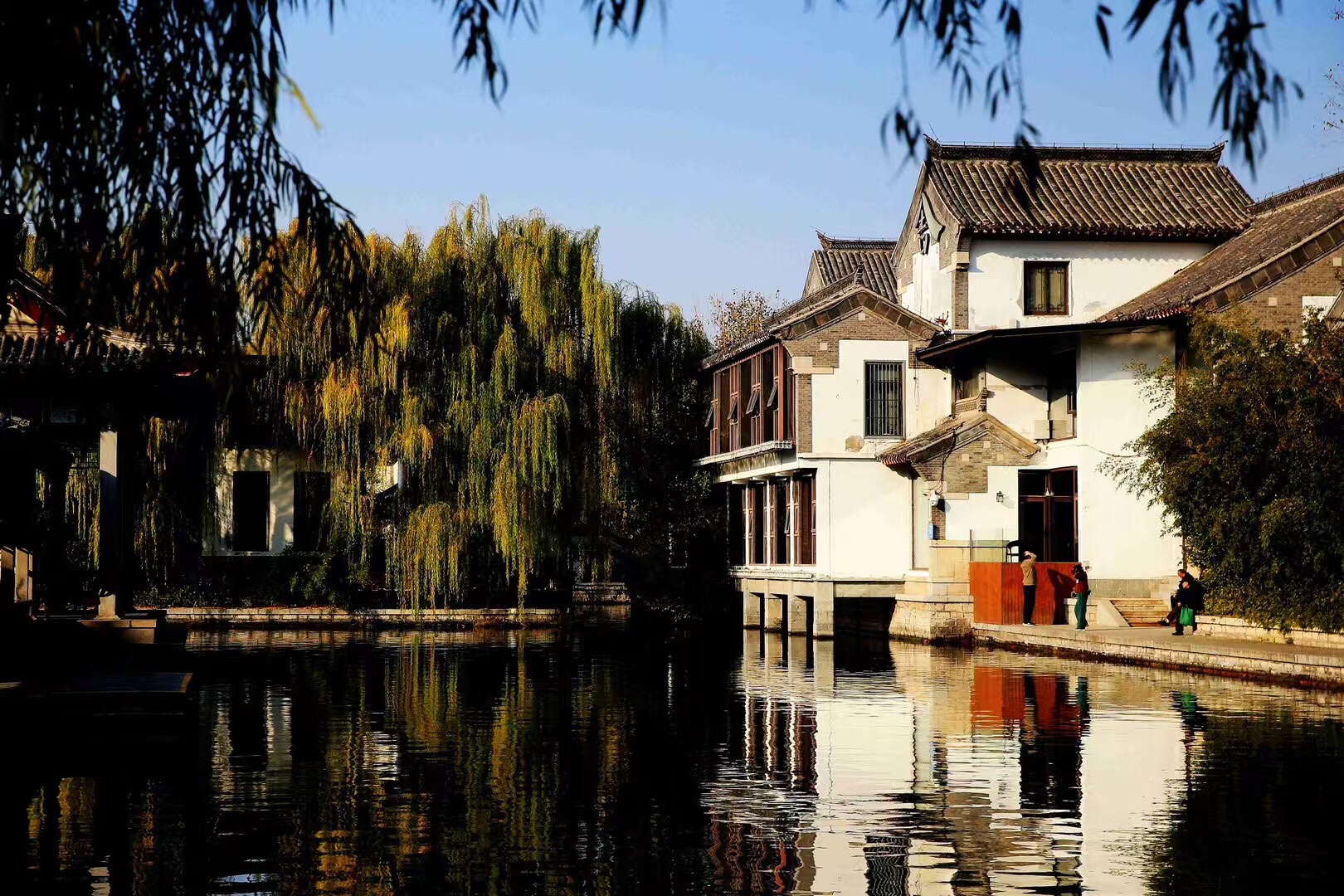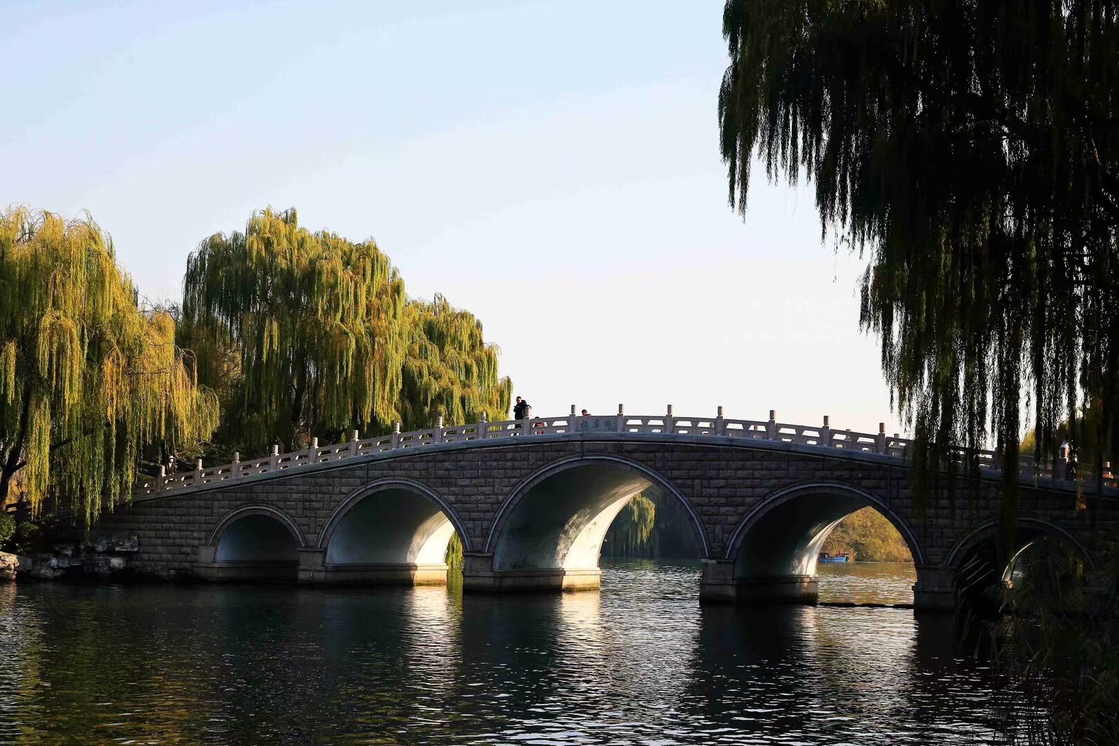 落日把金辉泼在大明湖的波心上,粼粼碎光随涟漪漫开,岸边的垂柳披着薄金,与水中的倒影相拥成一幅温柔的画。