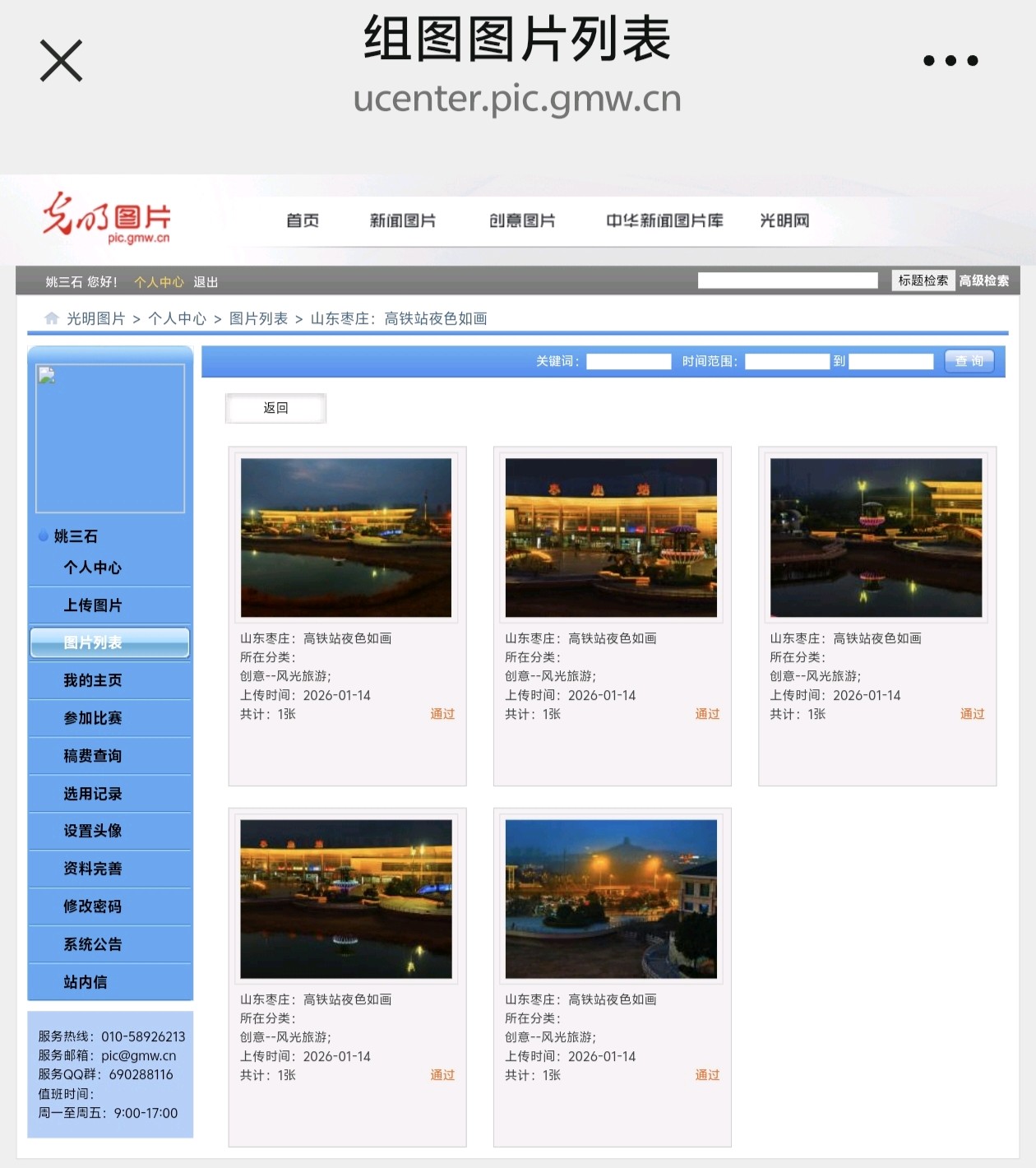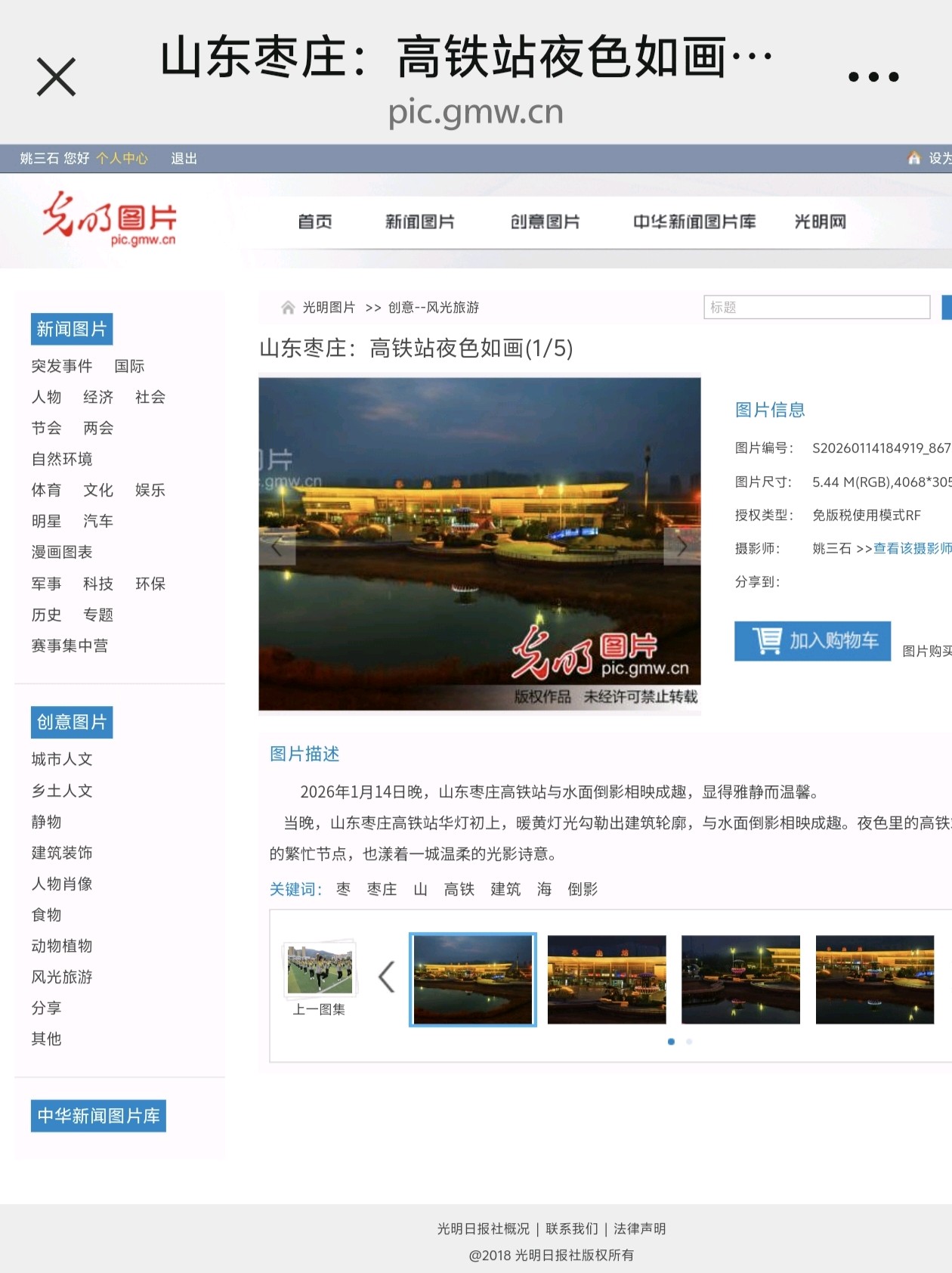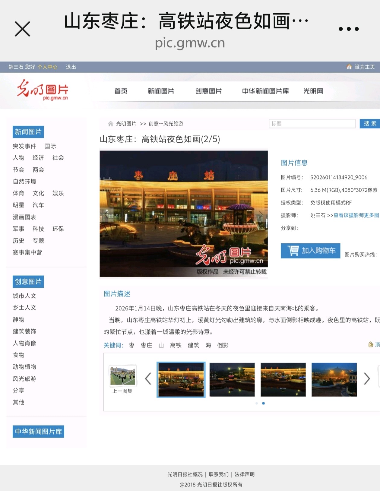 光明网发表姚三石摄影新闻1月14日,光明网发表光明网签约摄影师,人民网签约摄影师,中国书画艺术网艺术顾问,山东省摄影家协会会员姚三石摄影新闻作品《山东枣庄:高铁站夜色如画》(组图5幅)。山东枣庄:高铁站夜色如画2026年1月14日晚,山东枣庄高铁站华灯初上,暖黄灯光勾勒出建筑轮廓,与水面倒影相映成趣。夜色里的高铁站,既是交通枢纽的繁忙节点,也漾着一城温柔的光影诗意。(姚三石 摄影)