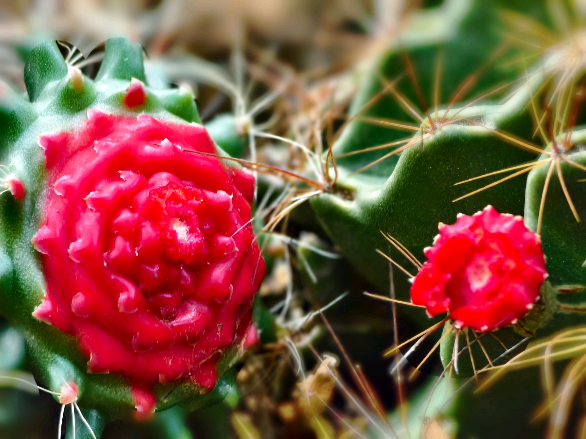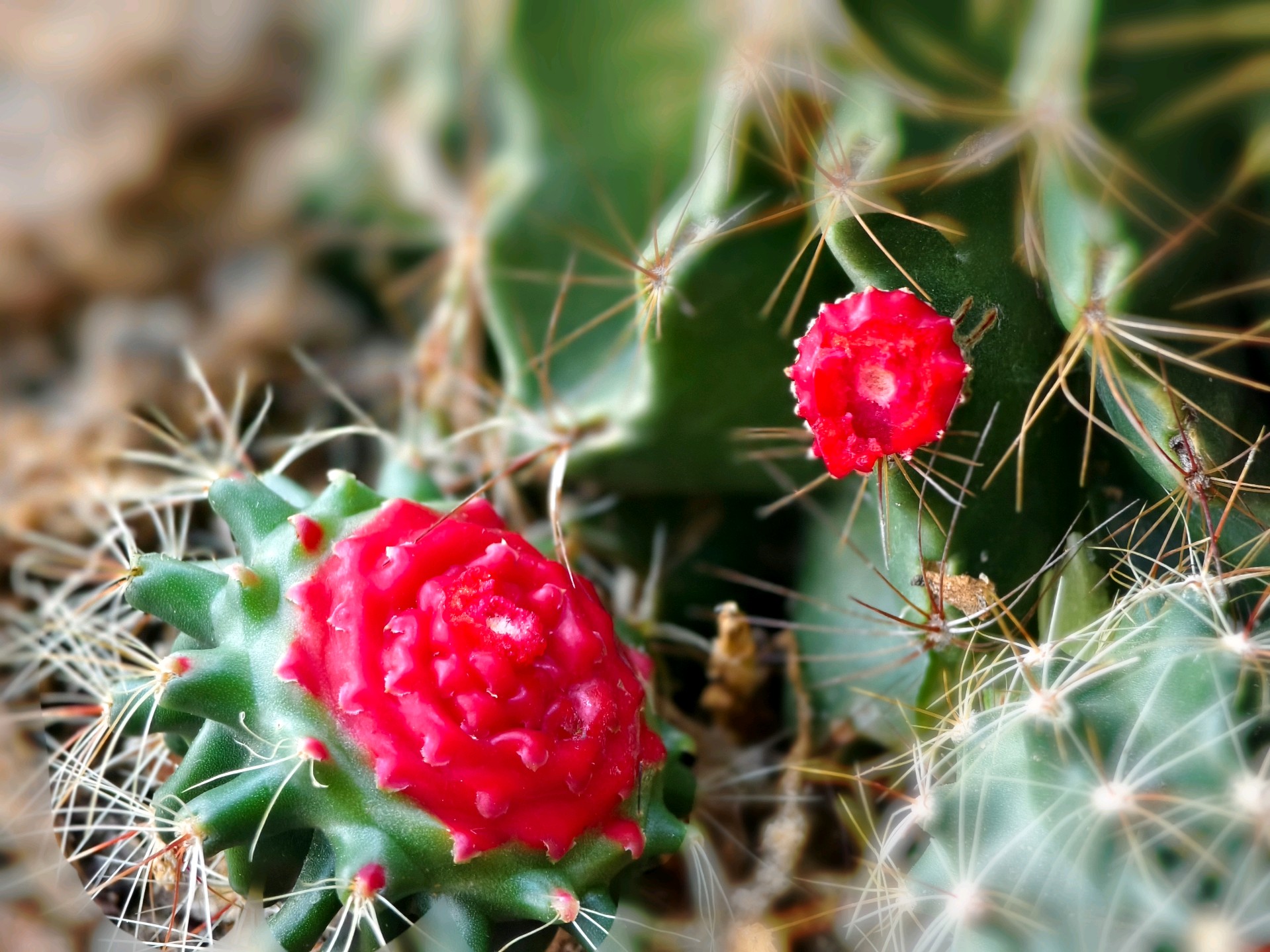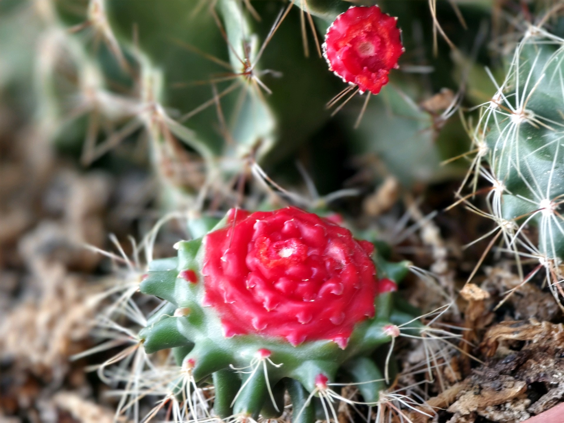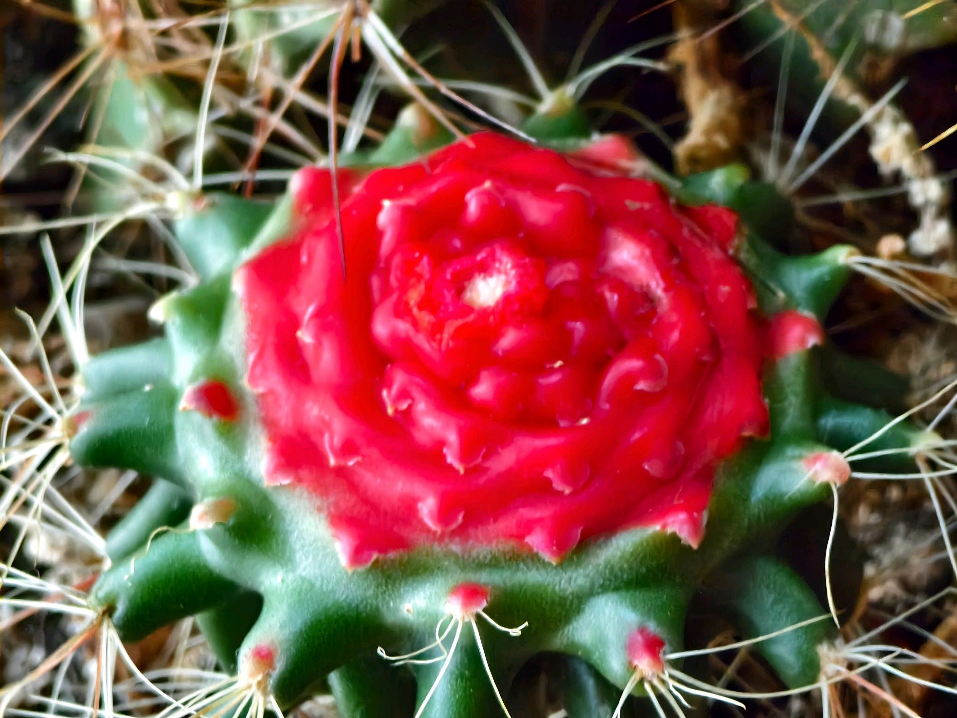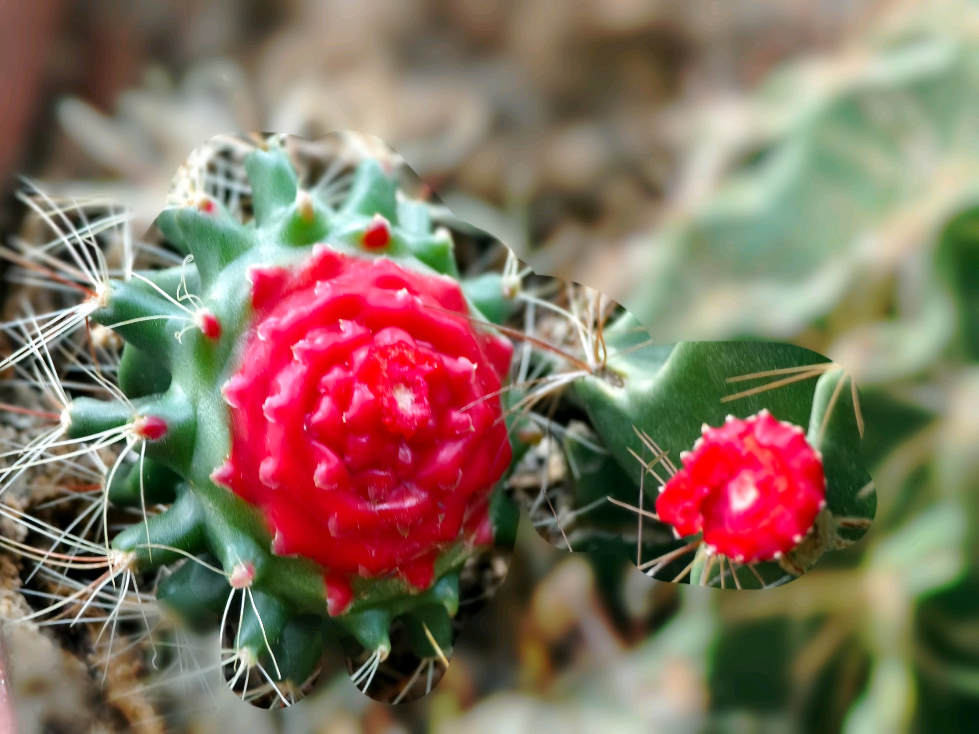 家里养的仙人球,好长时间也没浇水了。今天把它两个崽给掰掉一个,一看仙人球鲜红的伤口貌似“出血”了,像花又像点的胭脂,好像有灵气似的疼。经查有关资料,原来是由于组织损伤、脱水应激或感染引起的。这是植物自我保护的正常现象。拍摄于蓬莱家中