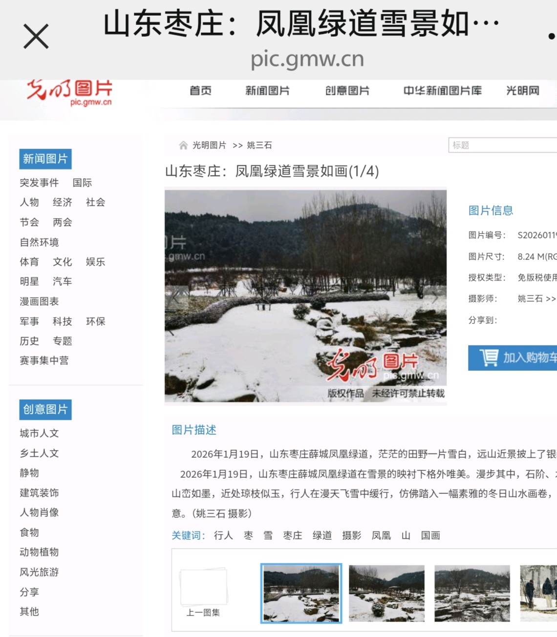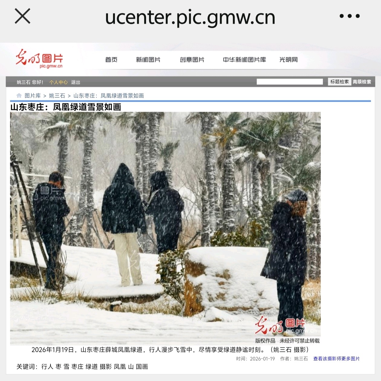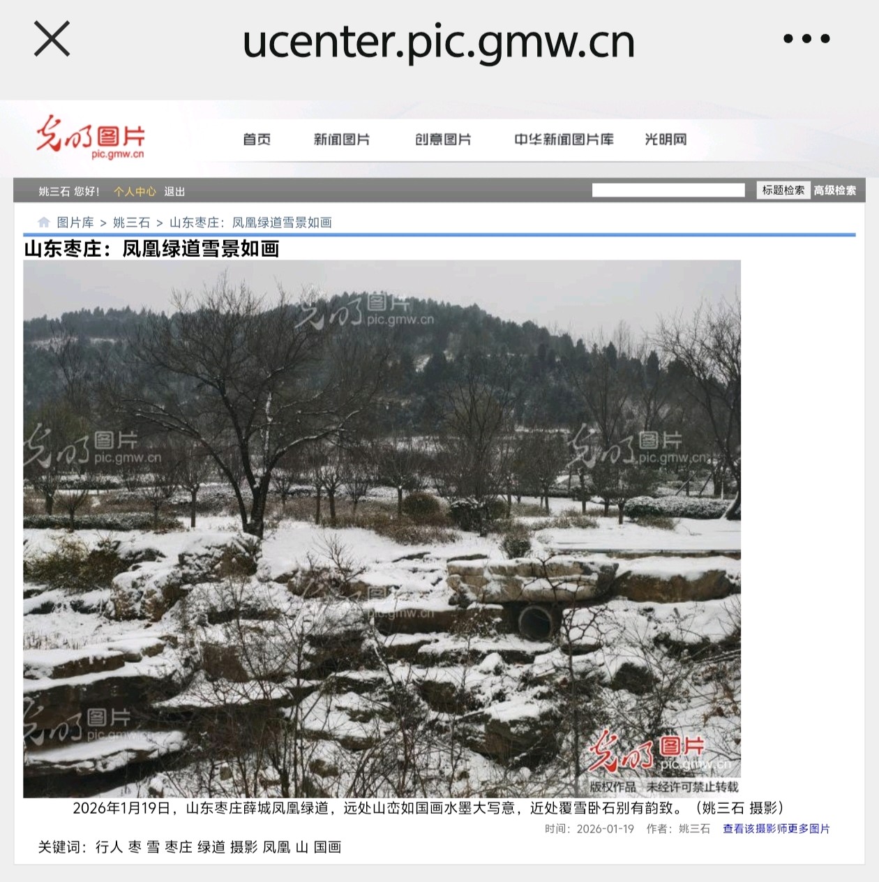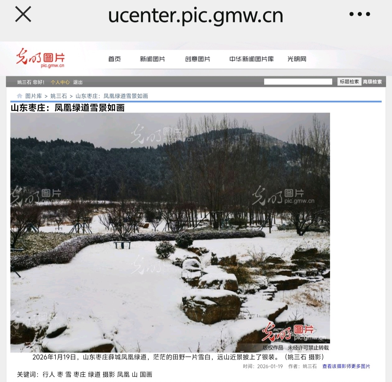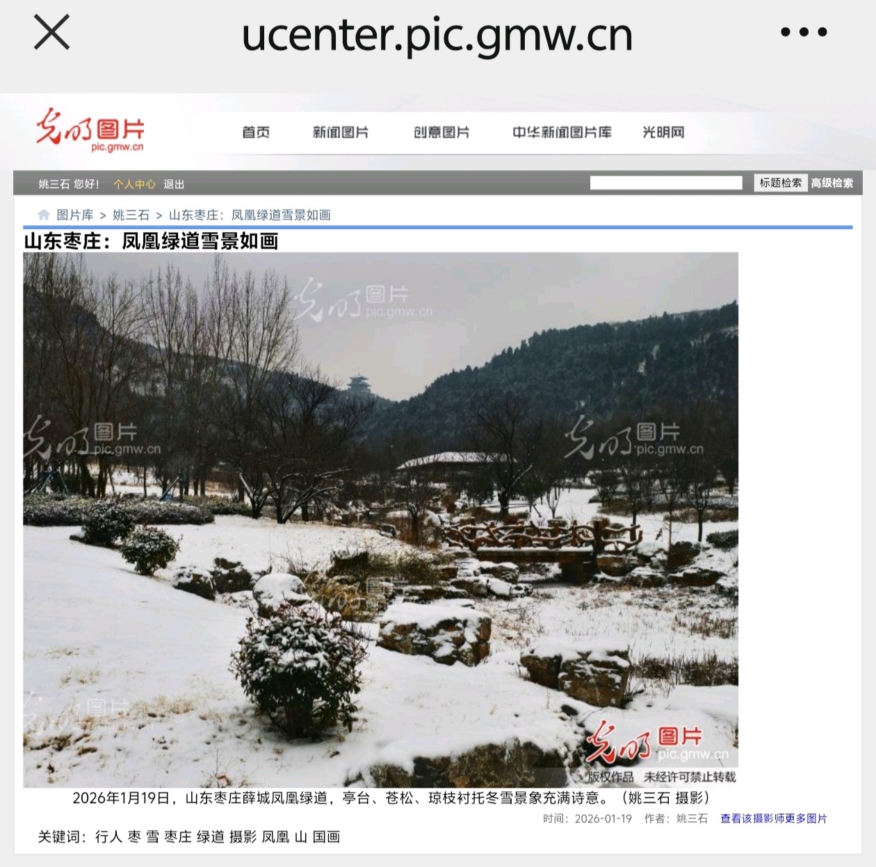 光明网发表姚三石摄影新闻《山东枣庄:凤凰绿道雪景如画》1月20日,光明网发表光明网签约摄影师,山东省摄影家协会会员姚三石摄影新闻作品《山东枣庄:凤凰绿道雪景如画》(组图4幅)山东枣庄:凤凰绿道雪景如画2026年1月19日,山东枣庄薛城凤凰绿道在雪景的映衬下格外唯美。漫步其中,石阶、木桥与亭台被白雪轻覆,远处山峦如墨,近处琼枝似玉,行人在漫天飞雪中缓行,仿佛踏入一幅素雅的冬日山水画卷,尽显鲁南生态廊道的静谧诗意。(姚三石 摄影)