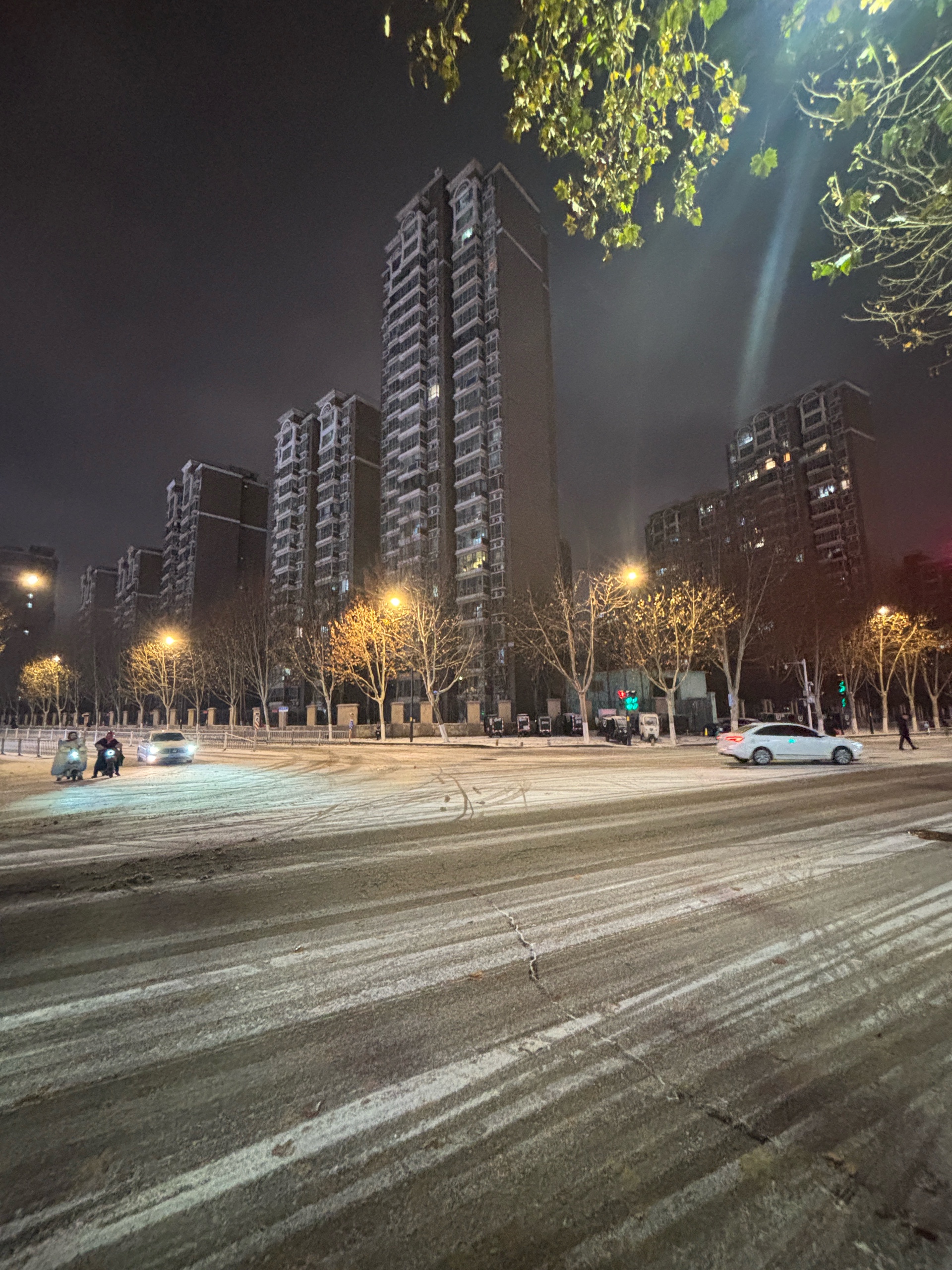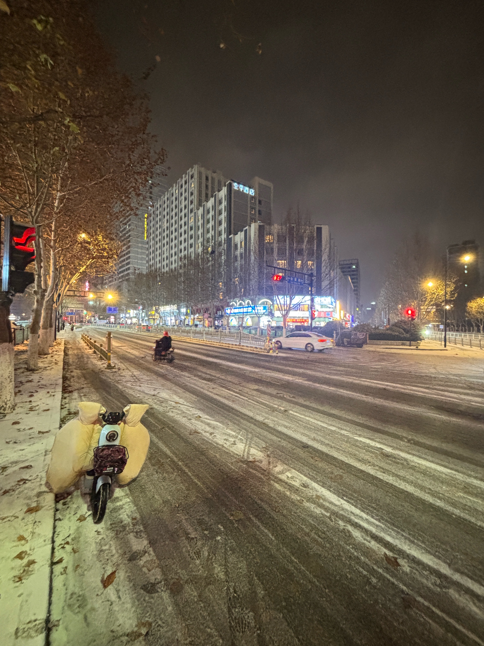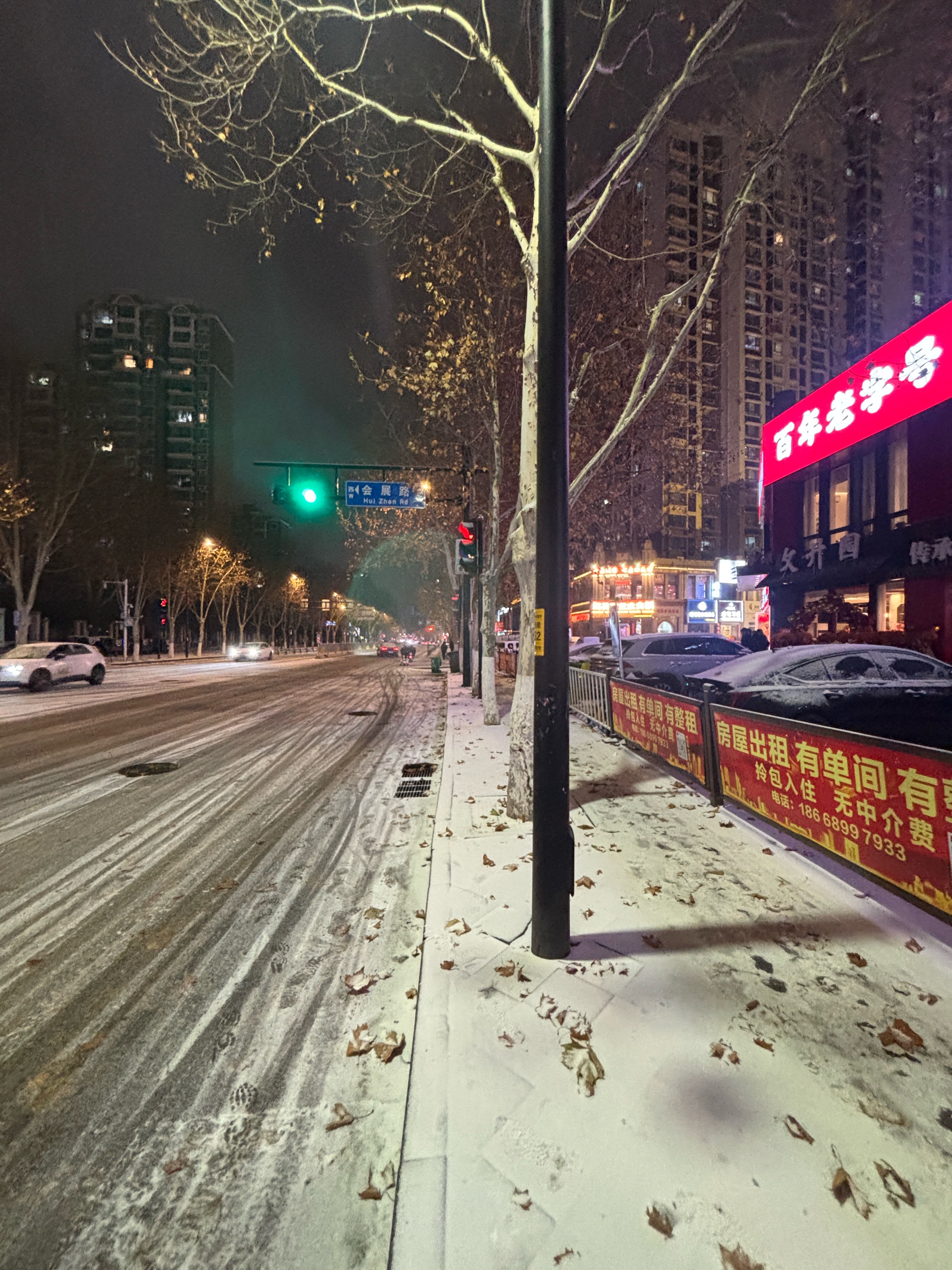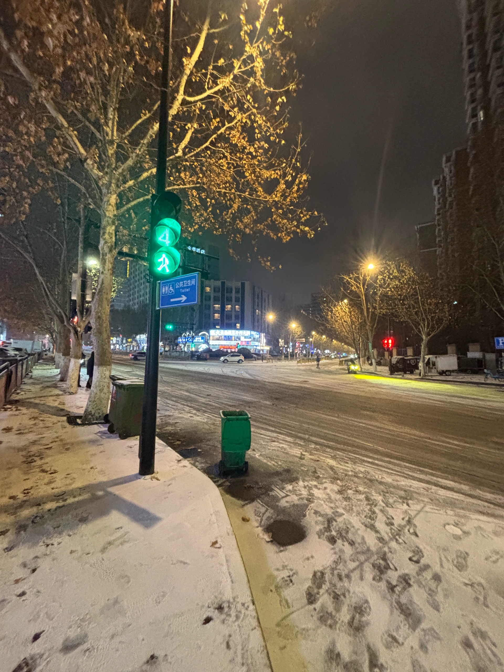 雪夜静谧,绿红交替,人行道旁的垃圾桶守护着城市的清洁。