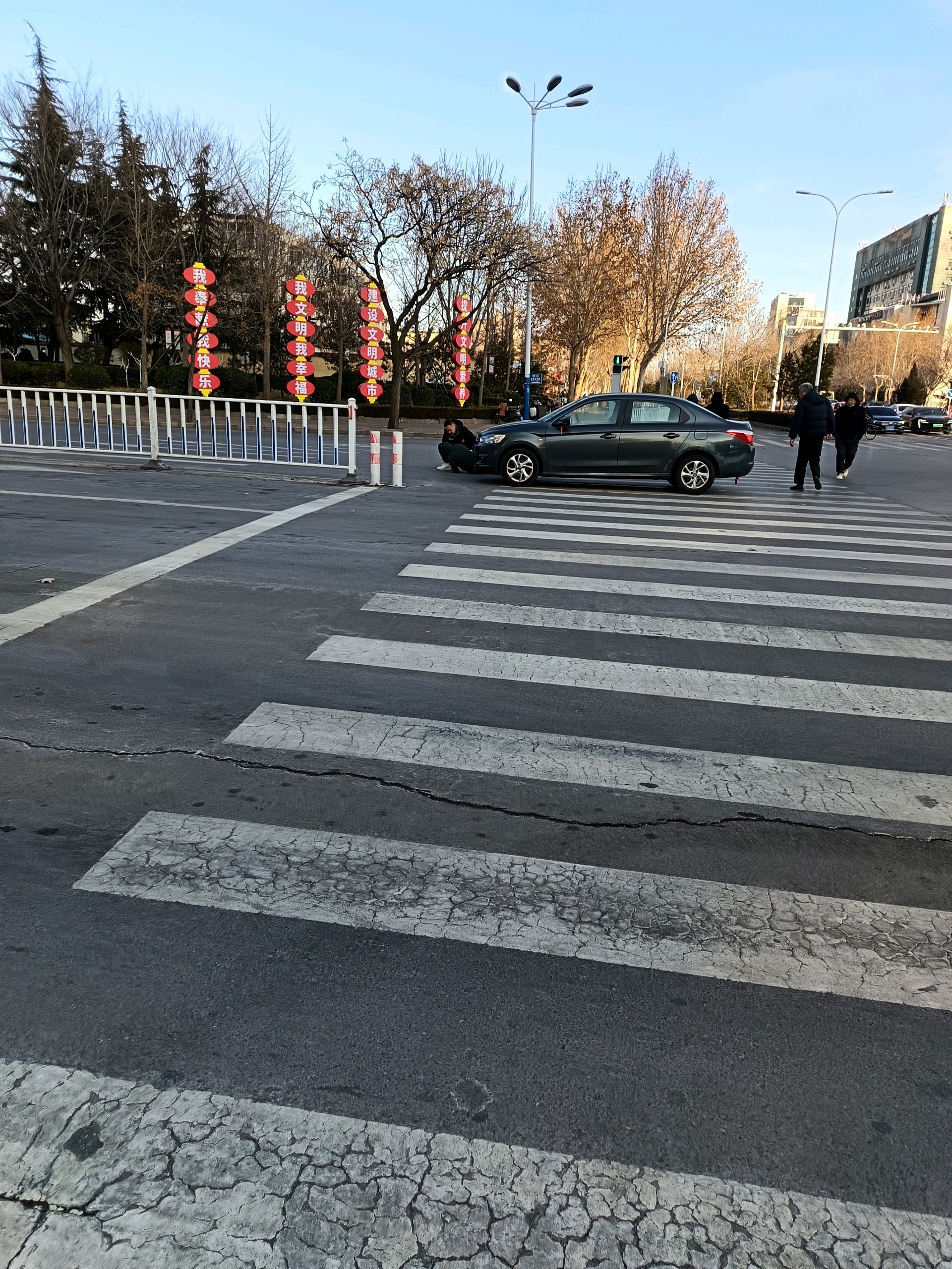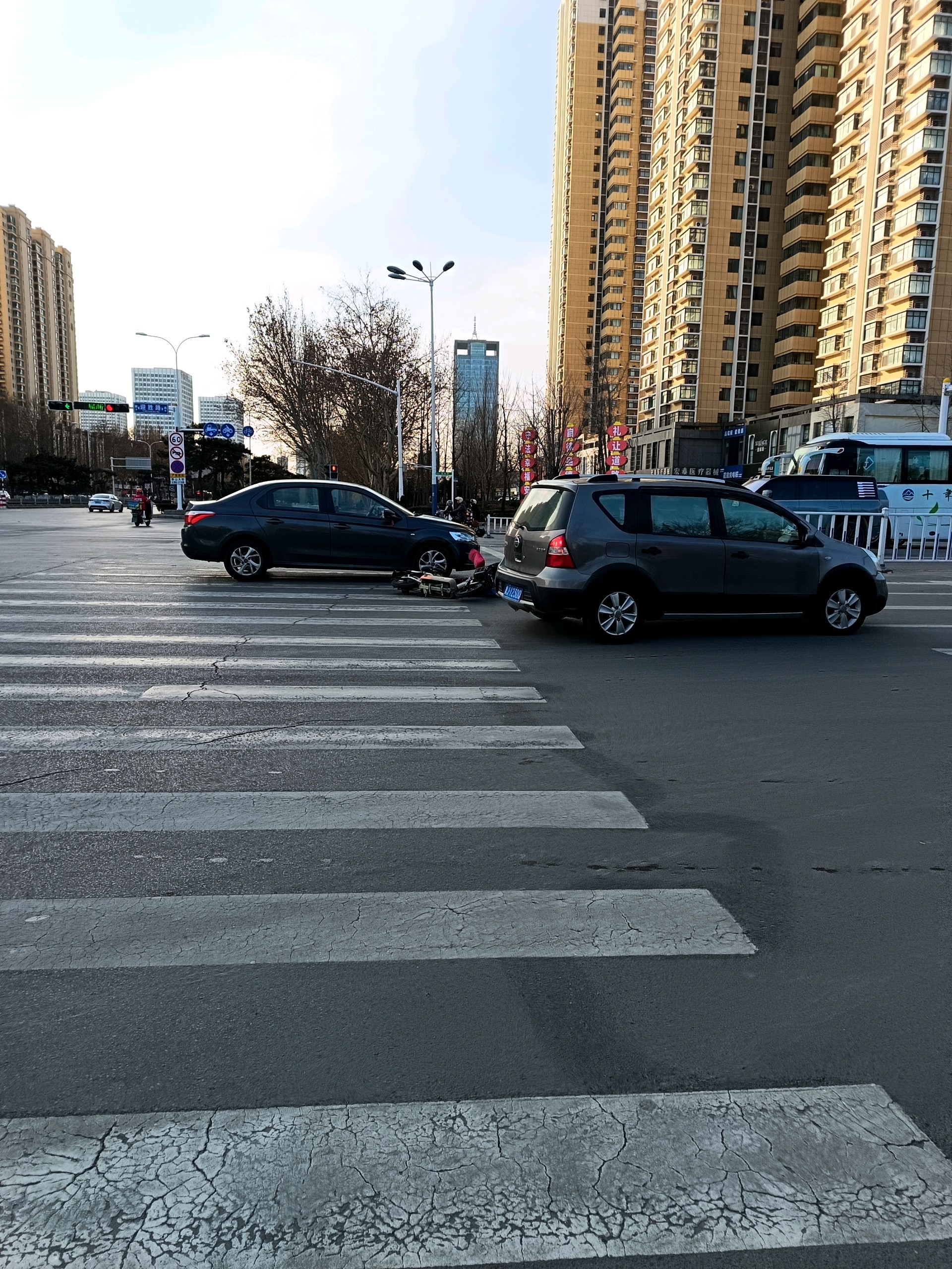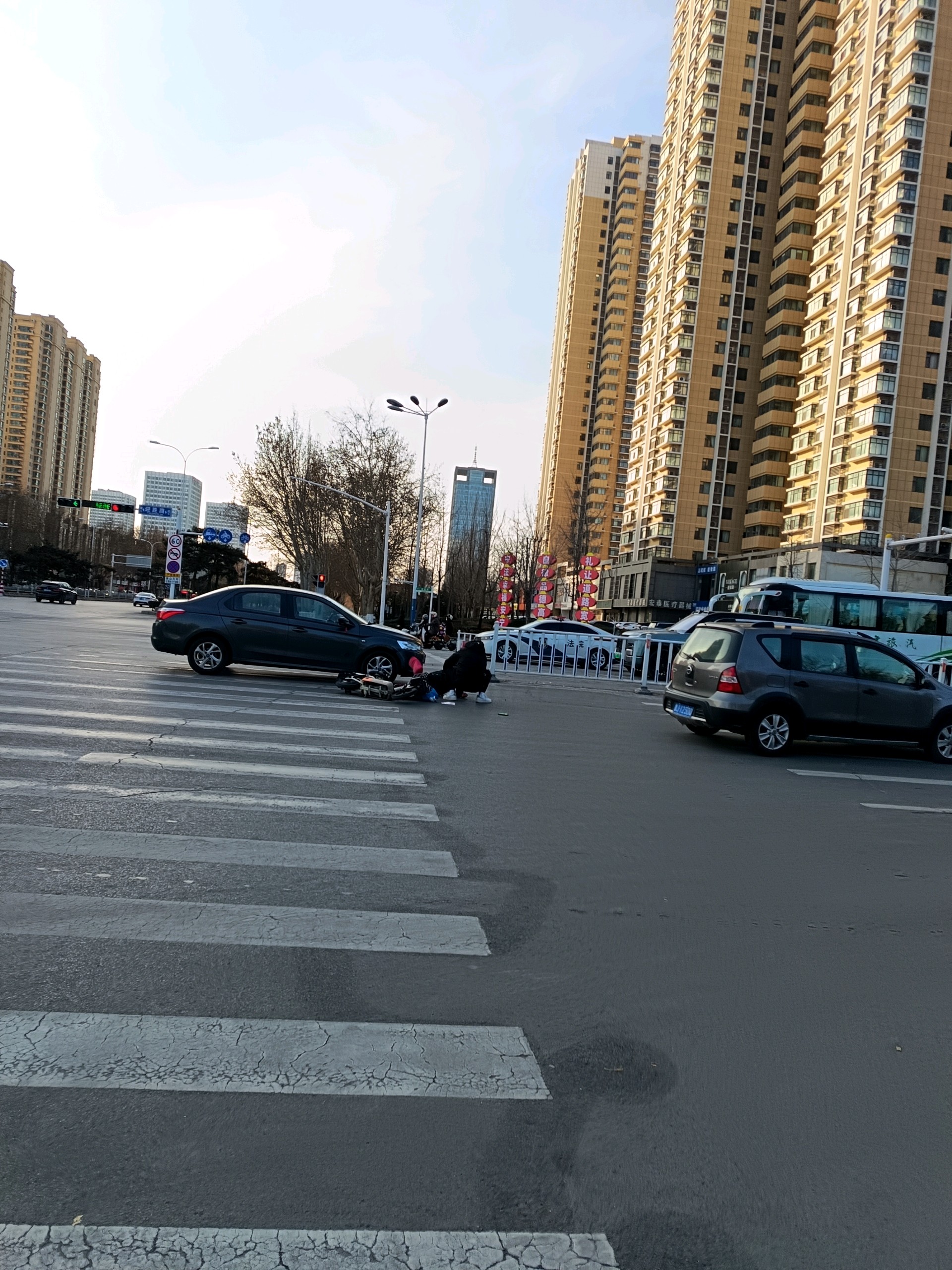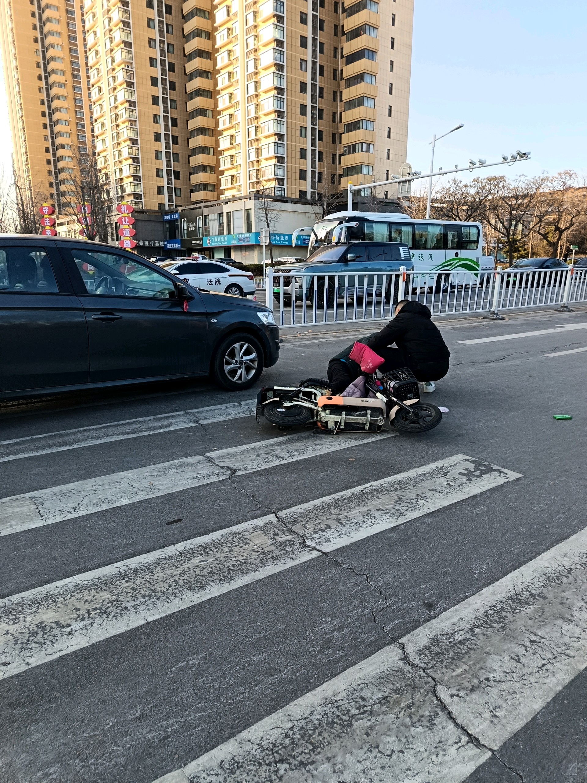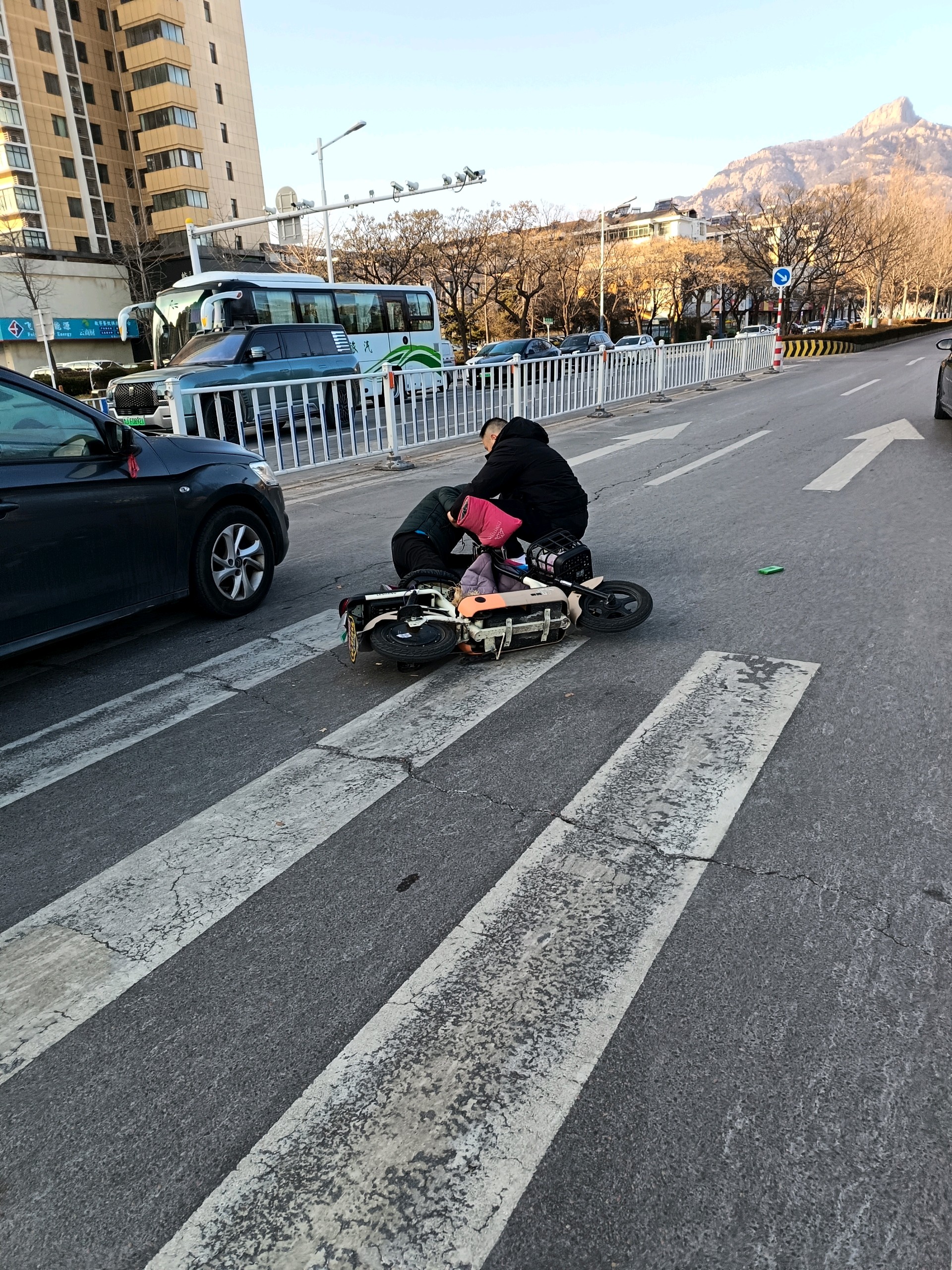 迎胜路泰山大街路口一辆私家车与电动车发生碰撞,电动车驾驶人倒在私家车旁边,估计人无大碍。双方在等待处理。呼吁大家遵章驾驶,平安出行。