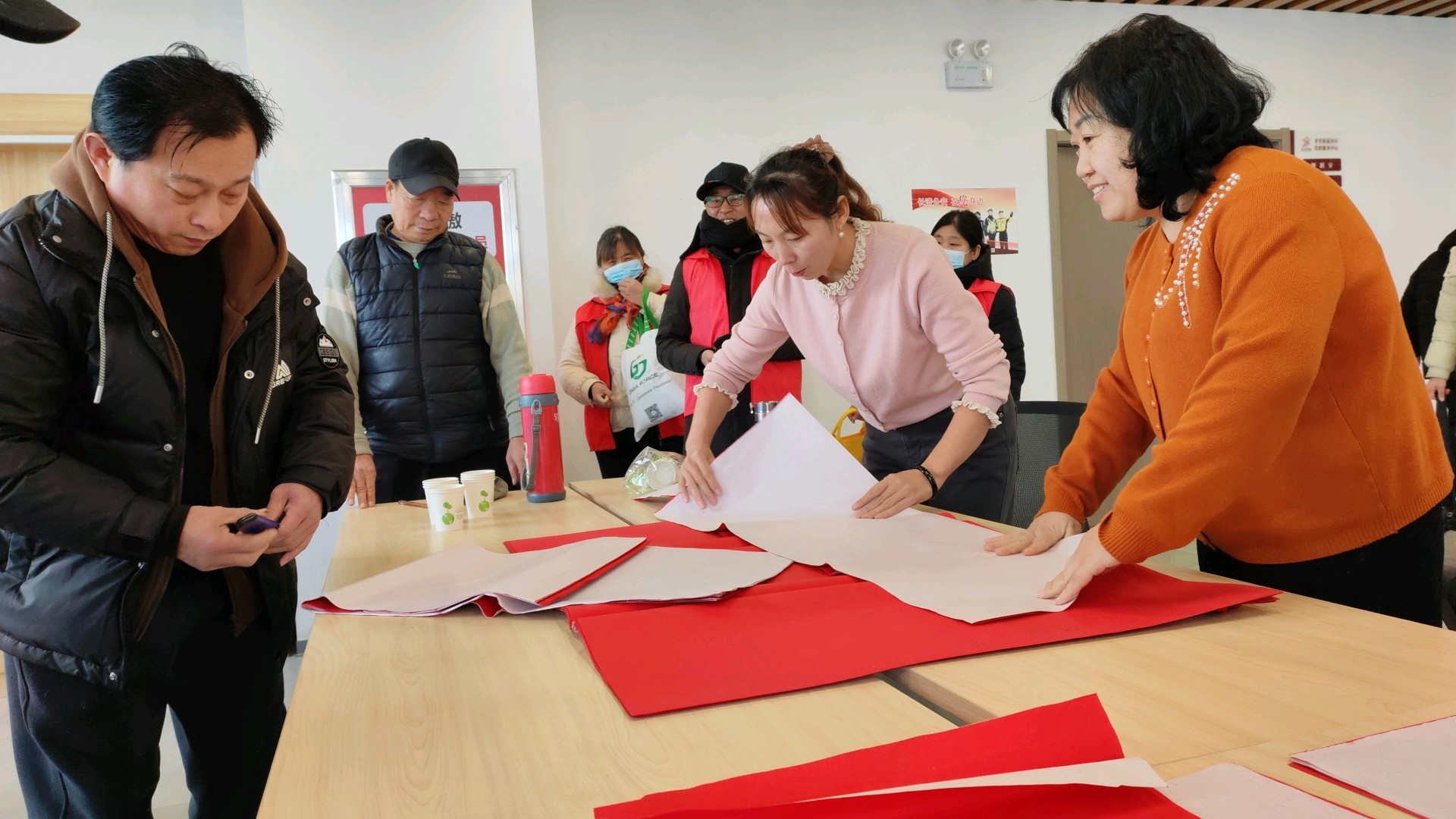 活动现场墨香氤氲,孝文化艺术团的蒋森文、王成鹏、朱诚云、马成年、安令涛、马骏等书法教师队员,早早备好红纸、毛笔与墨汁,凝神挥毫。楷书“福”字端庄饱满,行书春联流畅洒脱,“马驰盛世添福寿,春满家园纳吉祥”“福启新程辞旧岁,孝传故里暖人心”等佳句,既饱含对马年的期许,又彰显孝里街道的文化底蕴。社工与艺术团志愿者默契配合,一边协助铺纸、晾晒,一边整理作品,确保每一份福字、春联都整洁完好,现场洋溢着热闹喜庆的氛围。
