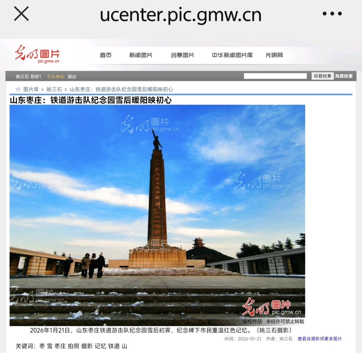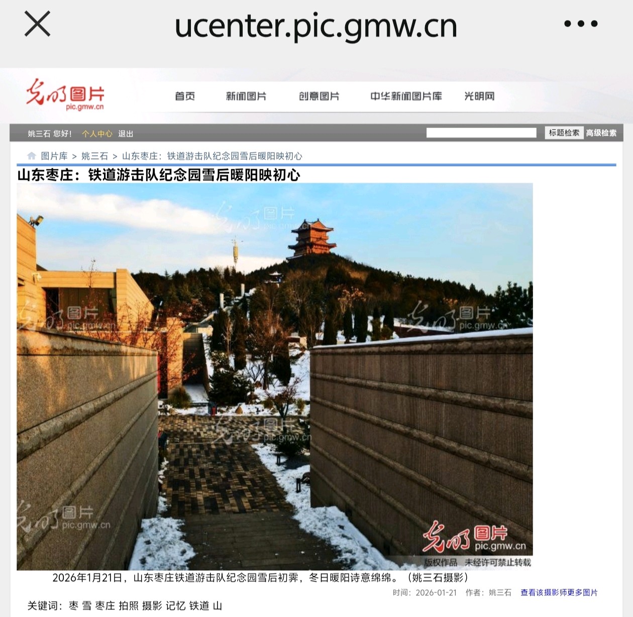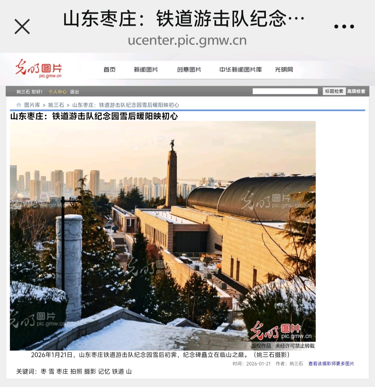 光明网(光明图片)1月21日发表姚三石摄影新闻《山东枣庄:铁道游击队纪念园雪后暖阳映初心》2026年1月21日,山东枣庄铁道游击队纪念园雪后初霁。暖阳为临山阁、纪念碑镀上暖金,步道积雪未融,松柏覆雪挺立。市民漫步林间,在冬日暖阳中重温红色记忆,感受历史与自然交融的独特韵味。(姚三石 摄影)
