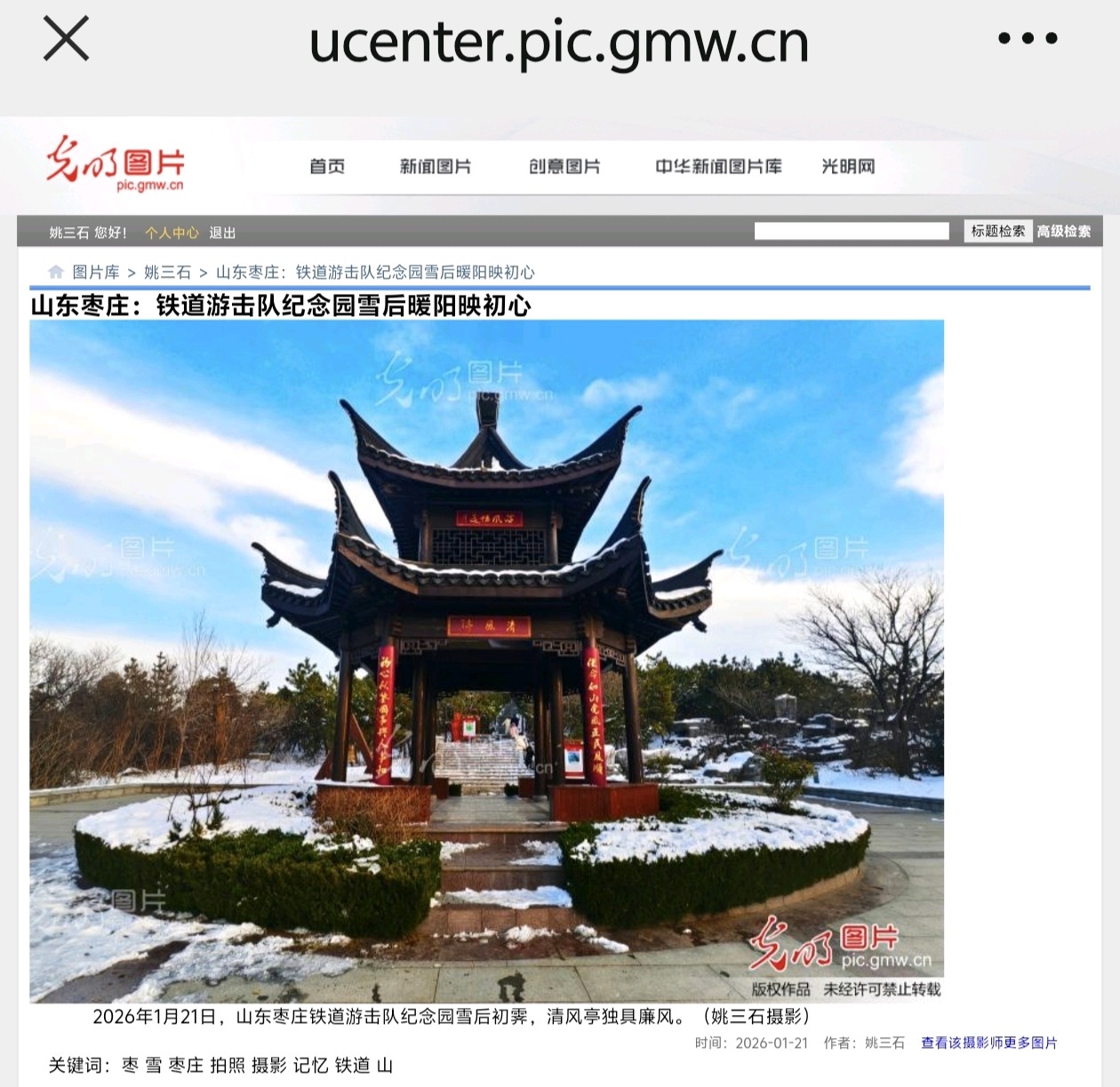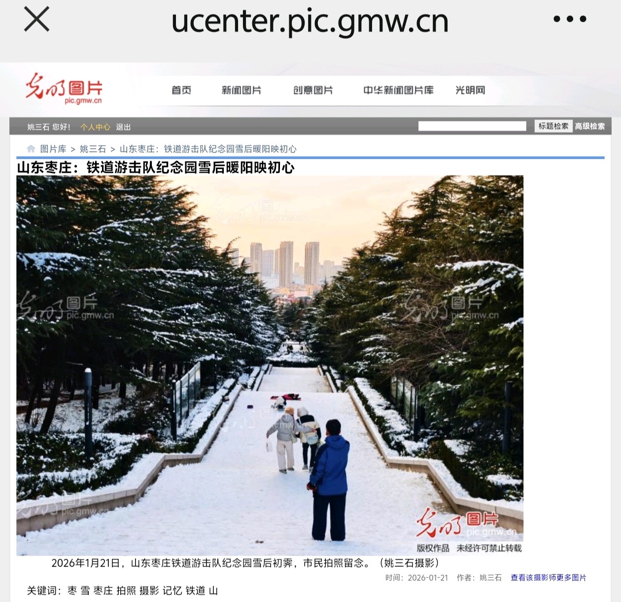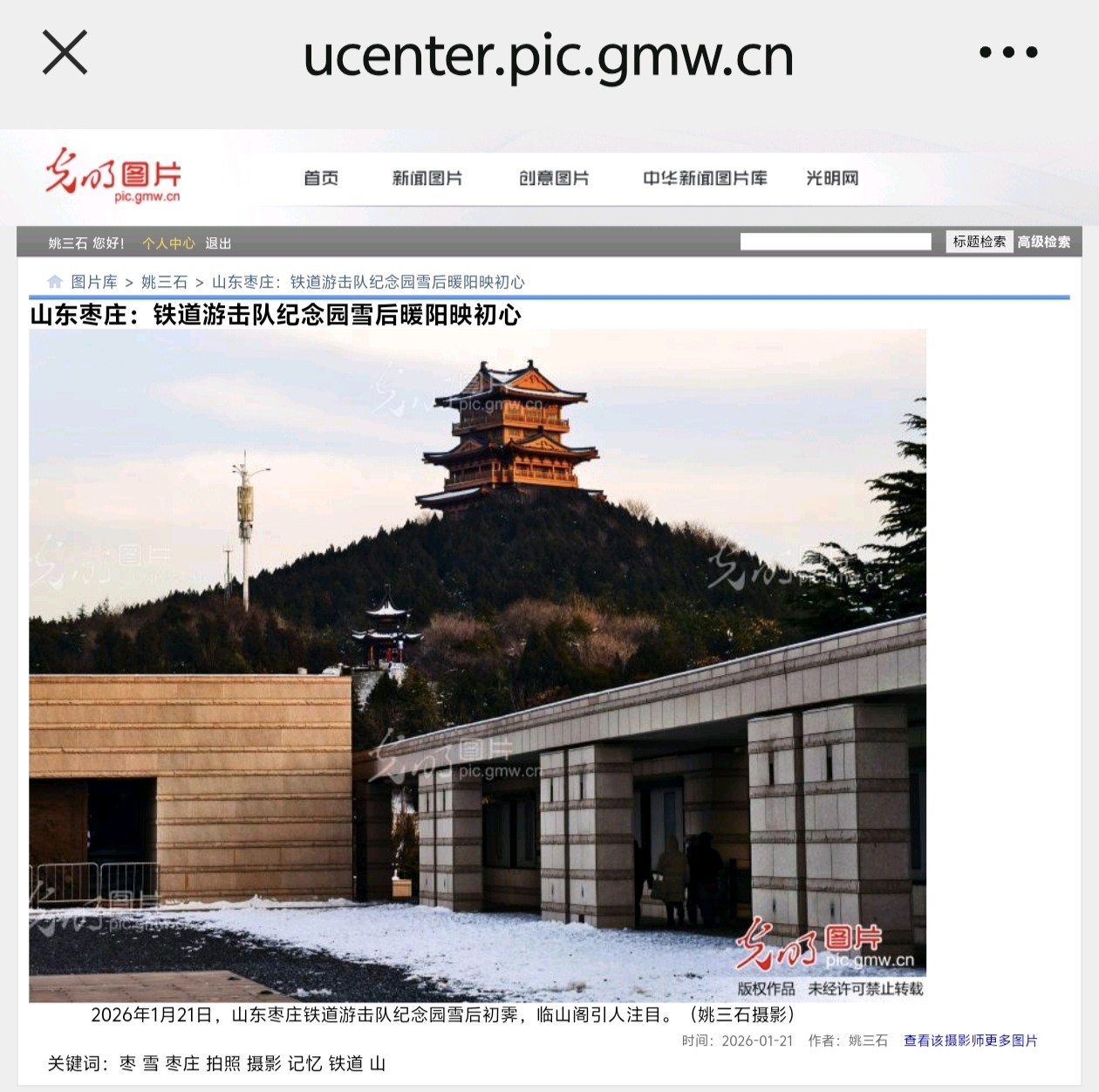 光明网(光明图片)1月21日发表姚三石摄影新闻《山东枣庄:铁道游击队纪念园雪后暖阳映初心》2026年1月21日,山东枣庄铁道游击队纪念园雪后初霁。暖阳为临山阁、纪念碑镀上暖金,步道积雪未融,松柏覆雪挺立。市民漫步林间,在冬日暖阳中重温红色记忆,感受历史与自然交融的独特韵味。(姚三石 摄影)