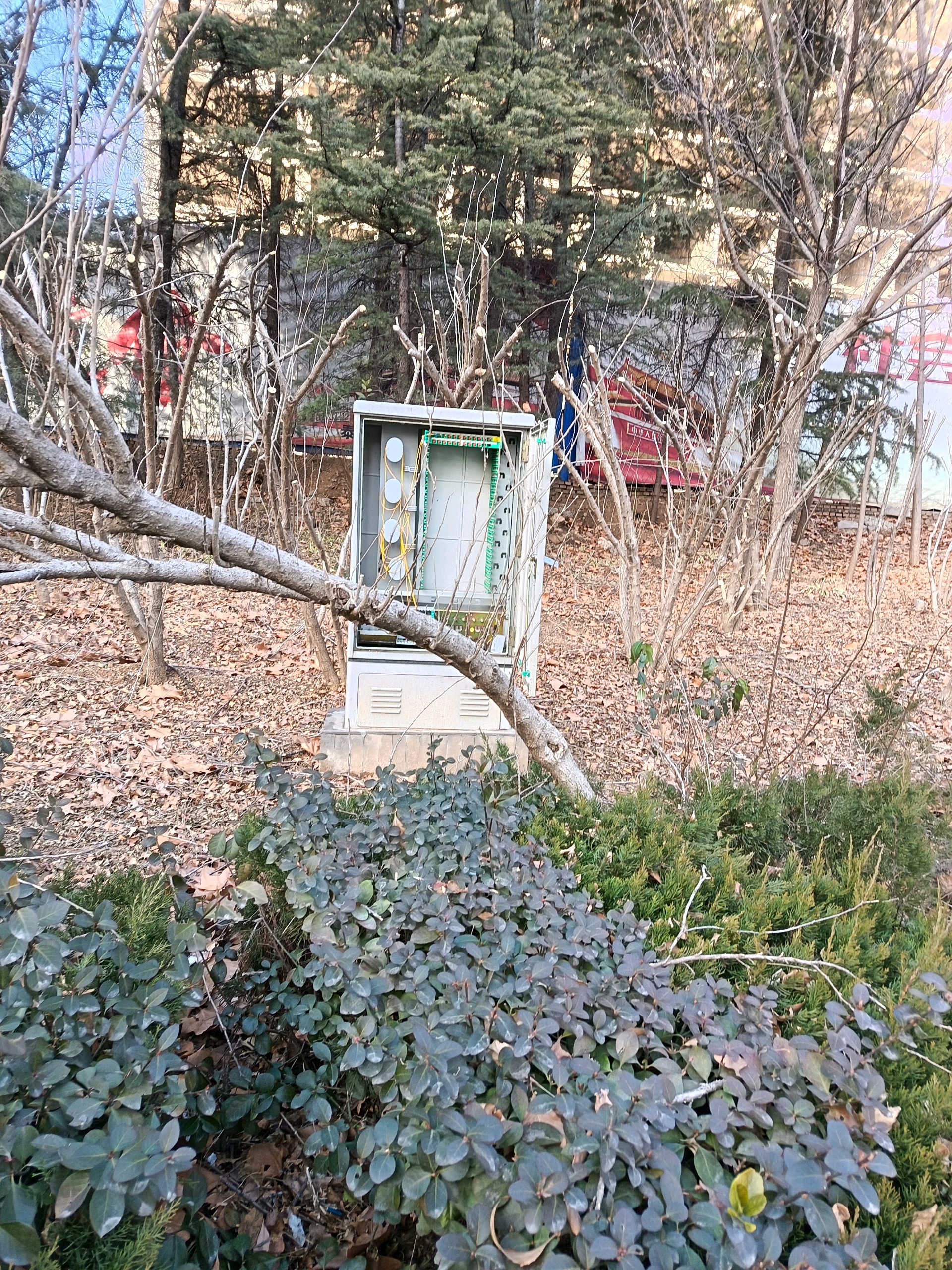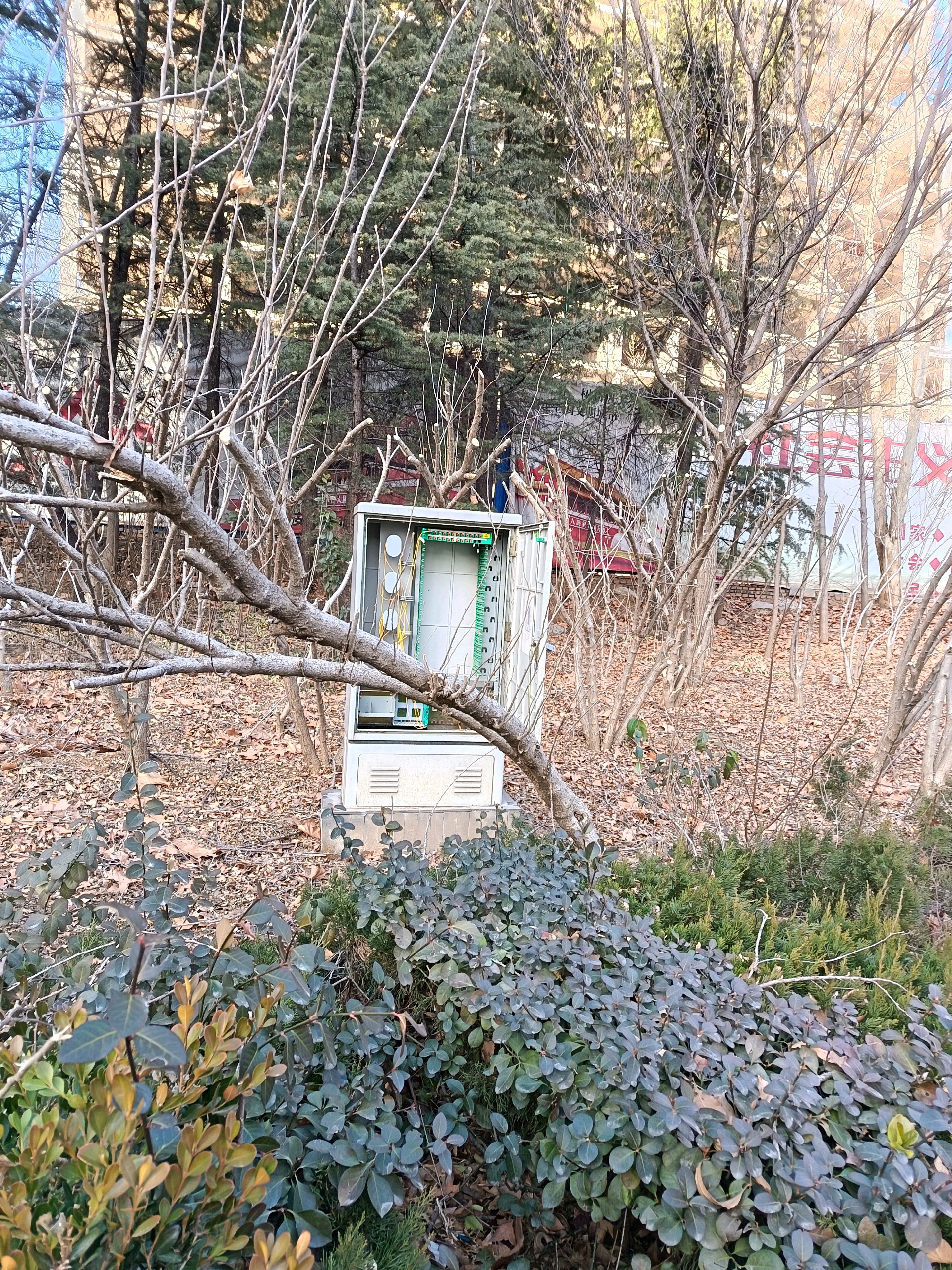 灵山大街外国语学校东侧一百米路北,一处信号箱箱门大开,里面线路裸露,风雨天气容易造成设备损坏。希望主管责任部门及时现身妥善处理!