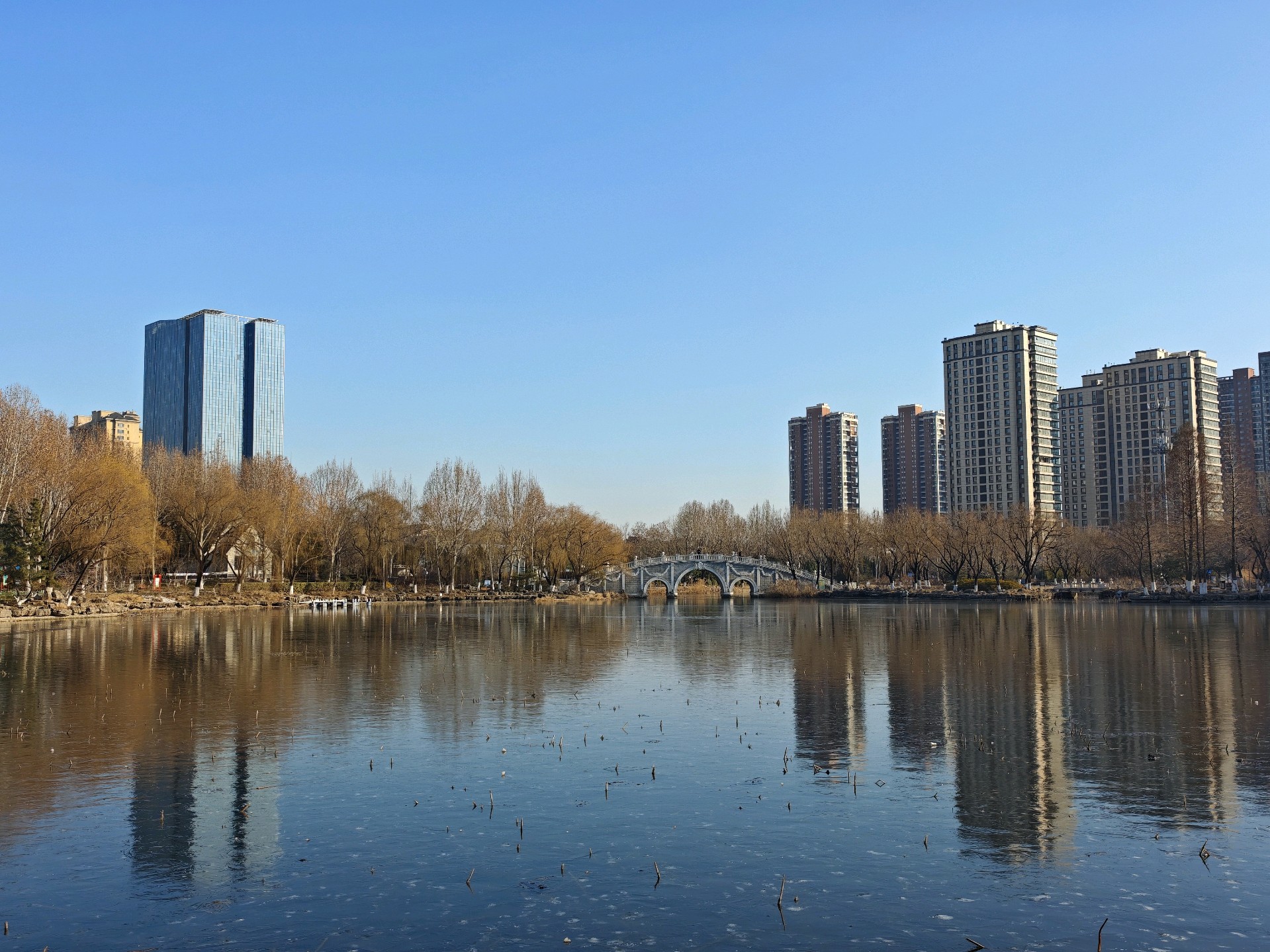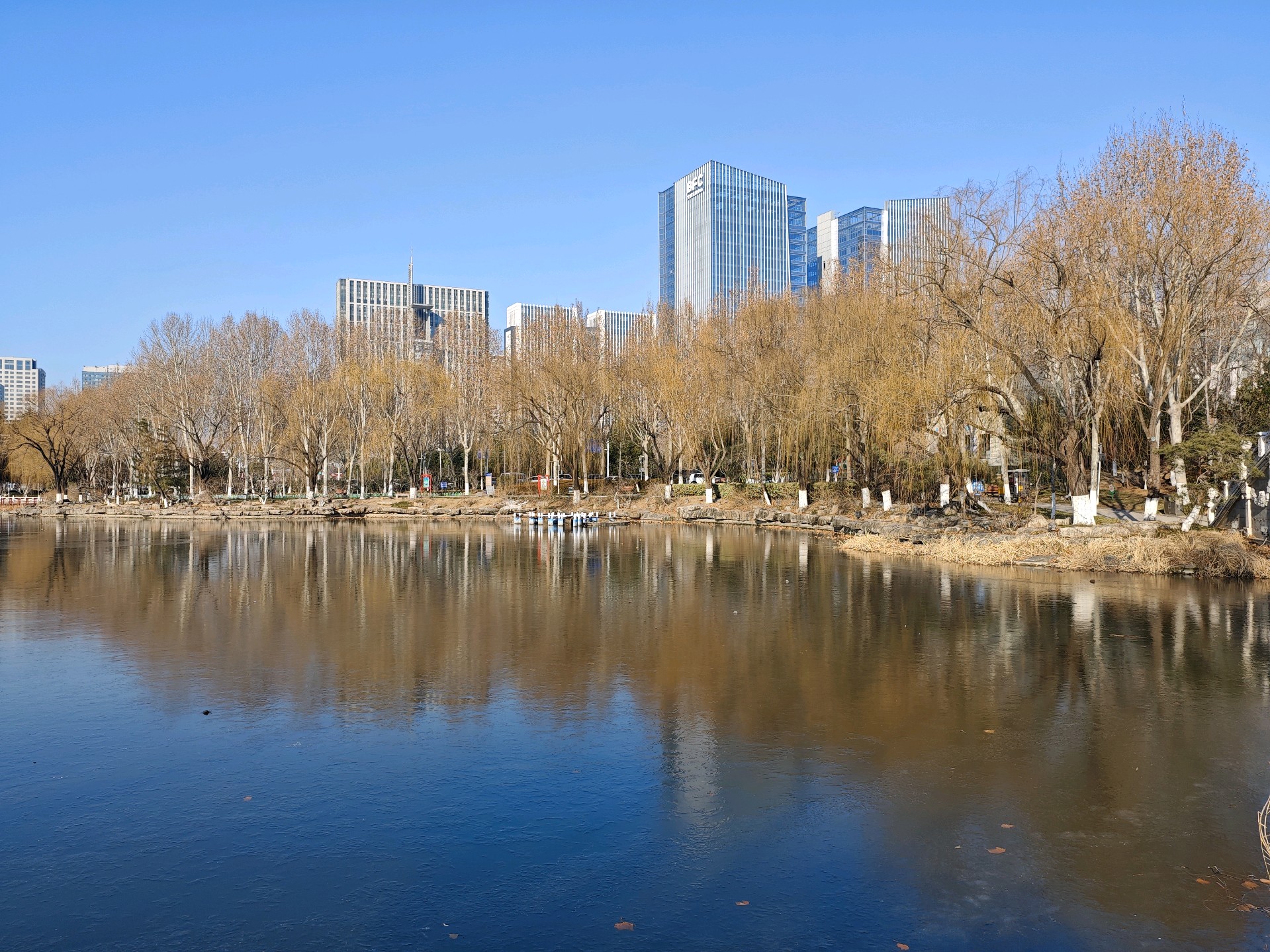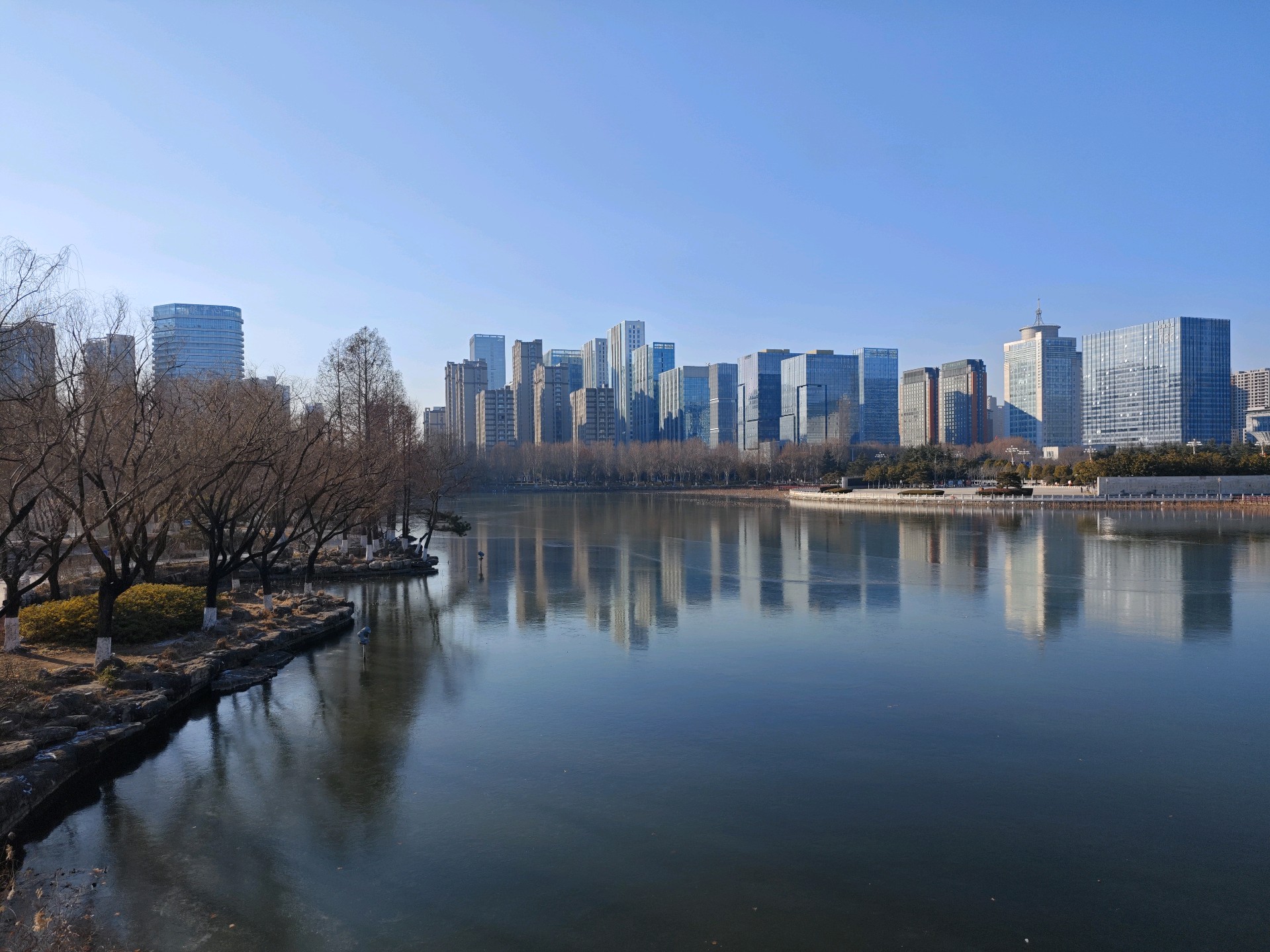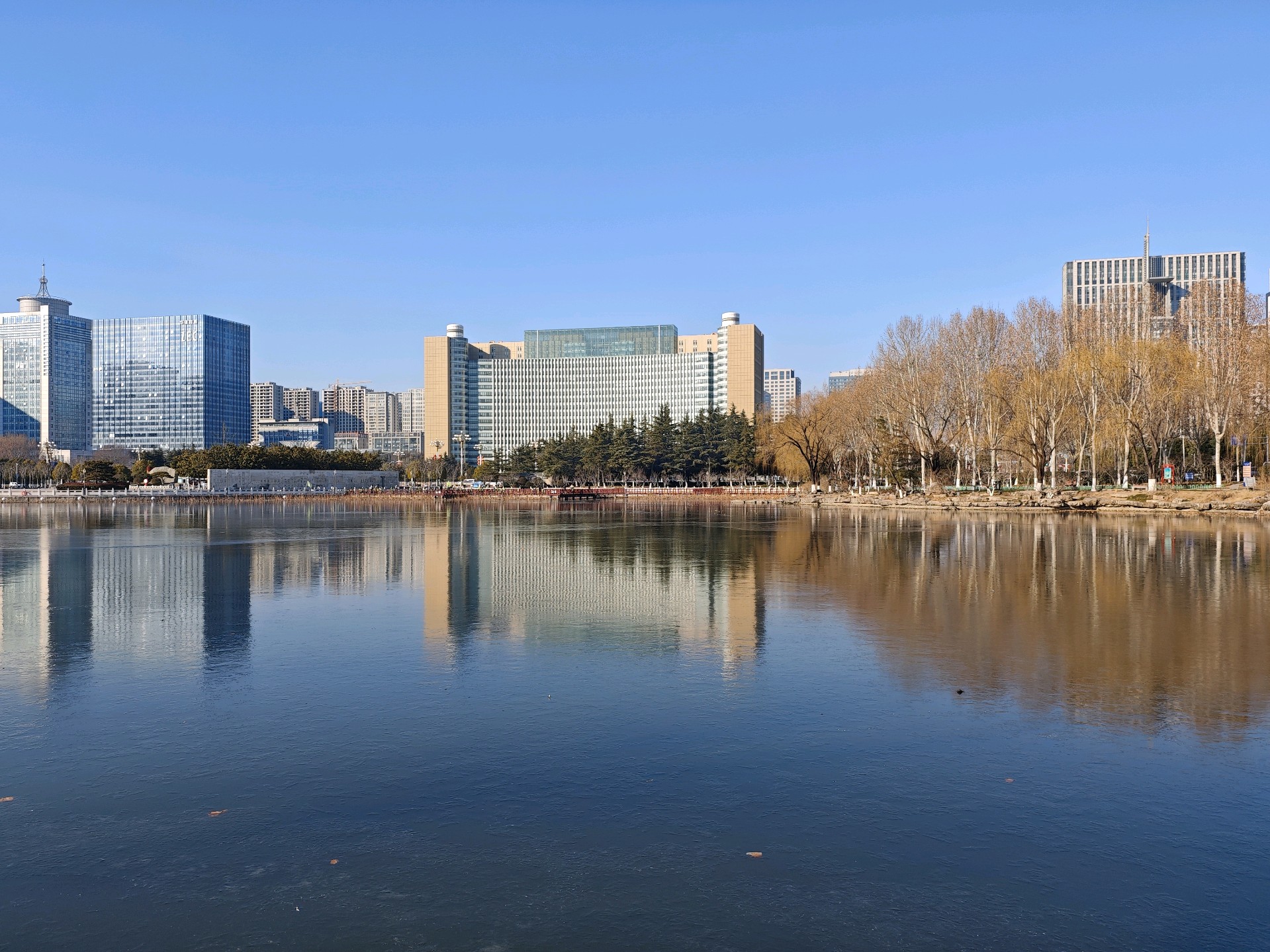 四九严寒,湛蓝的天空下,五洲湖冰面如镜,美不胜收。不惧寒冷的鸭子,破开一隅静水,凫游嬉戏,为冬日五洲湖,增添了几分鲜活灵动。