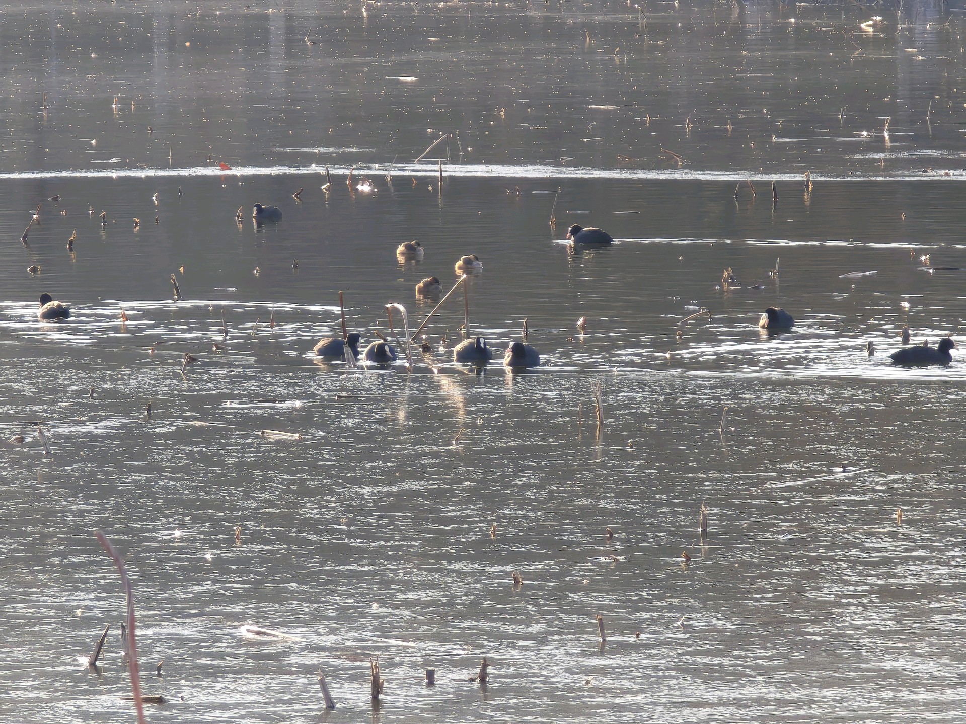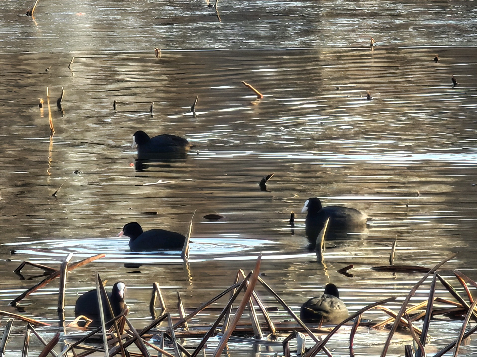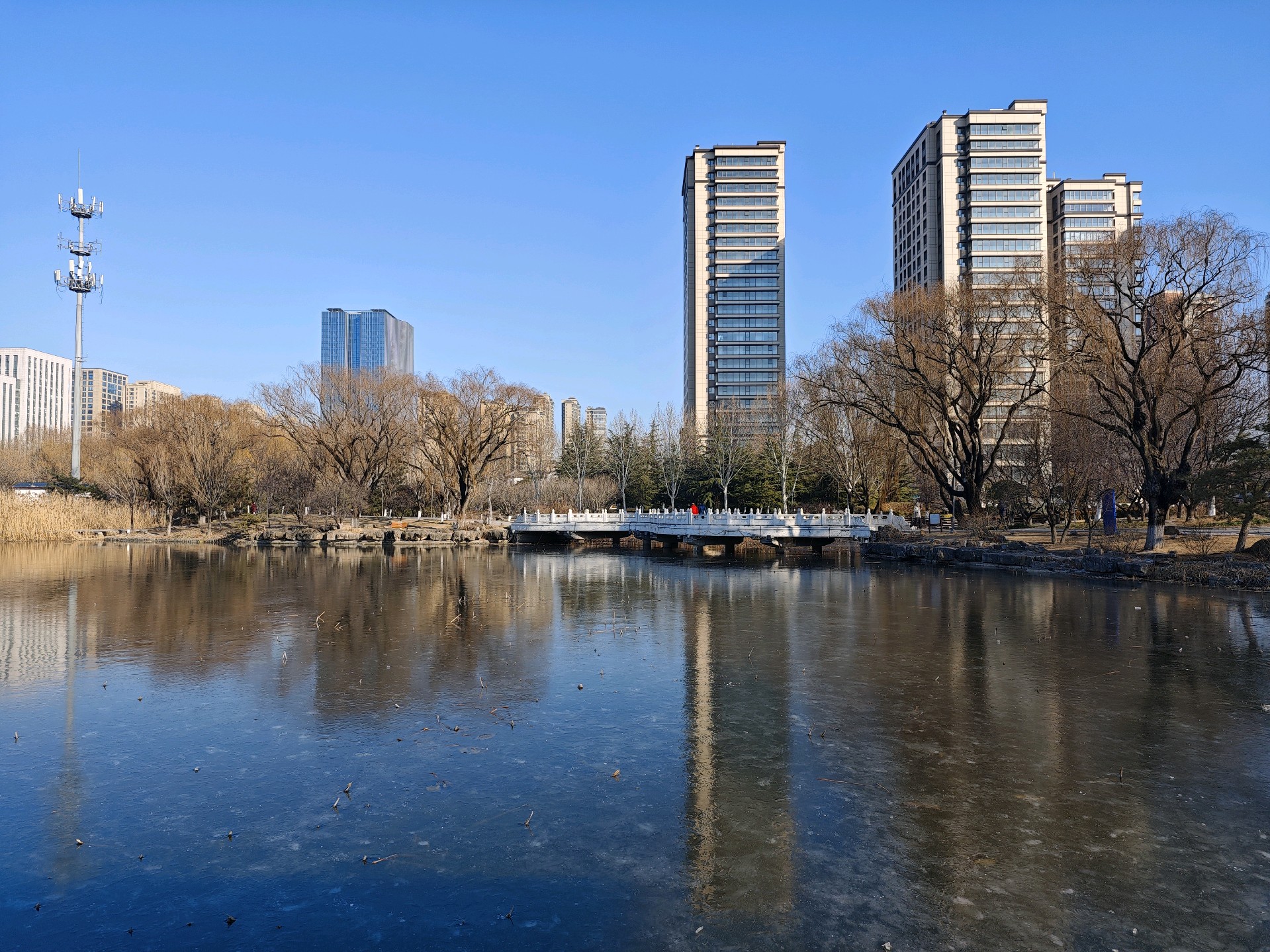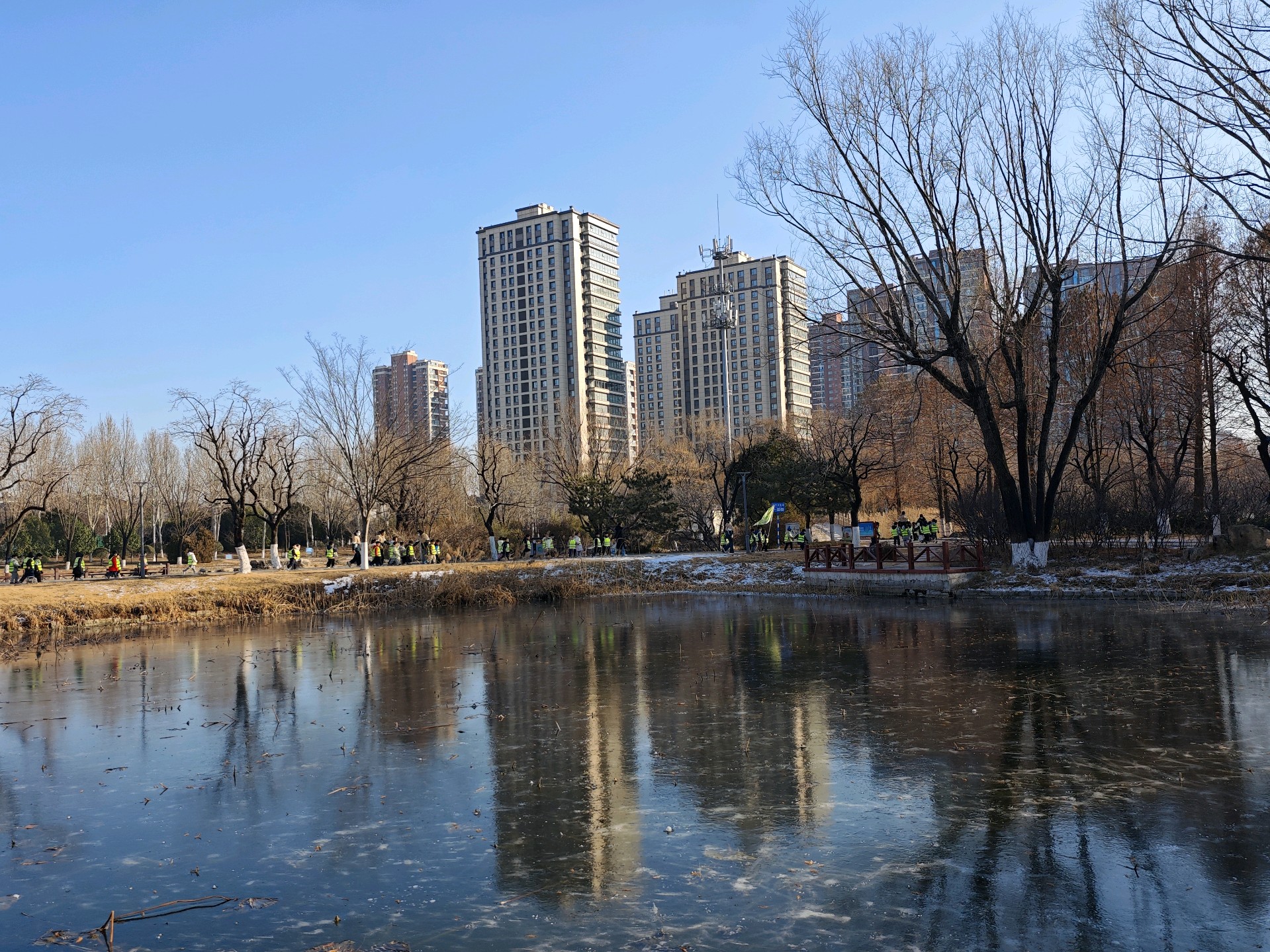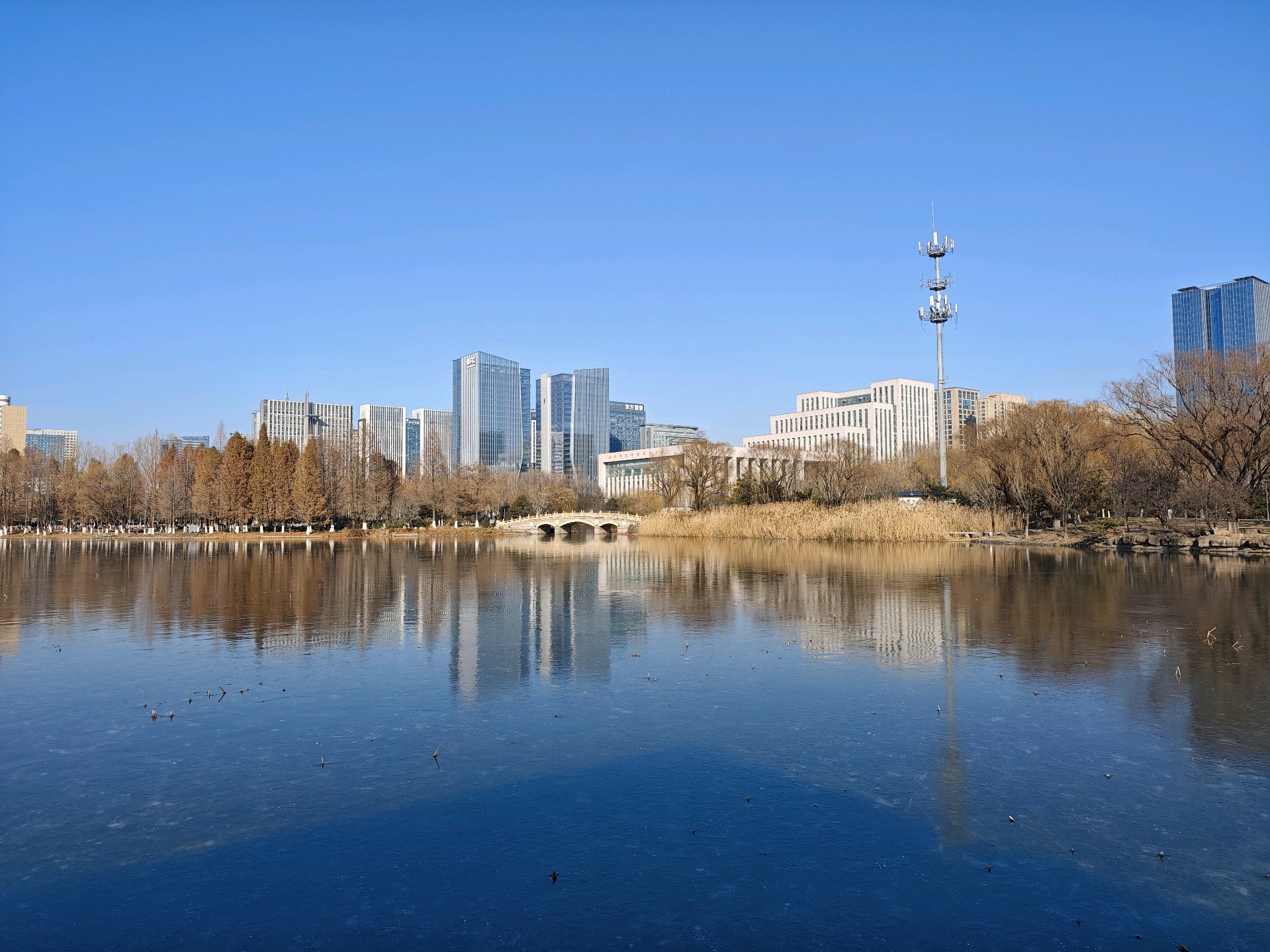 四九严寒,湛蓝的天空下,五洲湖冰面如镜,美不胜收。不惧寒冷的鸭子,破开一隅静水,凫游嬉戏,为冬日五洲湖,增添了几分鲜活灵动。