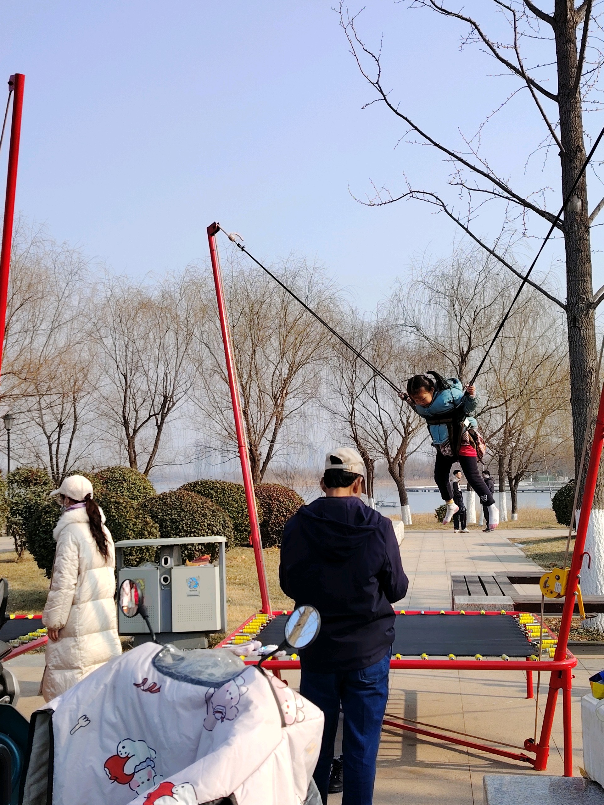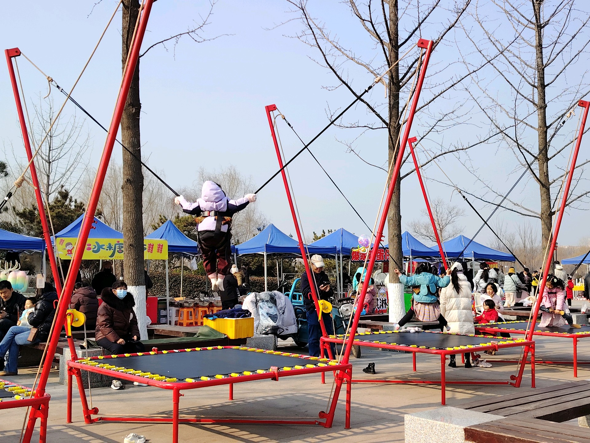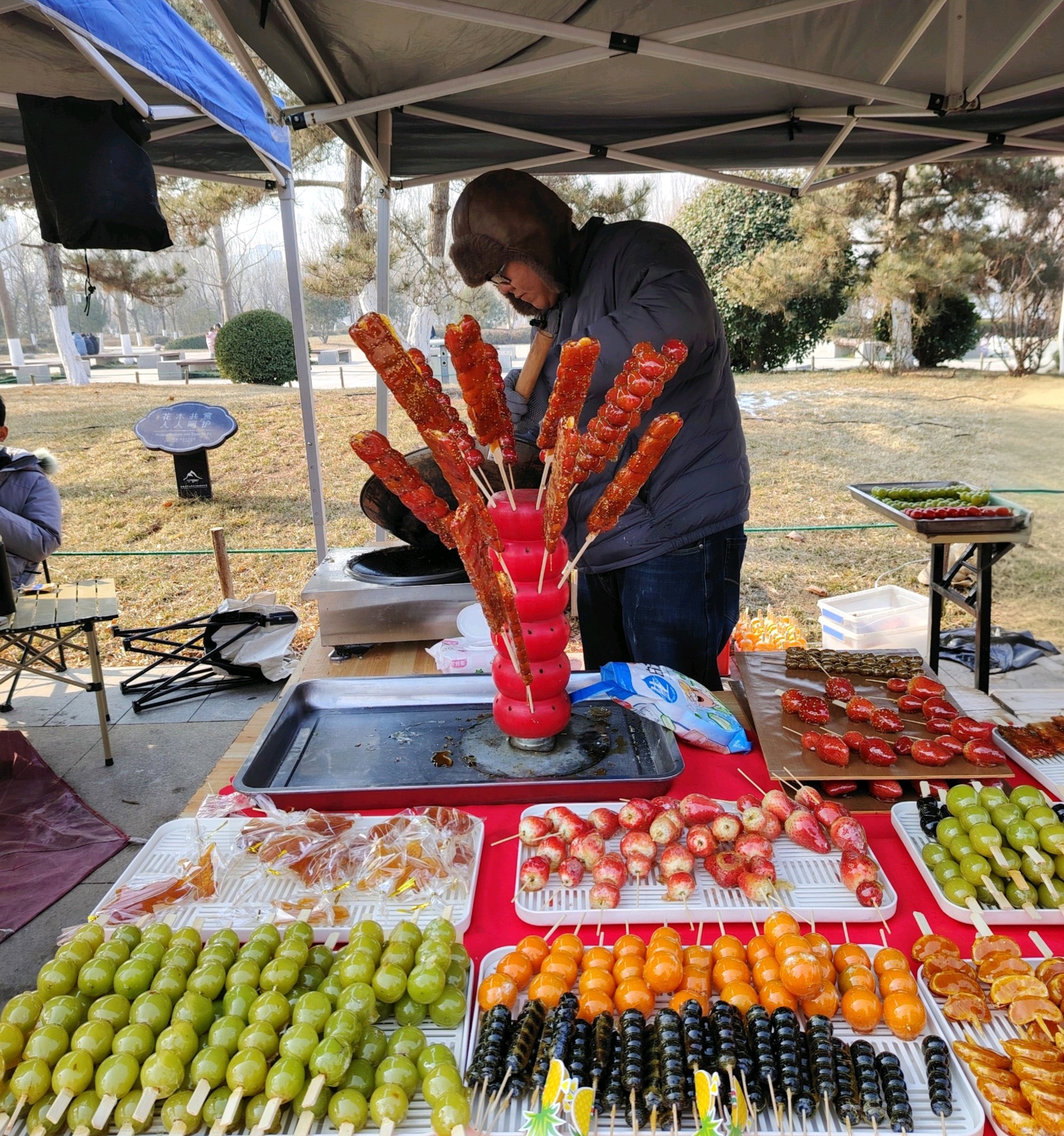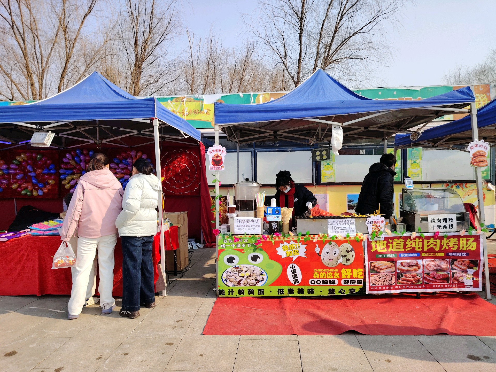 华山湖水已结冰,水鸟汇集在湖中央小岛附近。湖畔是热闹的周末集市,不怕冷的孩子们在蹦床,一个个特色小吃摊非常受欢迎。