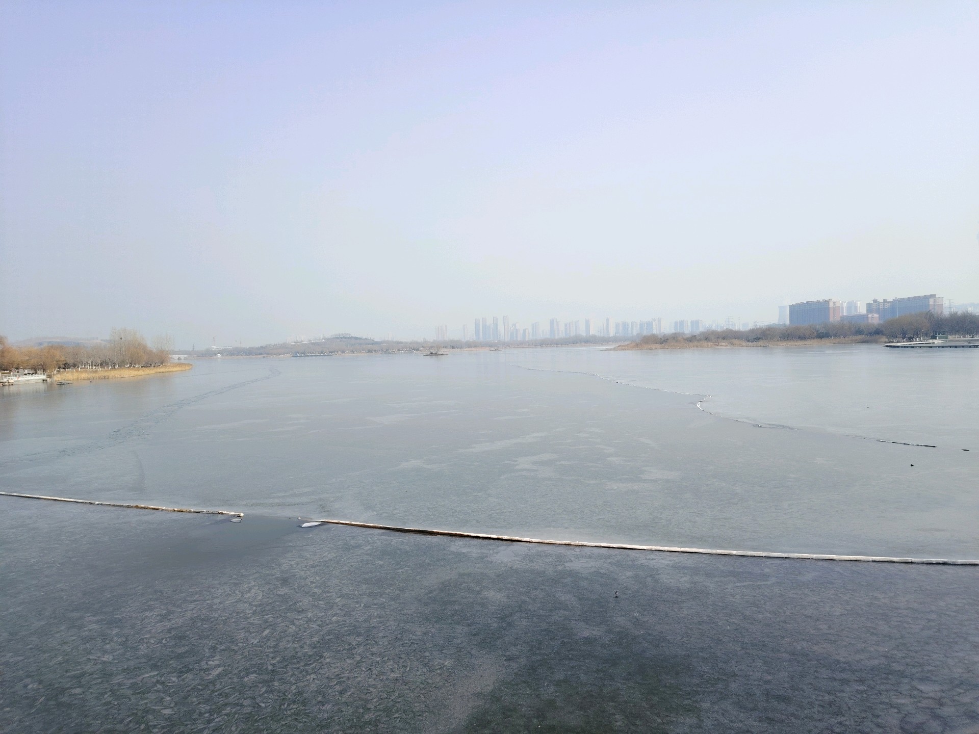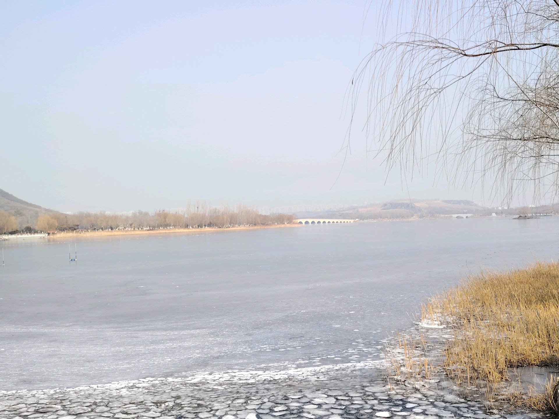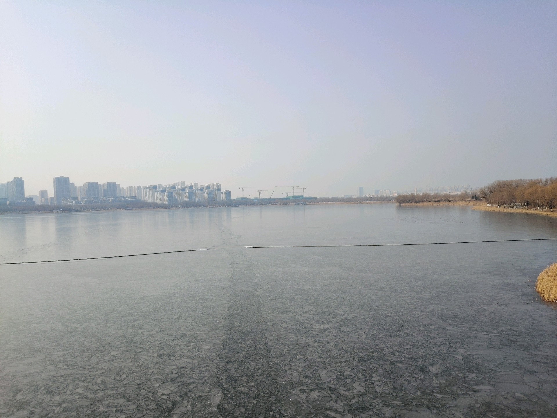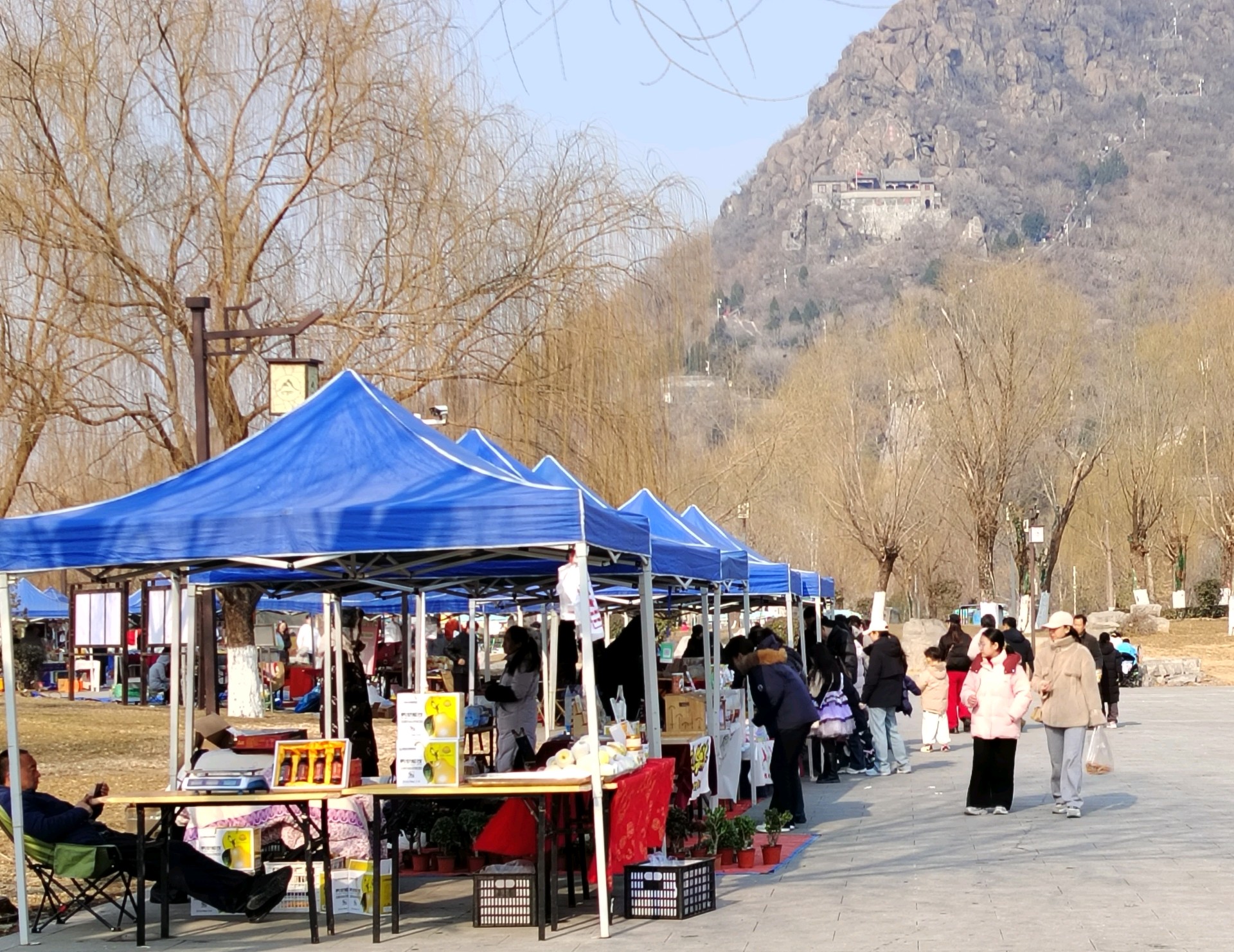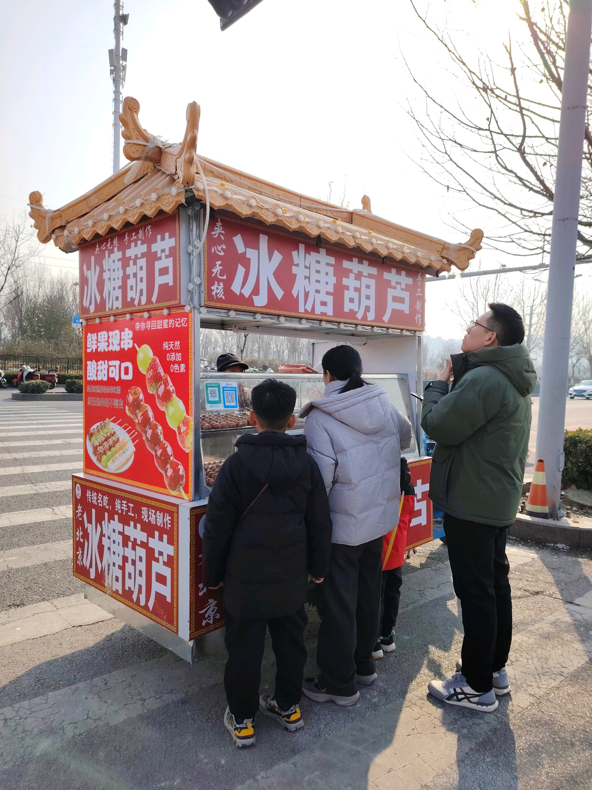 华山湖水已结冰,水鸟汇集在湖中央小岛附近。湖畔是热闹的周末集市,不怕冷的孩子们在蹦床,一个个特色小吃摊非常受欢迎。