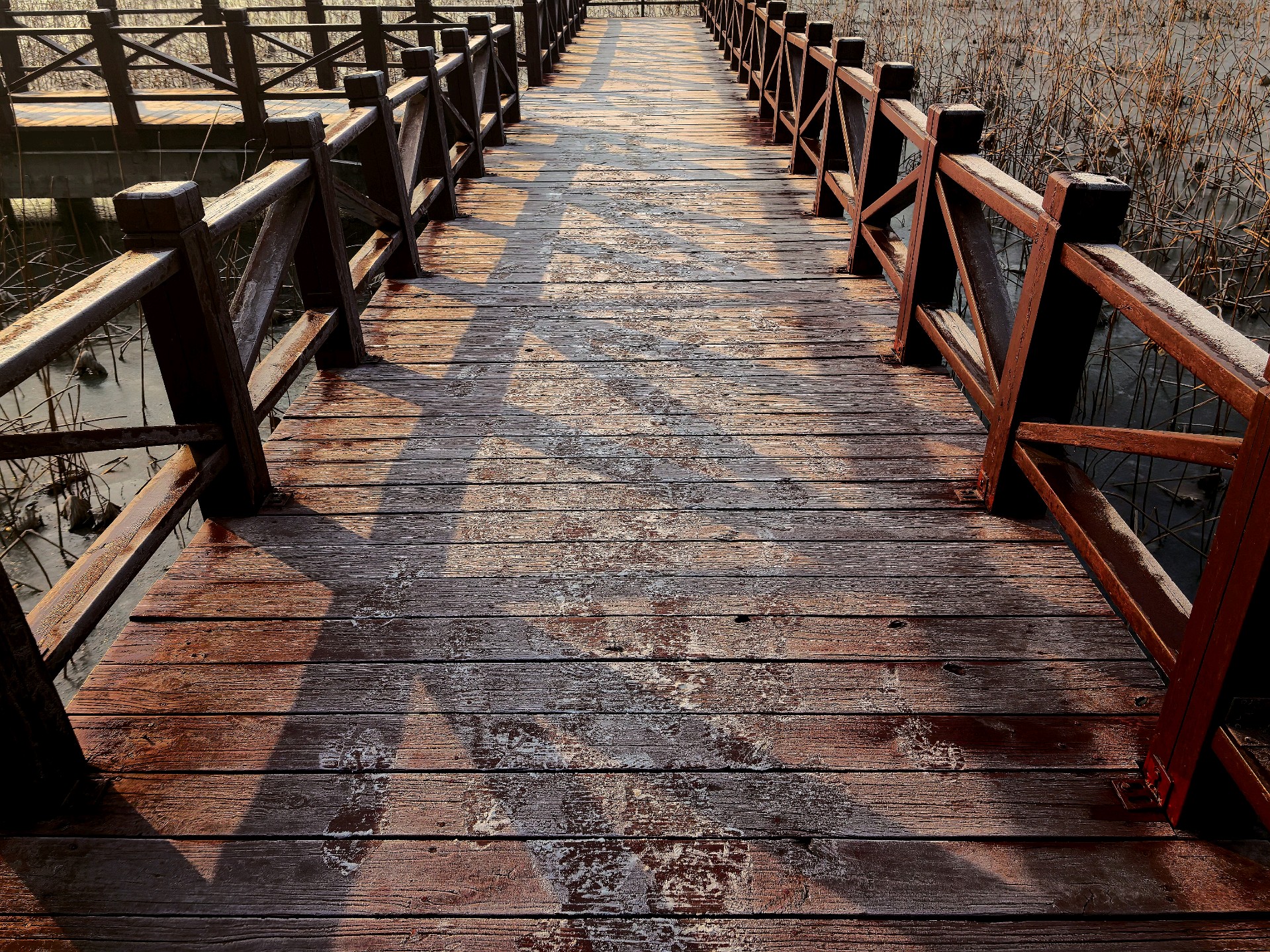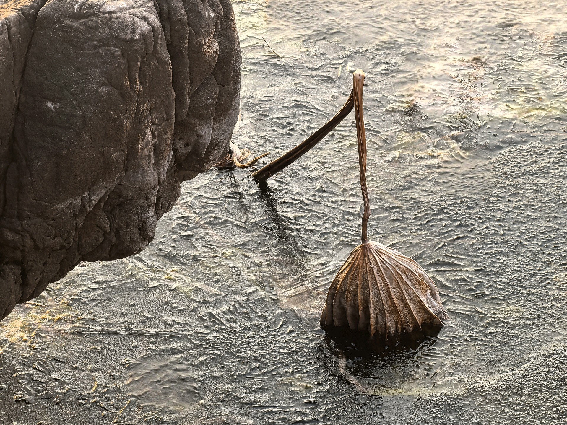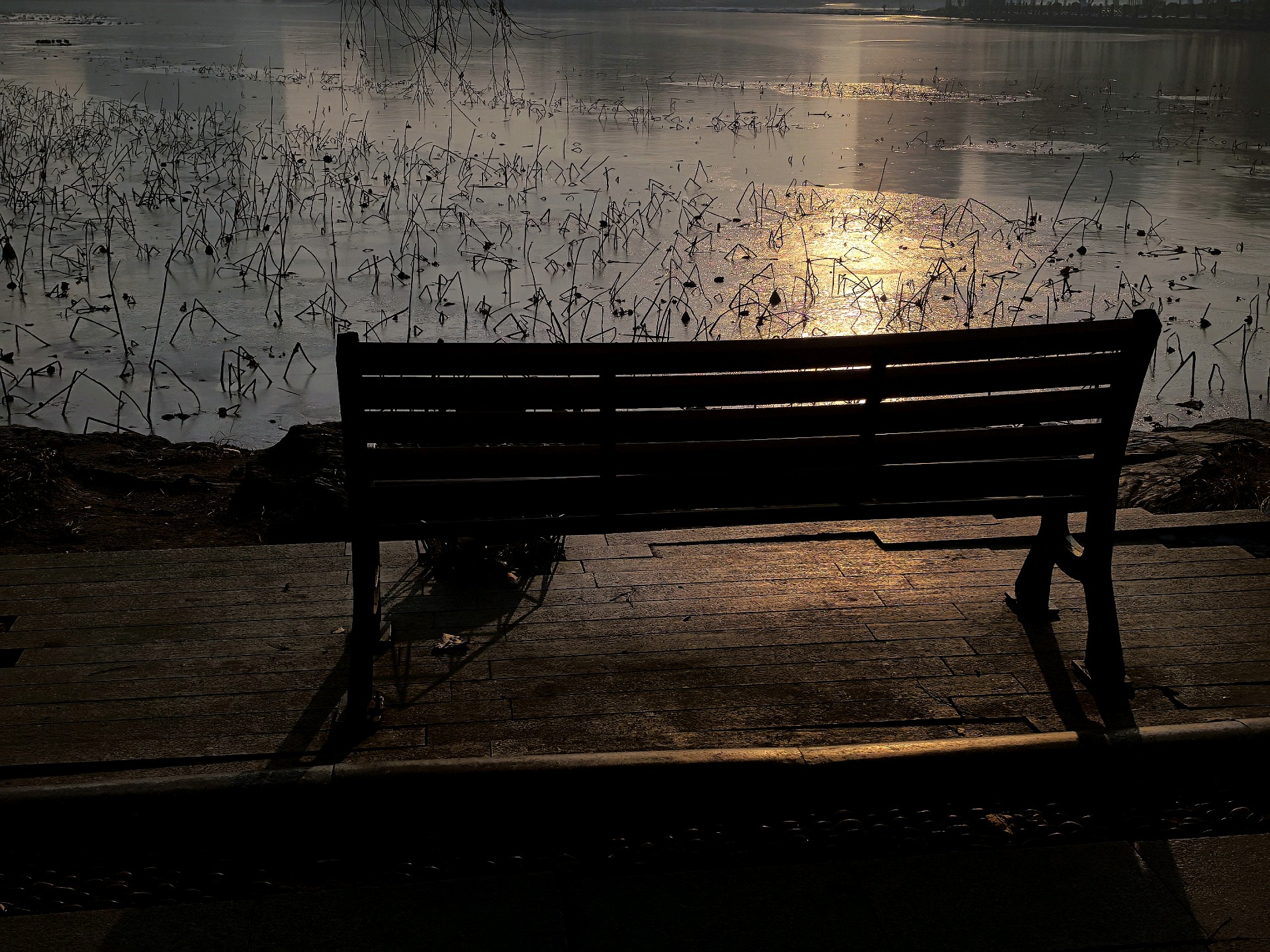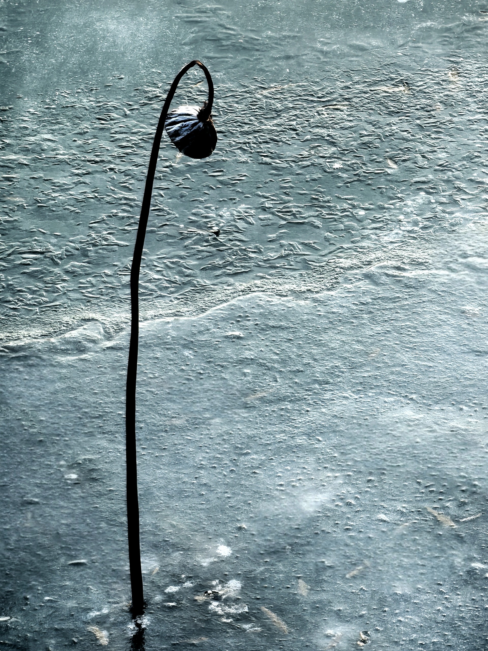 四九的五洲湖,冰封湖面,清晨橙色阳光洒在冰面,一枝枝枯荷独自伫立,好像是叙述季节的变化。