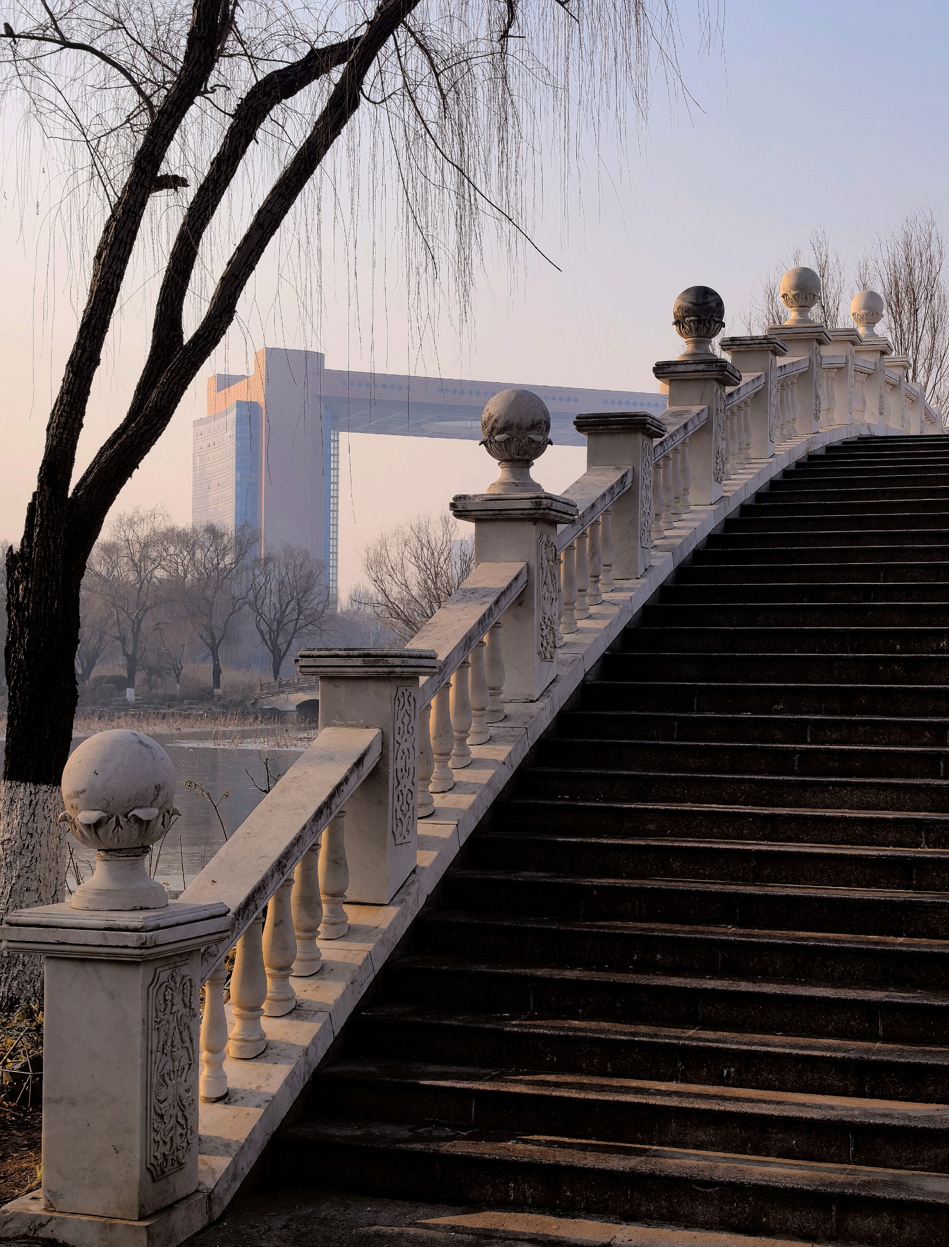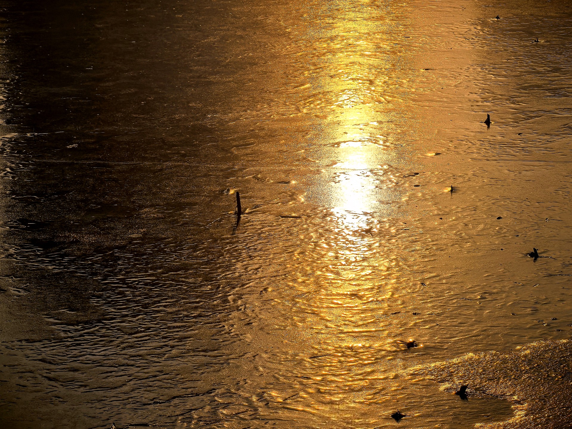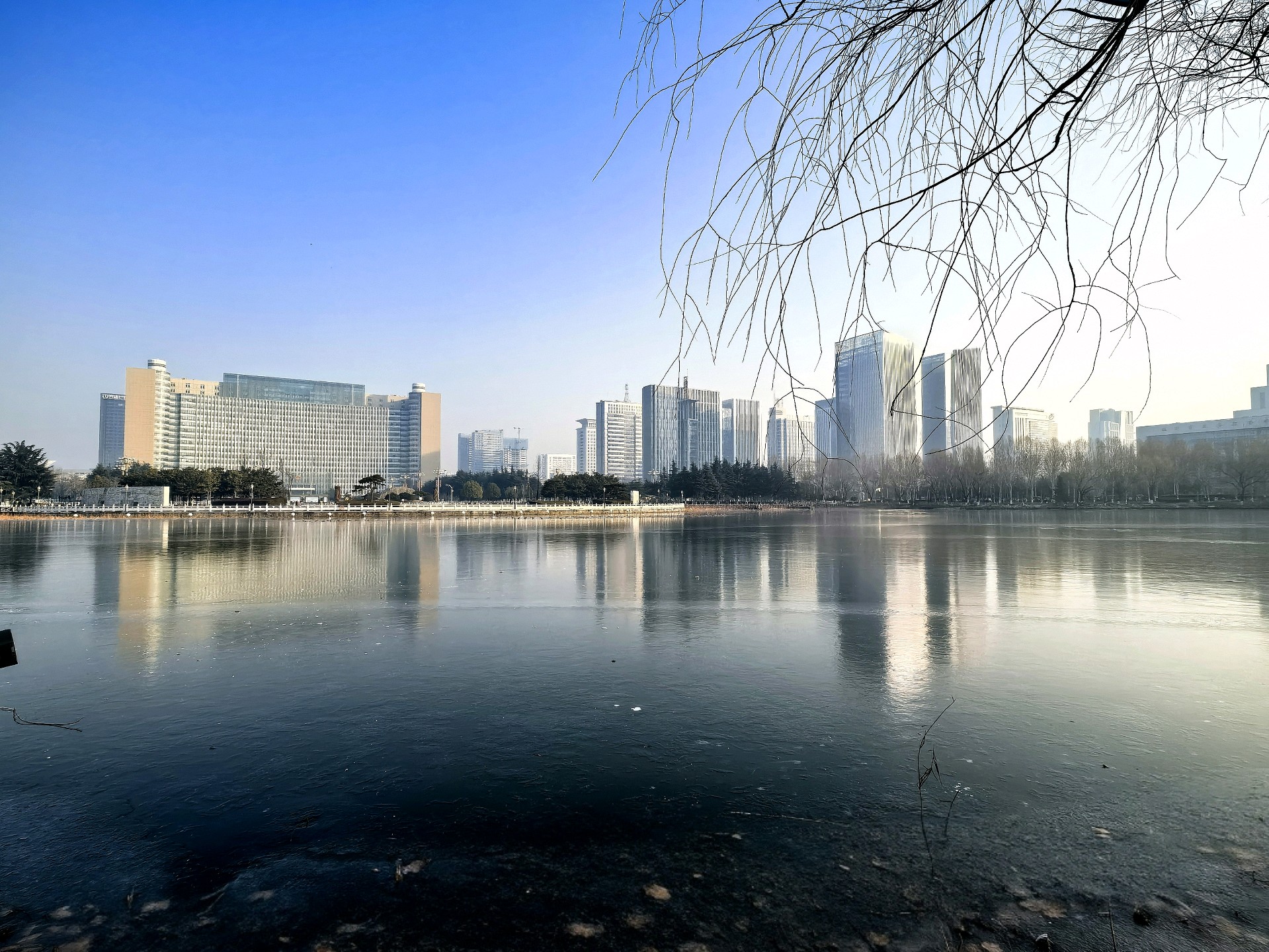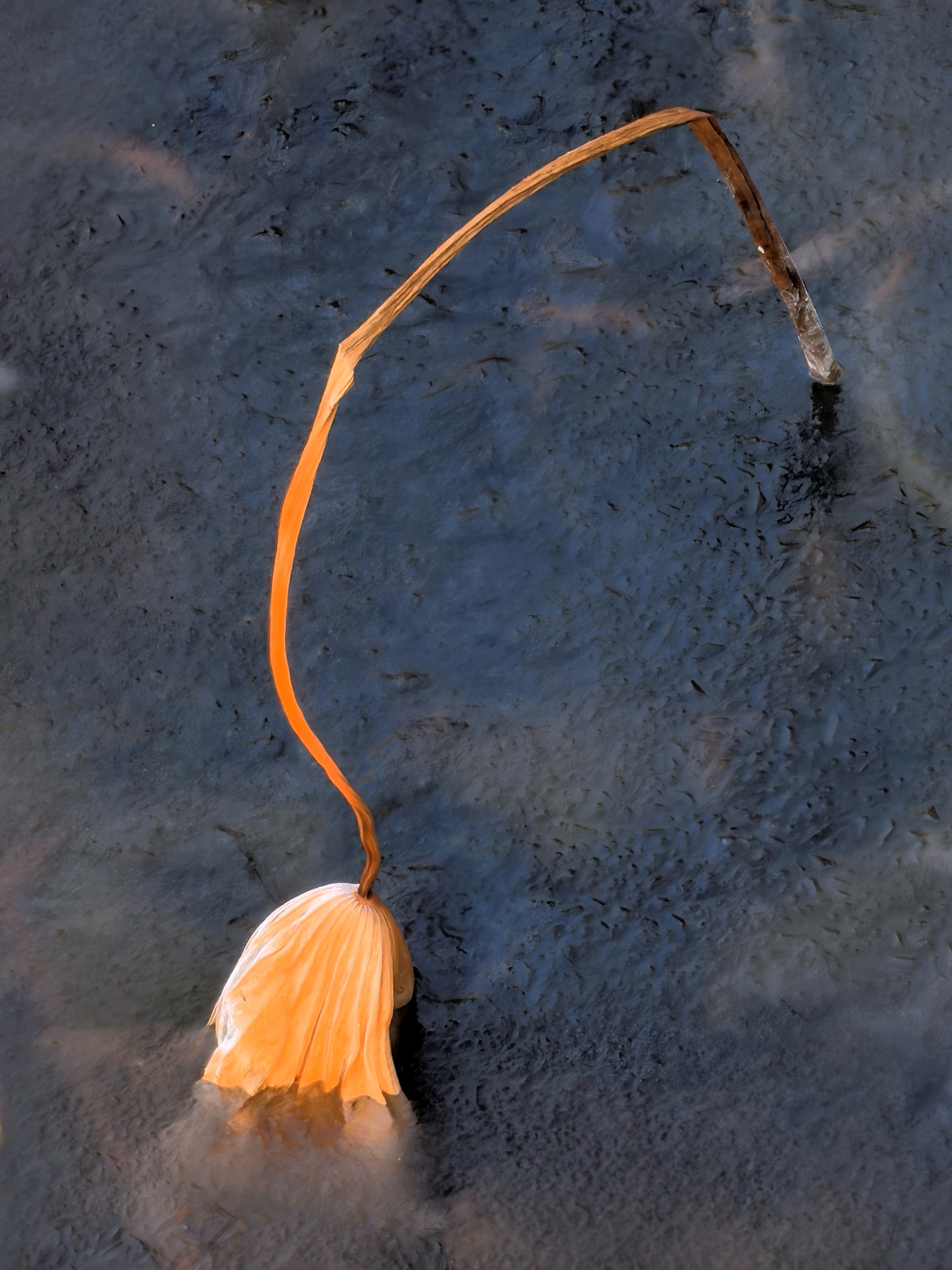 四九的五洲湖,冰封湖面,清晨橙色阳光洒在冰面,一枝枝枯荷独自伫立,好像是叙述季节的变化。
