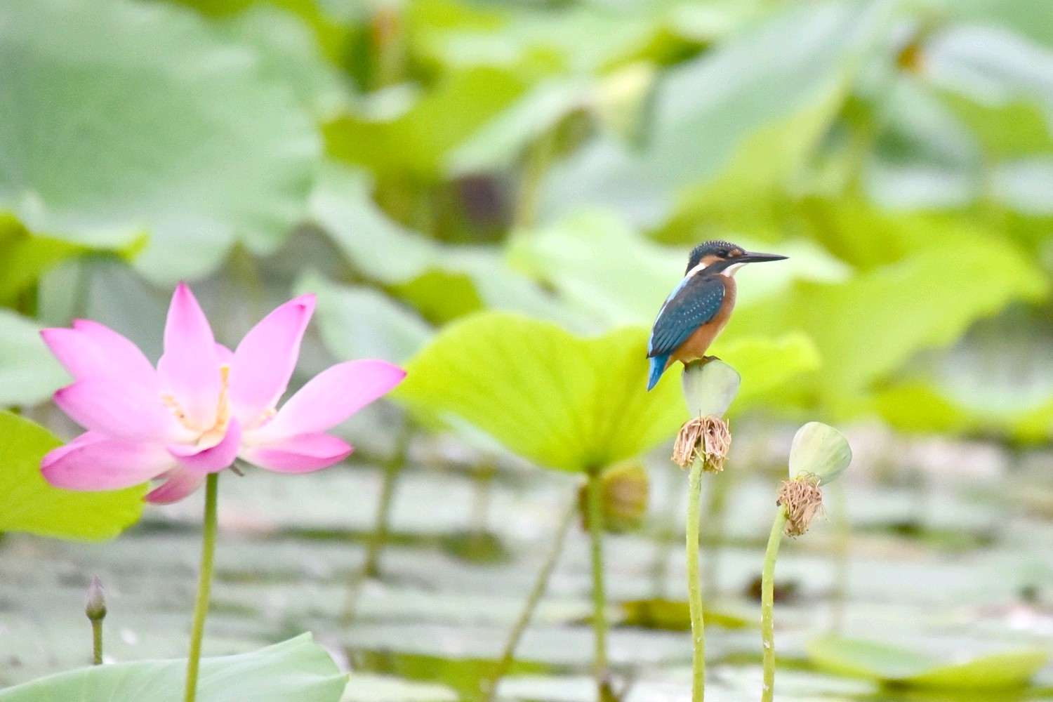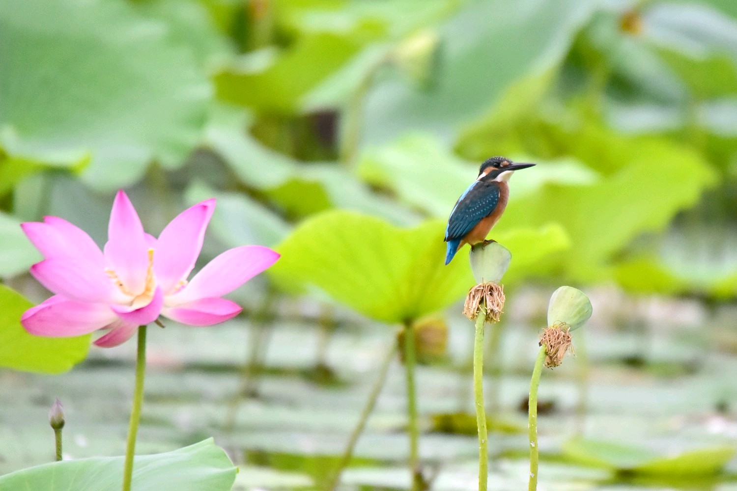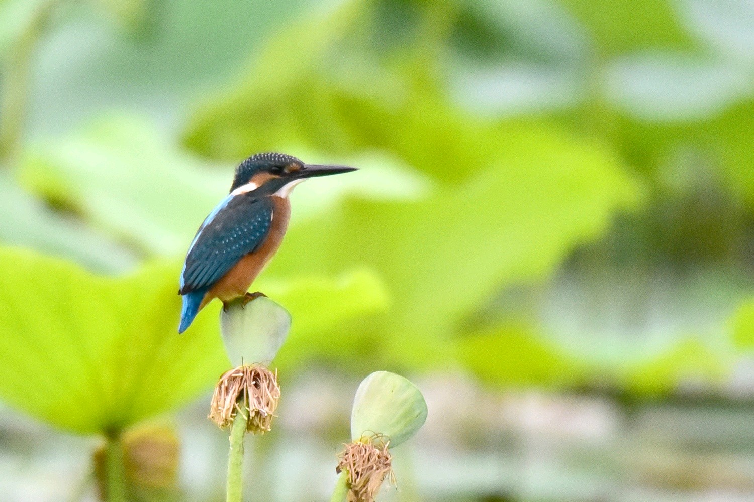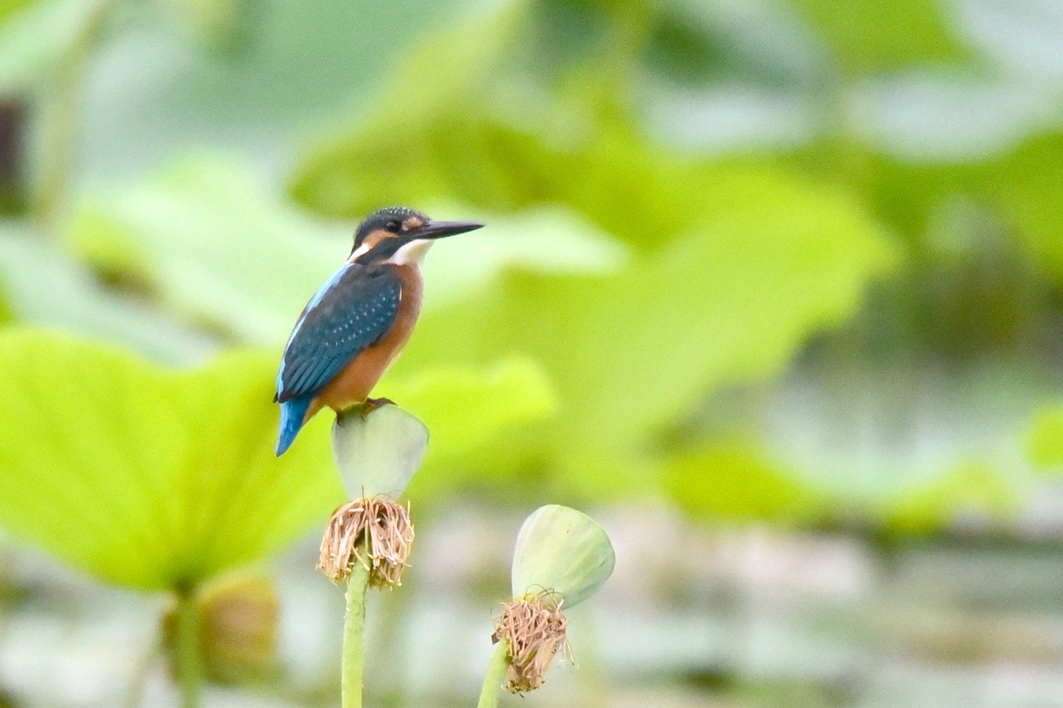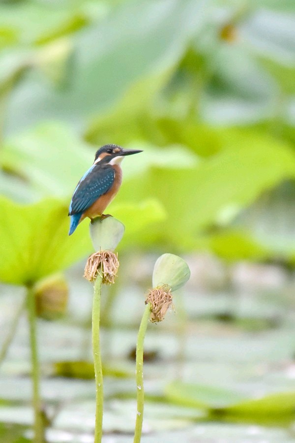 普通翠鸟是佛法僧目翠鸟科的小型鸟类,体长16-17厘米,翼展24-26厘米,体重30-45克。体色较淡,耳覆羽棕色,耳后有一白斑。额、头顶、枕和后颈黑绿色,前额侧部、颊、眼后和耳覆羽栗棕红色,颧纹翠蓝绿黑色,背至尾上覆羽辉翠蓝色。翅和尾较蓝,下体较红褐,幼鸟羽色较苍淡,上体较少蓝色光泽,下体羽色较淡,沾较多褐色,腹中央污白色。栖息于有灌丛或树林、水清澈而缓流的小河、溪涧、湖泊以及灌溉渠等水域。单独或成对活动。性孤独,平时常独栖在近水边的树枝上或岩石上,伺机猎食,食物以小鱼为主,兼吃甲壳类和多种水生昆虫及其幼虫。