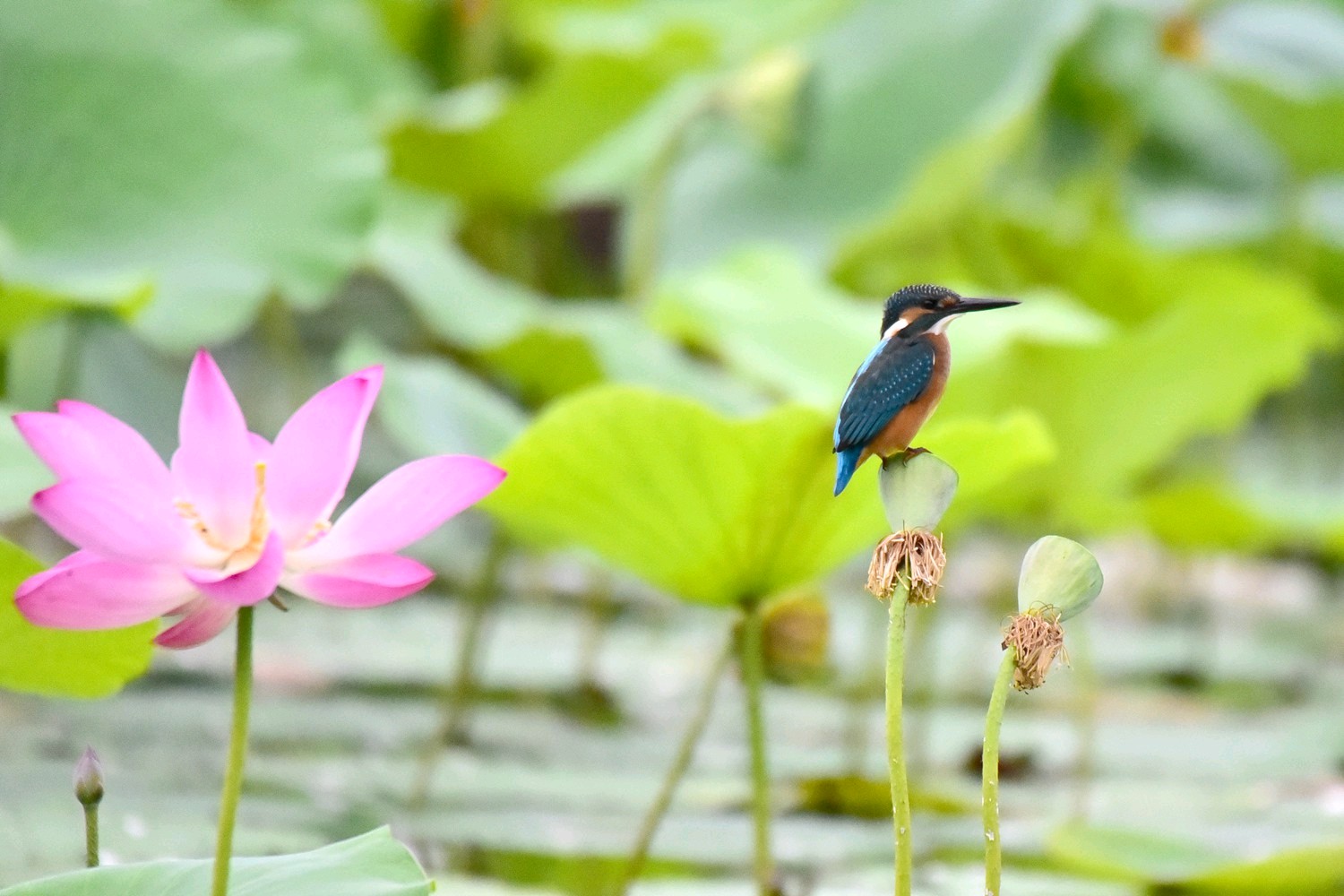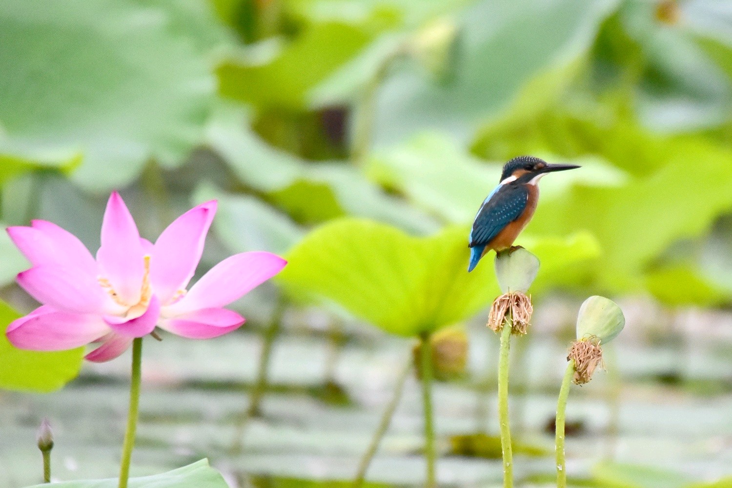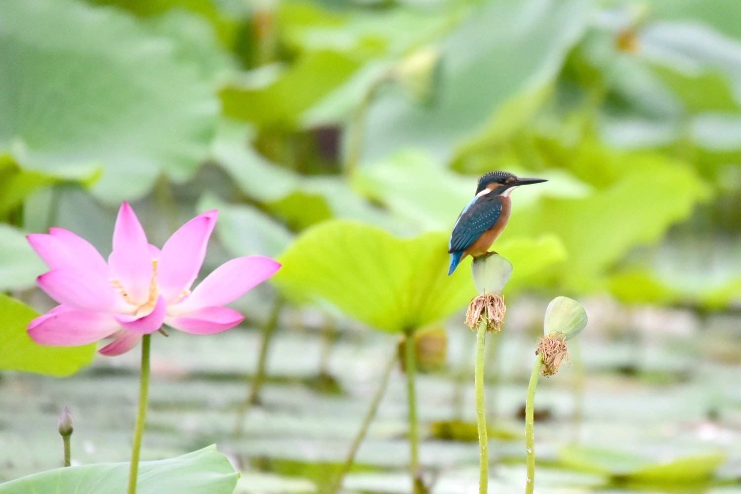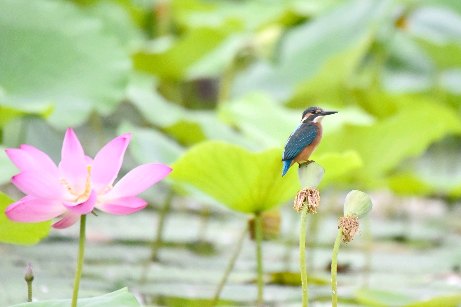 普通翠鸟是佛法僧目翠鸟科的小型鸟类,体长16-17厘米,翼展24-26厘米,体重30-45克。体色较淡,耳覆羽棕色,耳后有一白斑。额、头顶、枕和后颈黑绿色,前额侧部、颊、眼后和耳覆羽栗棕红色,颧纹翠蓝绿黑色,背至尾上覆羽辉翠蓝色。翅和尾较蓝,下体较红褐,幼鸟羽色较苍淡,上体较少蓝色光泽,下体羽色较淡,沾较多褐色,腹中央污白色。栖息于有灌丛或树林、水清澈而缓流的小河、溪涧、湖泊以及灌溉渠等水域。单独或成对活动。性孤独,平时常独栖在近水边的树枝上或岩石上,伺机猎食,食物以小鱼为主,兼吃甲壳类和多种水生昆虫及其幼虫。