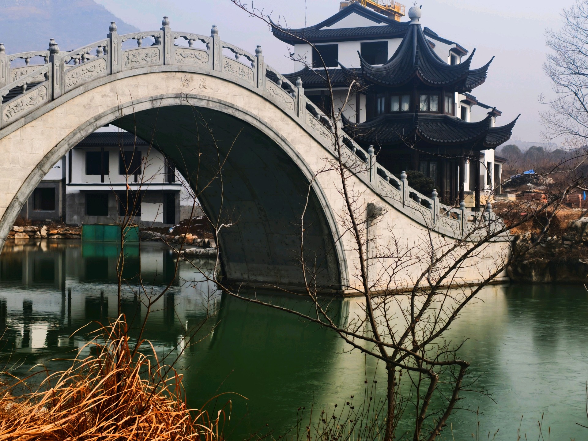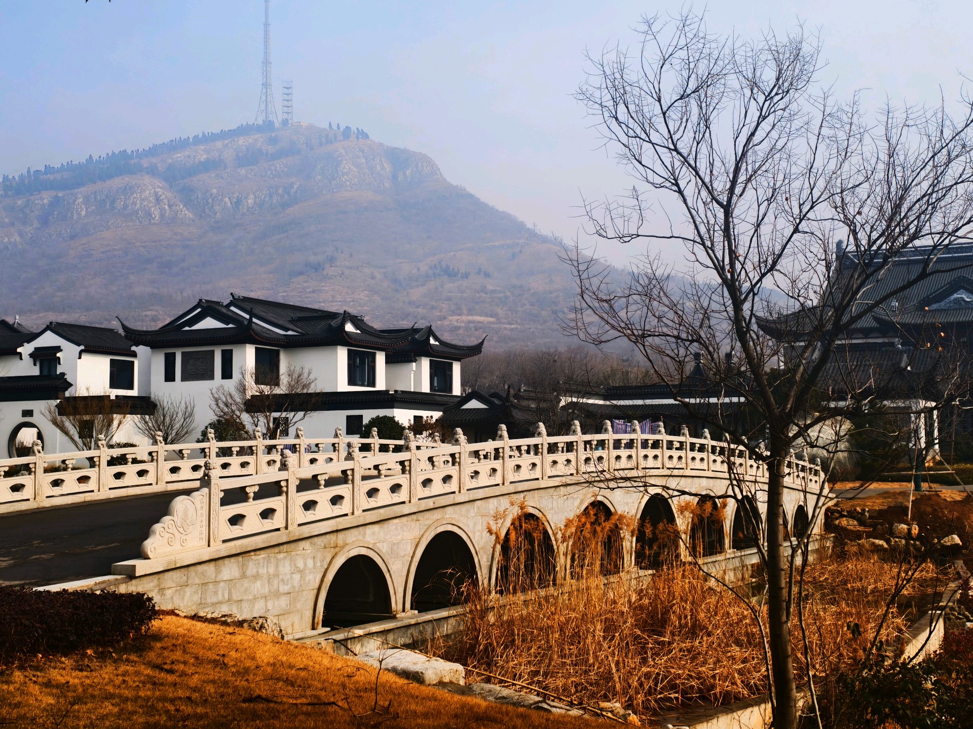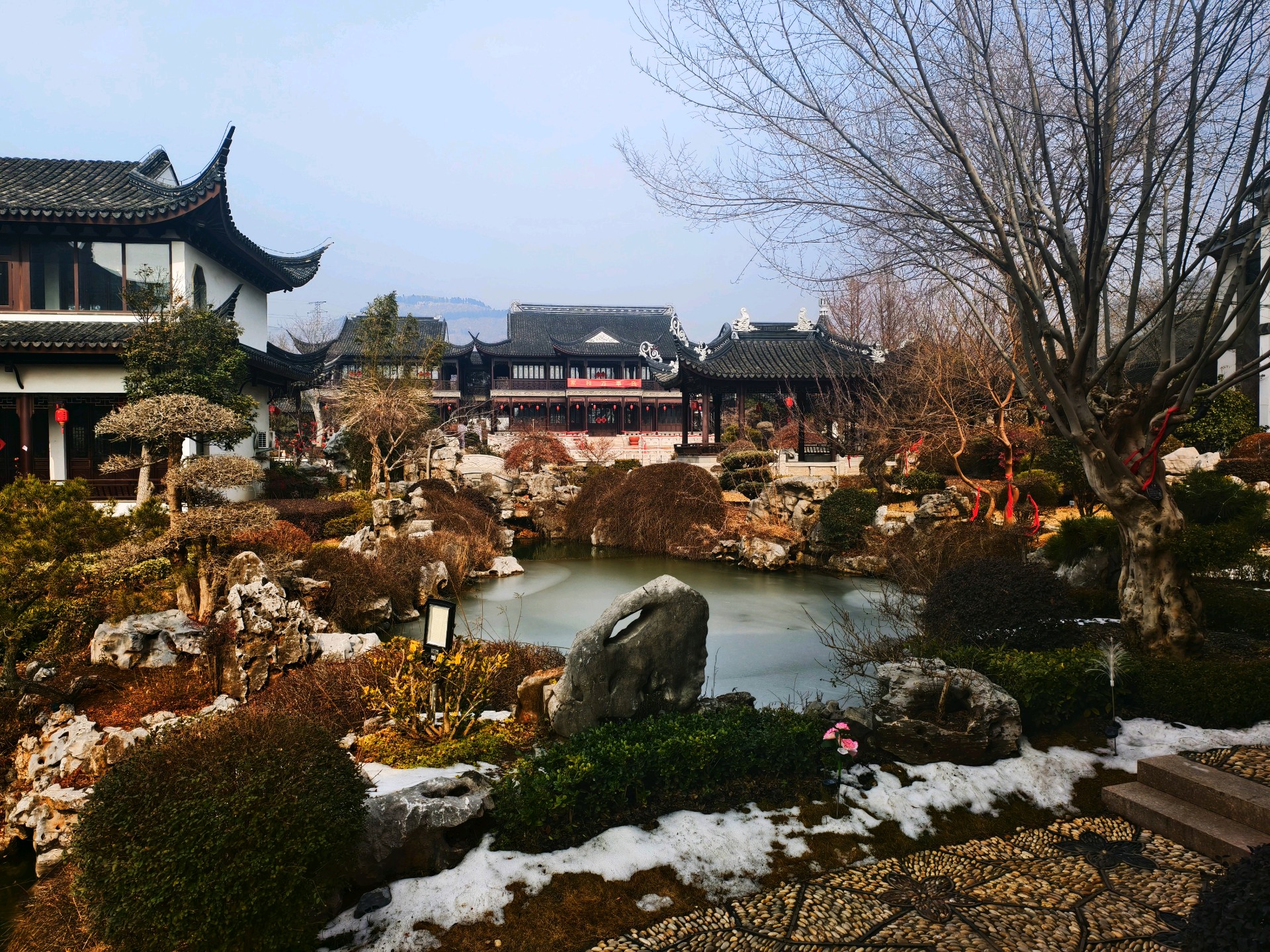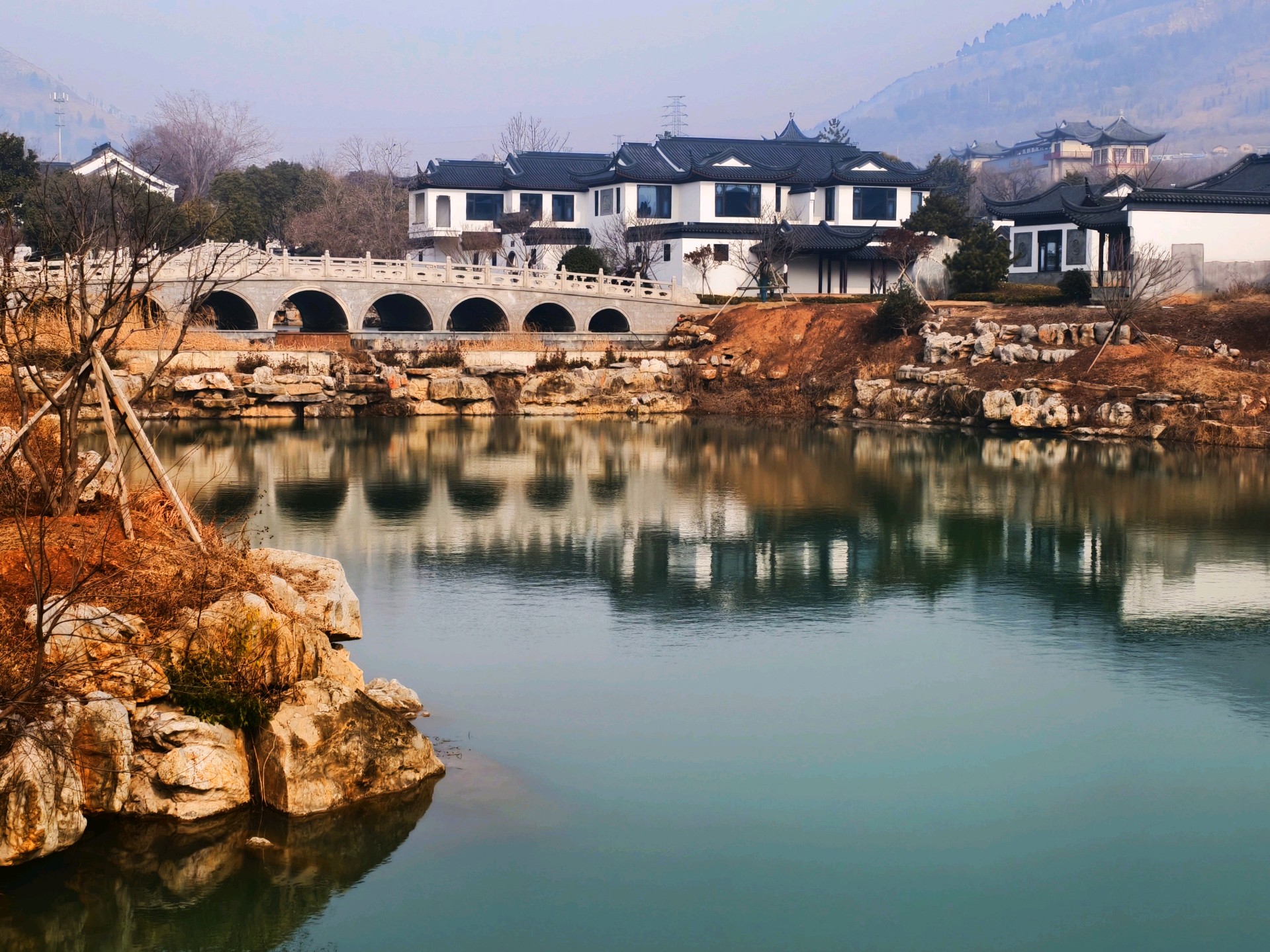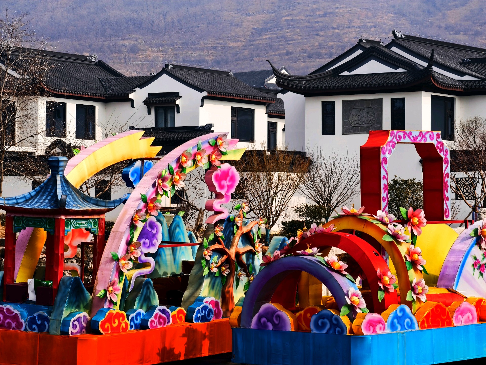 山东枣庄:留园山庄诗情画意2026年1月27日,山东枣庄万亩石榴园西大门留园山庄,粉墙黛瓦的徽派民居静卧山水之间。玉带石桥横跨水面,澄澈湖水倒映着亭台楼阁,残冬草木晕染出萧瑟温柔。新春的花灯已经装点园区,灵动的骏马花灯与彩车传递着年味,古雅庄园交织着冬日诗意与新年暖意。(姚三石 摄影)