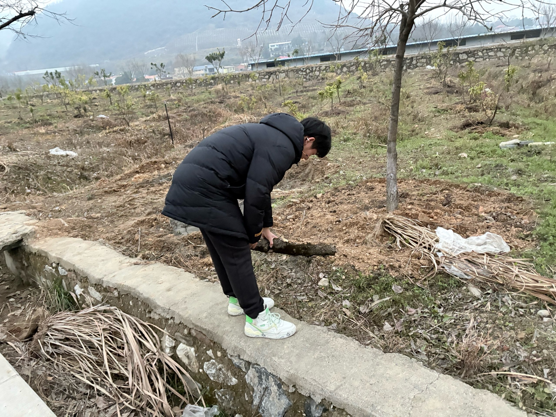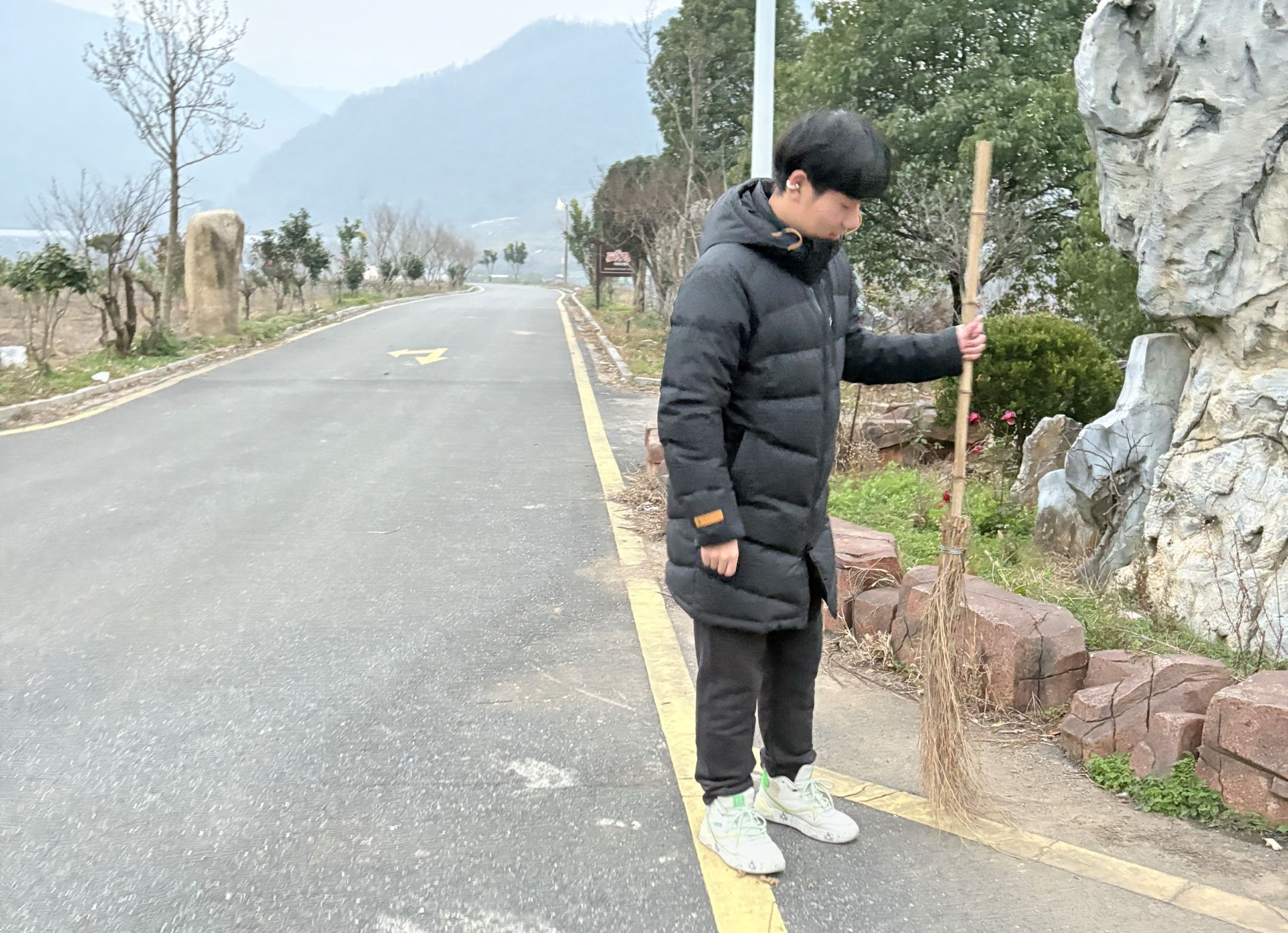 活动当天,春寒料峭,山间的风裹挟着凉意,但队员们的热情丝毫未减。在园区入口的景观大道上,队员们手持扫帚,沿着道路两侧的黄线缓缓推进,仔细清扫着路边的落叶与碎石;在另一侧的闲置地块,有人弯腰捡拾深埋在泥土里的废弃树枝与塑料垃圾,有人蹲下身清理石缝间的烟头与纸屑,他们穿梭在林间步道与景观石旁,不放过任何一处卫生死角。