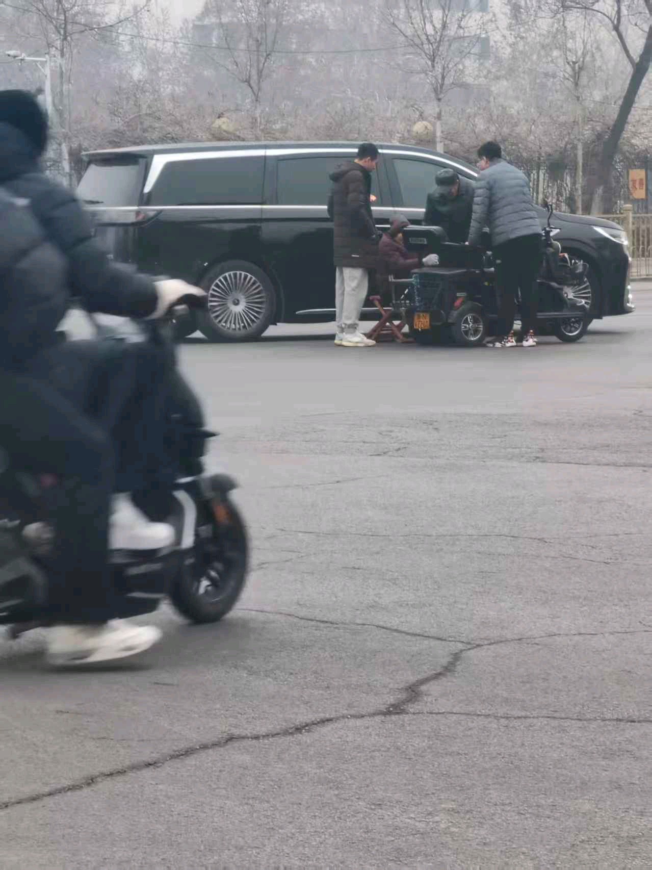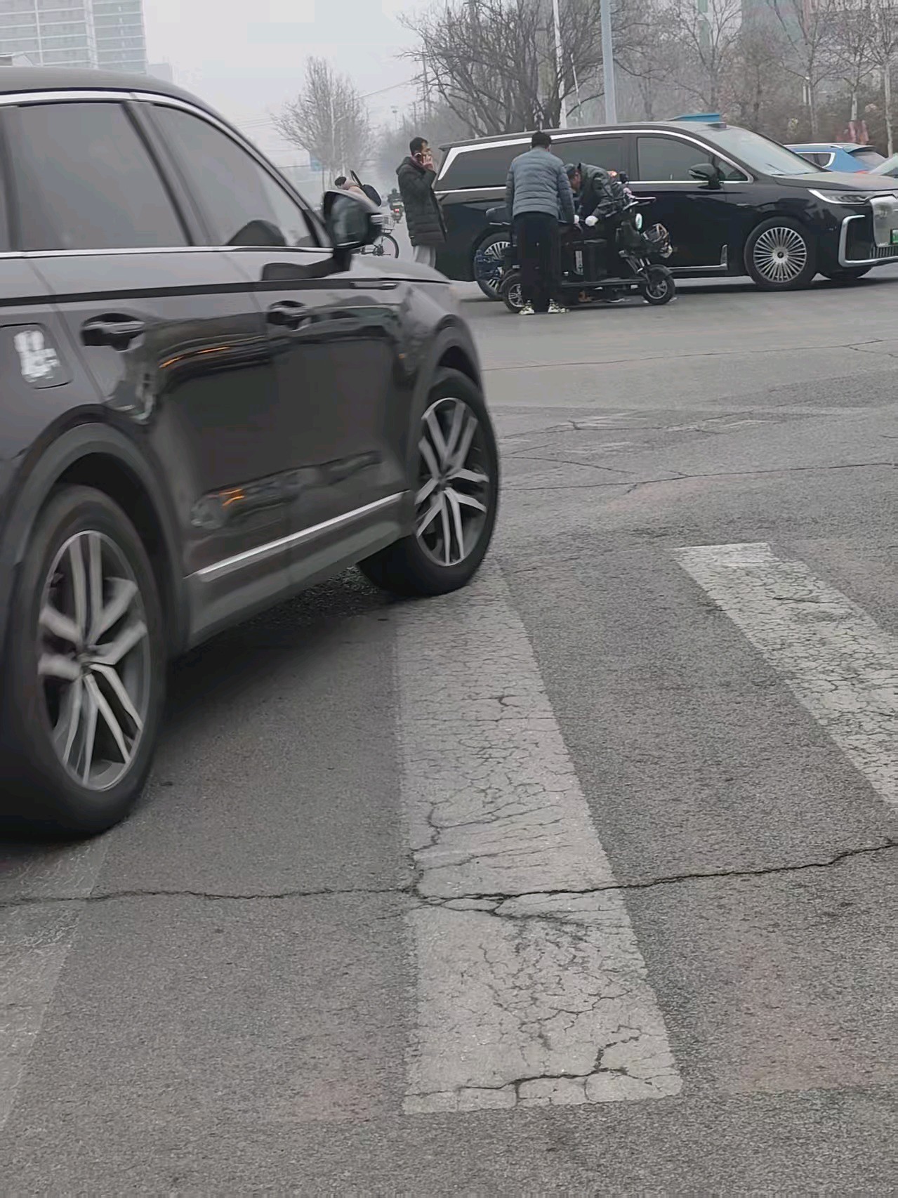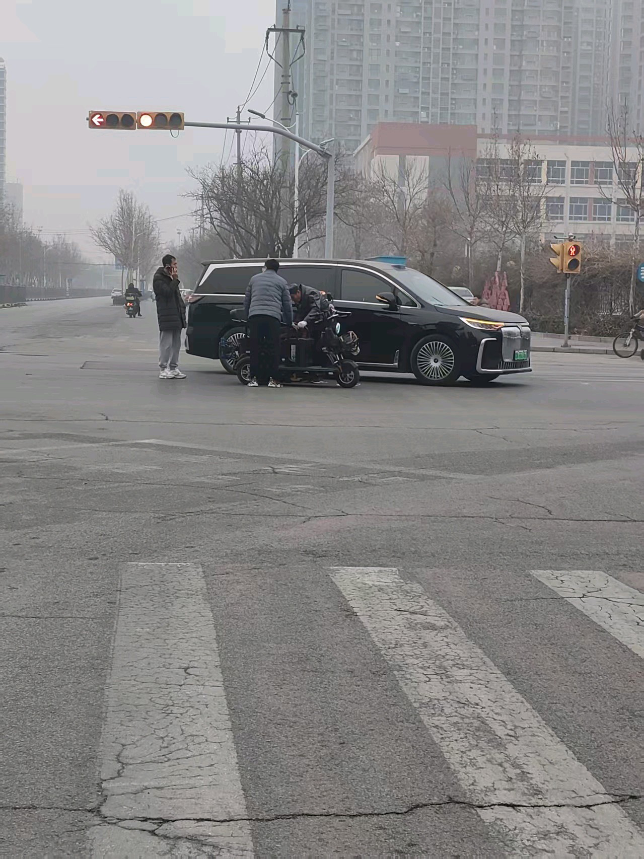 德城区三八东路九中路口发生了一起私家车与一辆老年人夫妇骑行的电动三轮车拐弯碰撞事故,幸亏没有人员受伤,提醒大家注意安全,保护自己及家人。