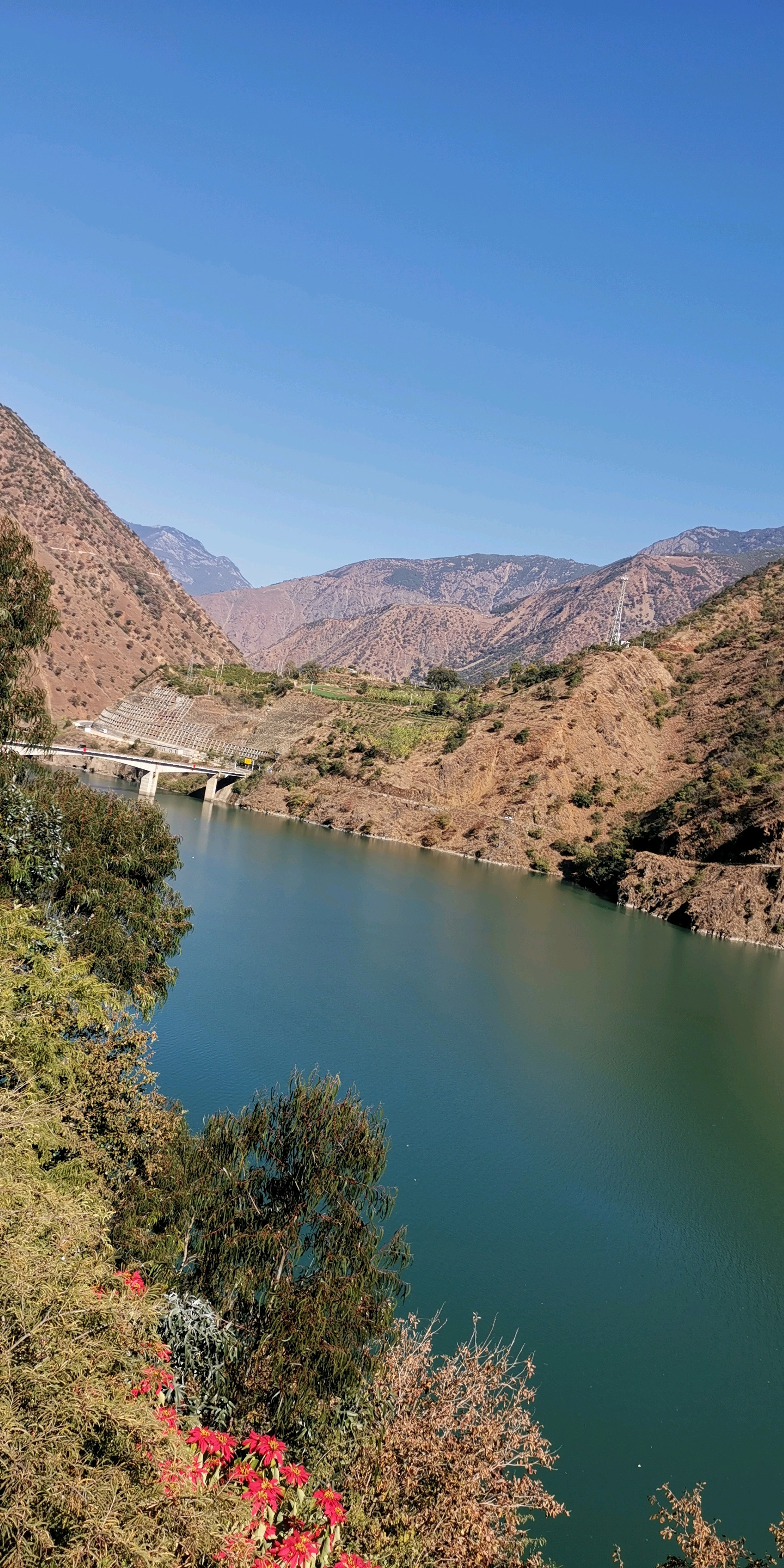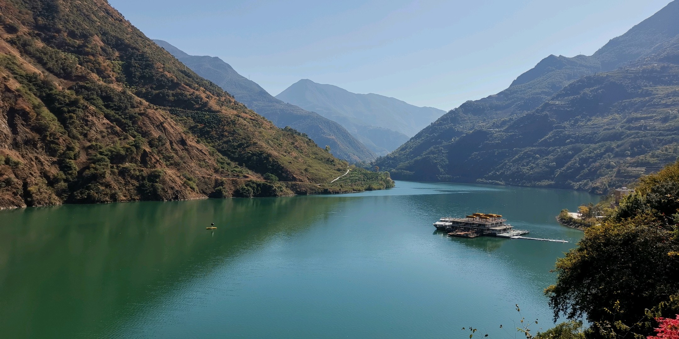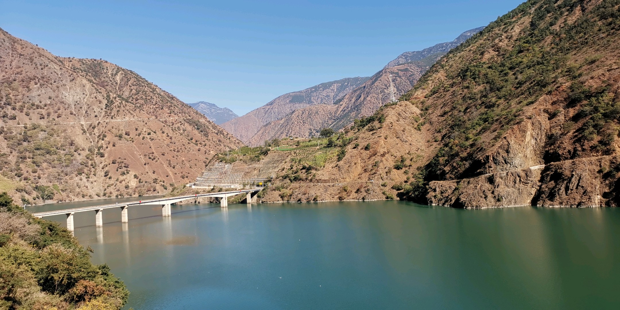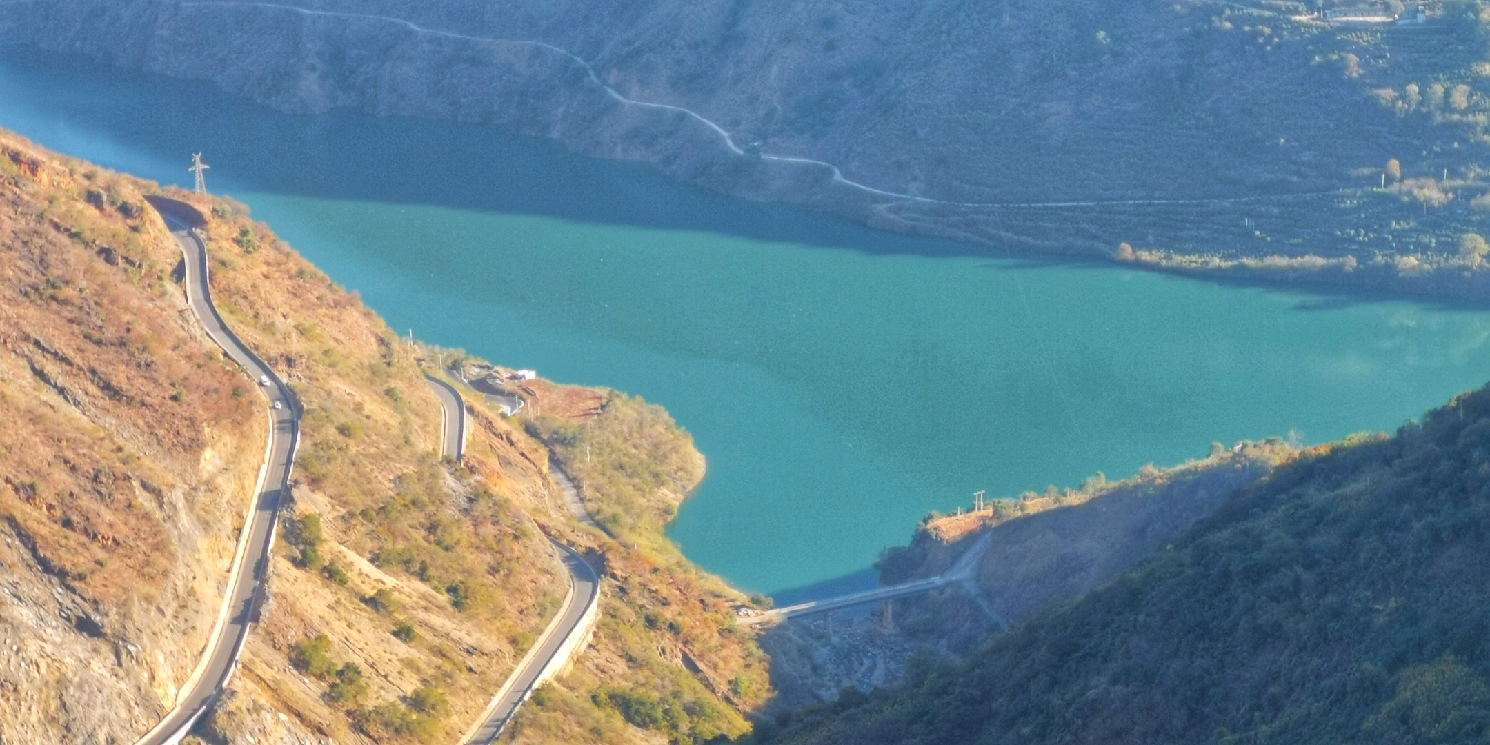蜿蜒曲折的山路,碧绿的湖水,构成了一幅美丽的山水画卷。