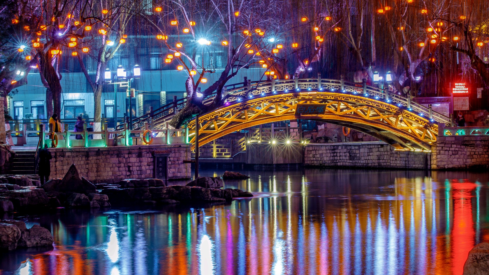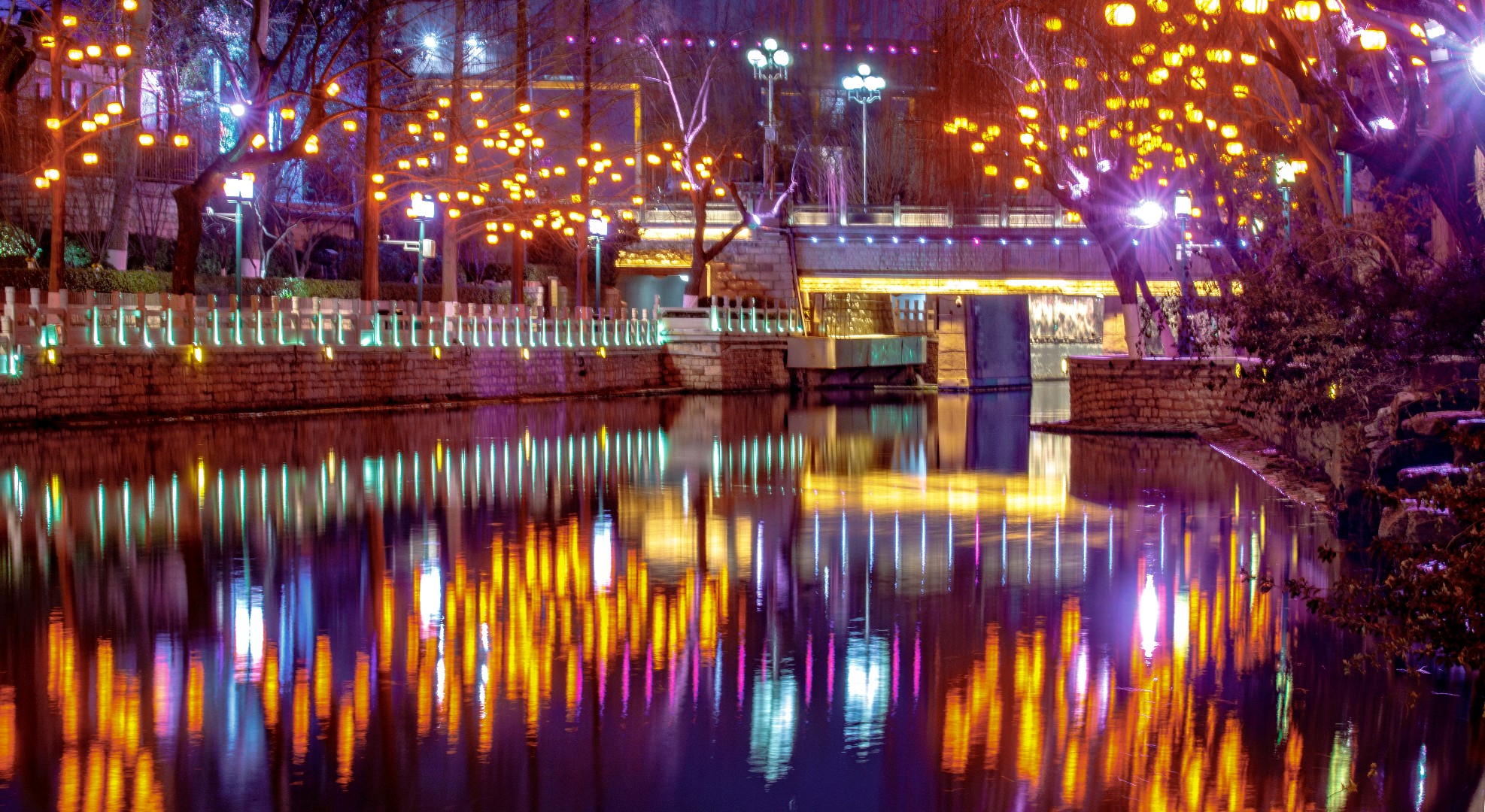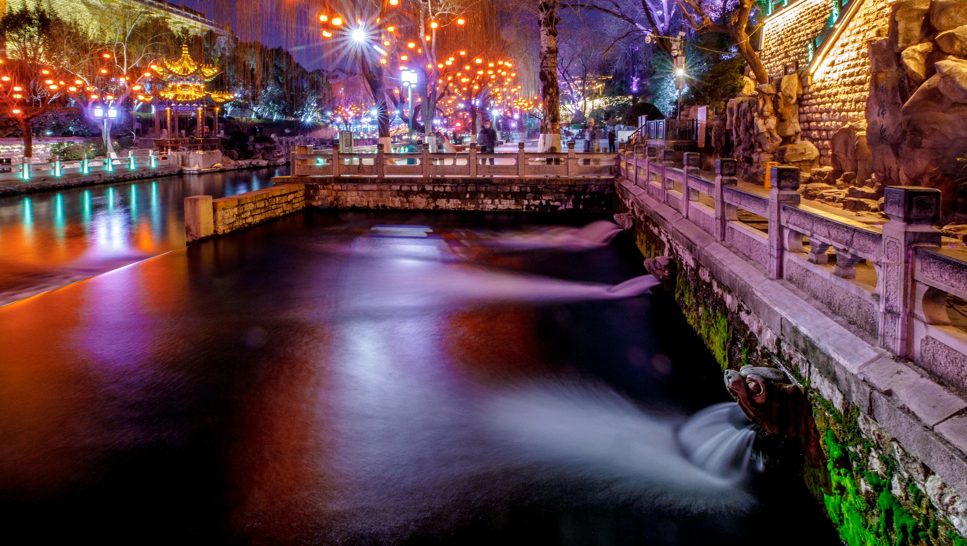 环城公园黑虎泉至南门桥段灯光璀璨。橘红色柿子灯缀满护城河两岸,琵琶桥、白石桥的斑斓灯影映在碧波中。黑虎泉三虎头奔涌喷薄,涛声阵阵。夜幕下,游人徜徉泉边,赏灯观泉,兴致盎然,处处洋溢着新春的热闹与欢喜。