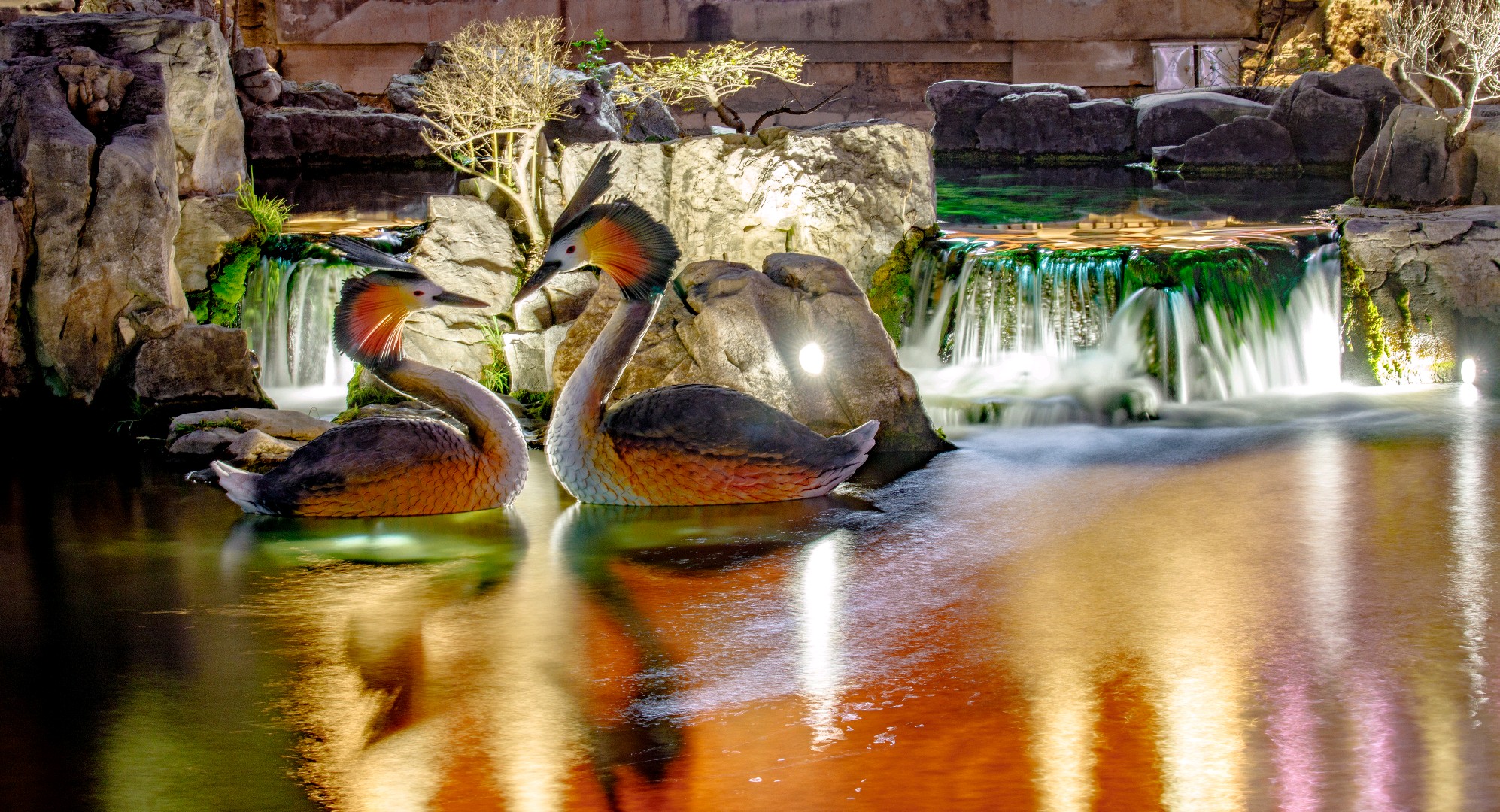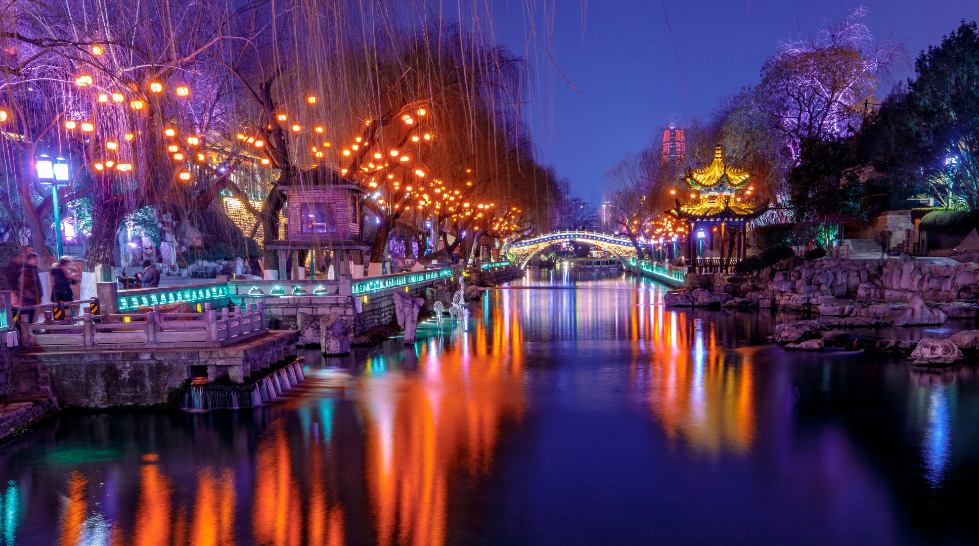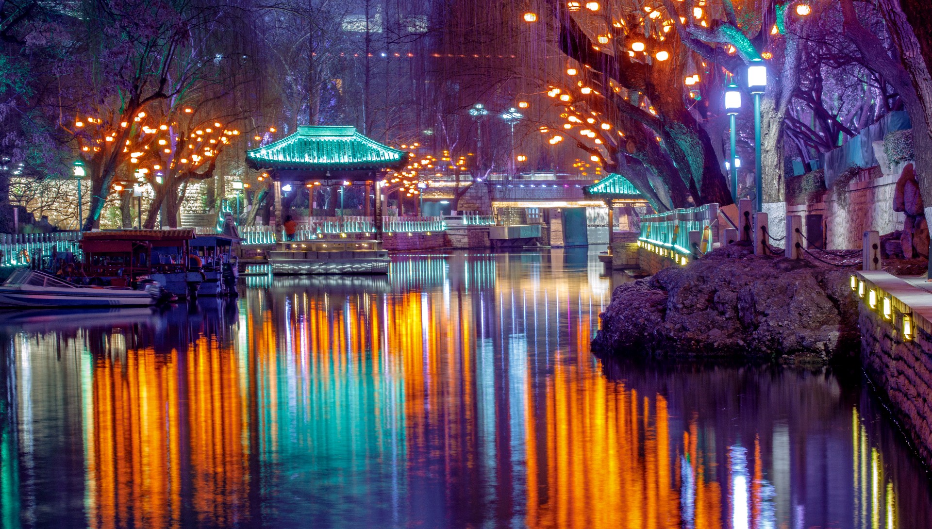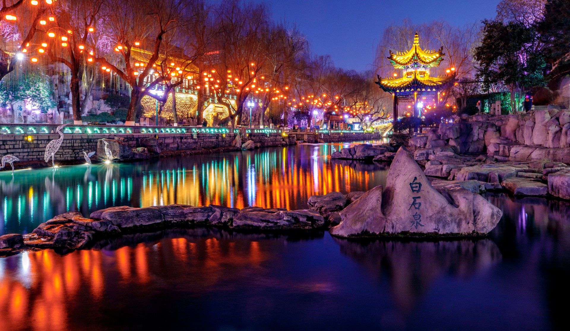 环城公园黑虎泉至南门桥段灯光璀璨。橘红色柿子灯缀满护城河两岸,琵琶桥、白石桥的斑斓灯影映在碧波中。黑虎泉三虎头奔涌喷薄,涛声阵阵。夜幕下,游人徜徉泉边,赏灯观泉,兴致盎然,处处洋溢着新春的热闹与欢喜。