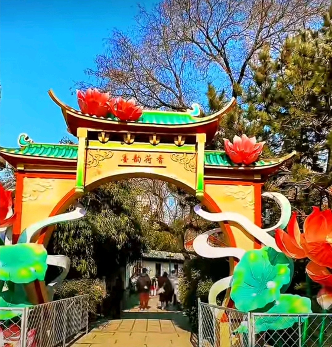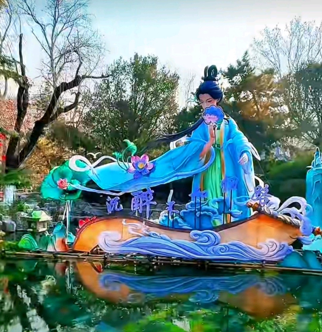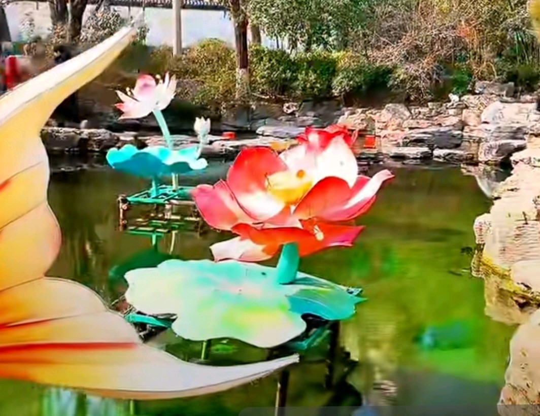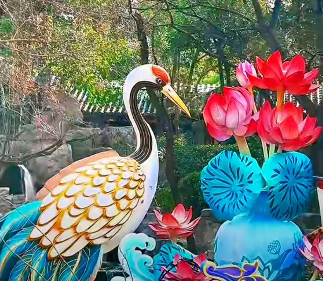 公园的花灯仙鹤与荷花相互映衬,仿佛置身于仙境之中。