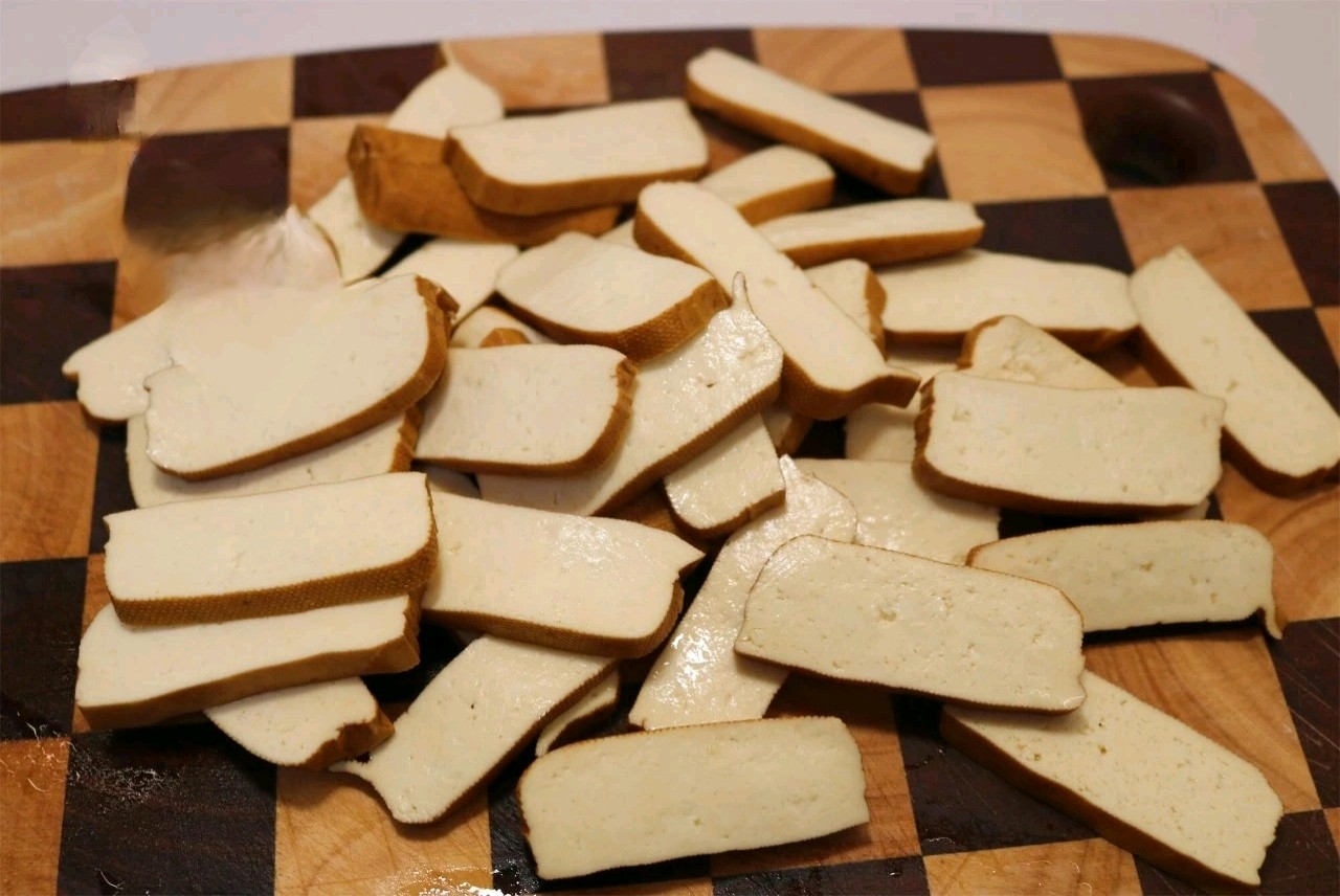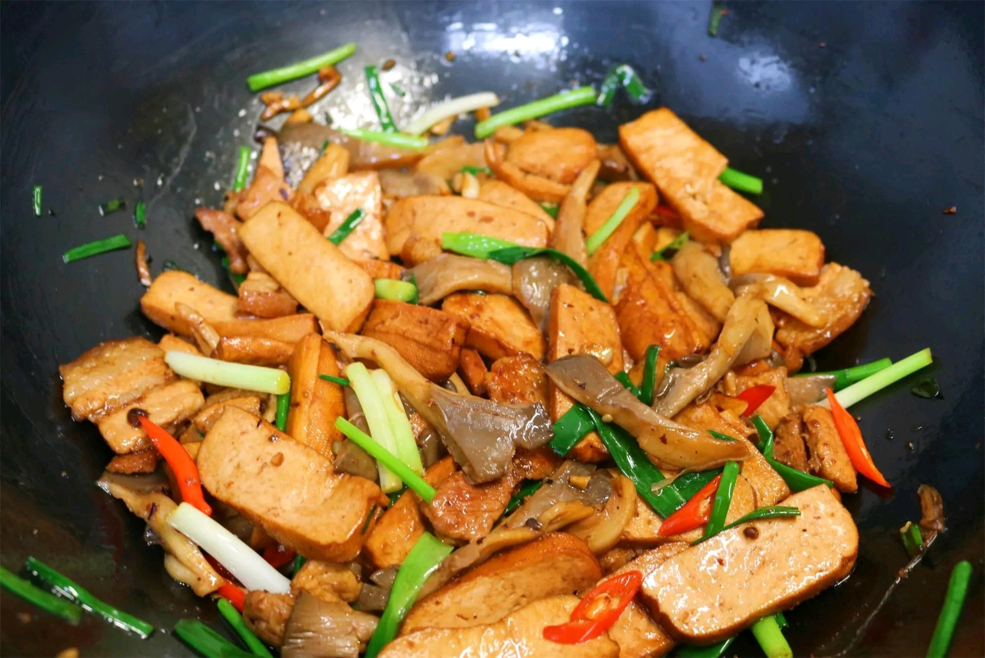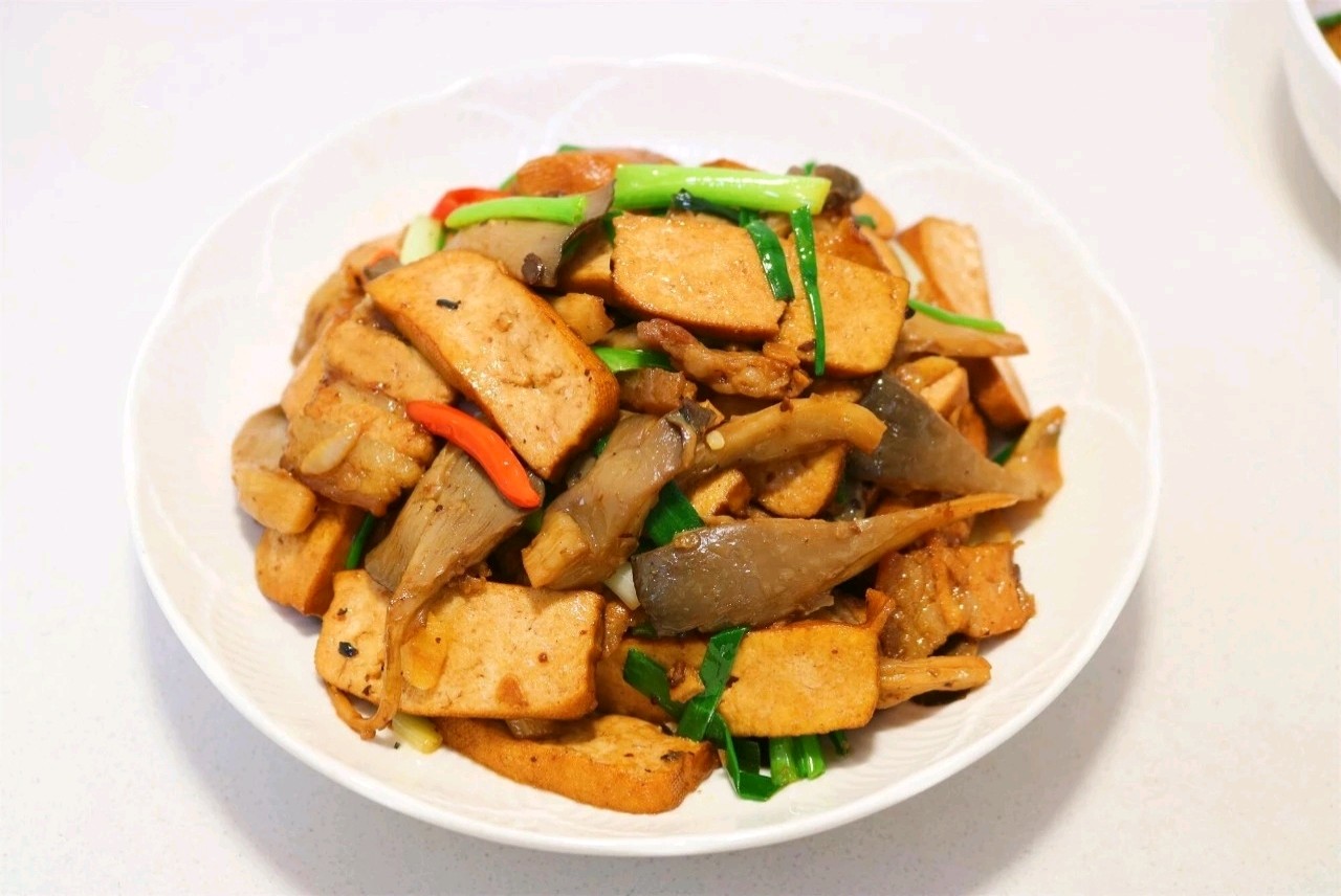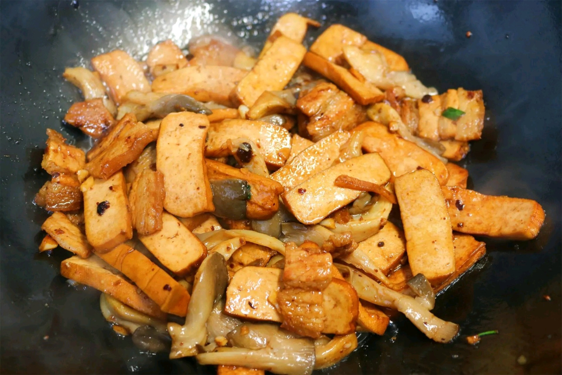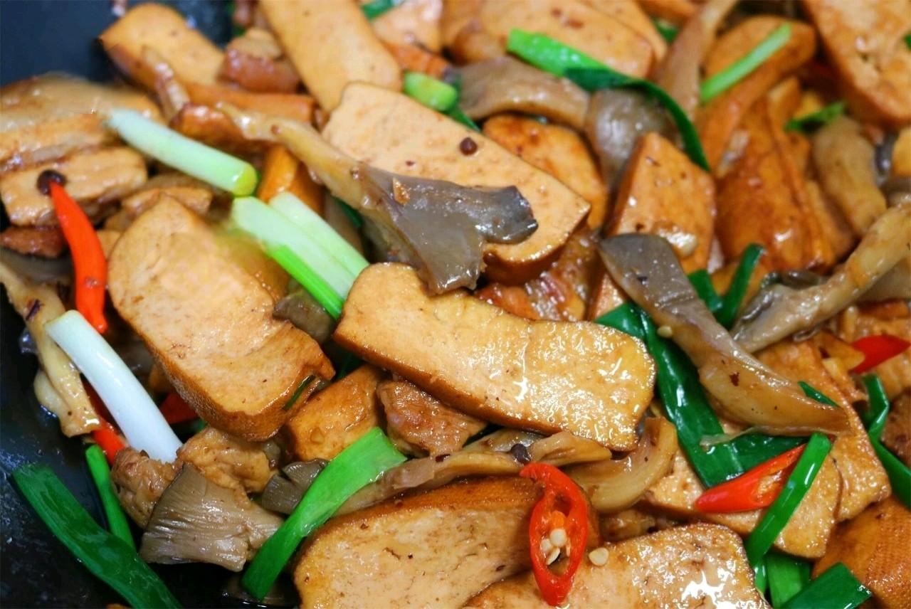 食材:攸县香干、平菇、五花肉、葱、姜、蒜、红辣椒、盐、豆豉酱、生抽、五香粉