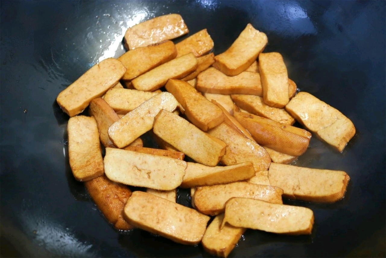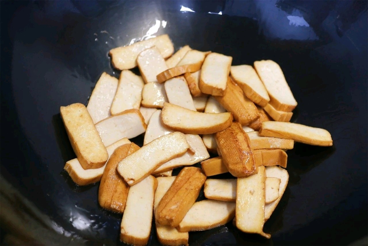 2、热锅凉油,放入香干大火翻炒,炒到表面微焦。