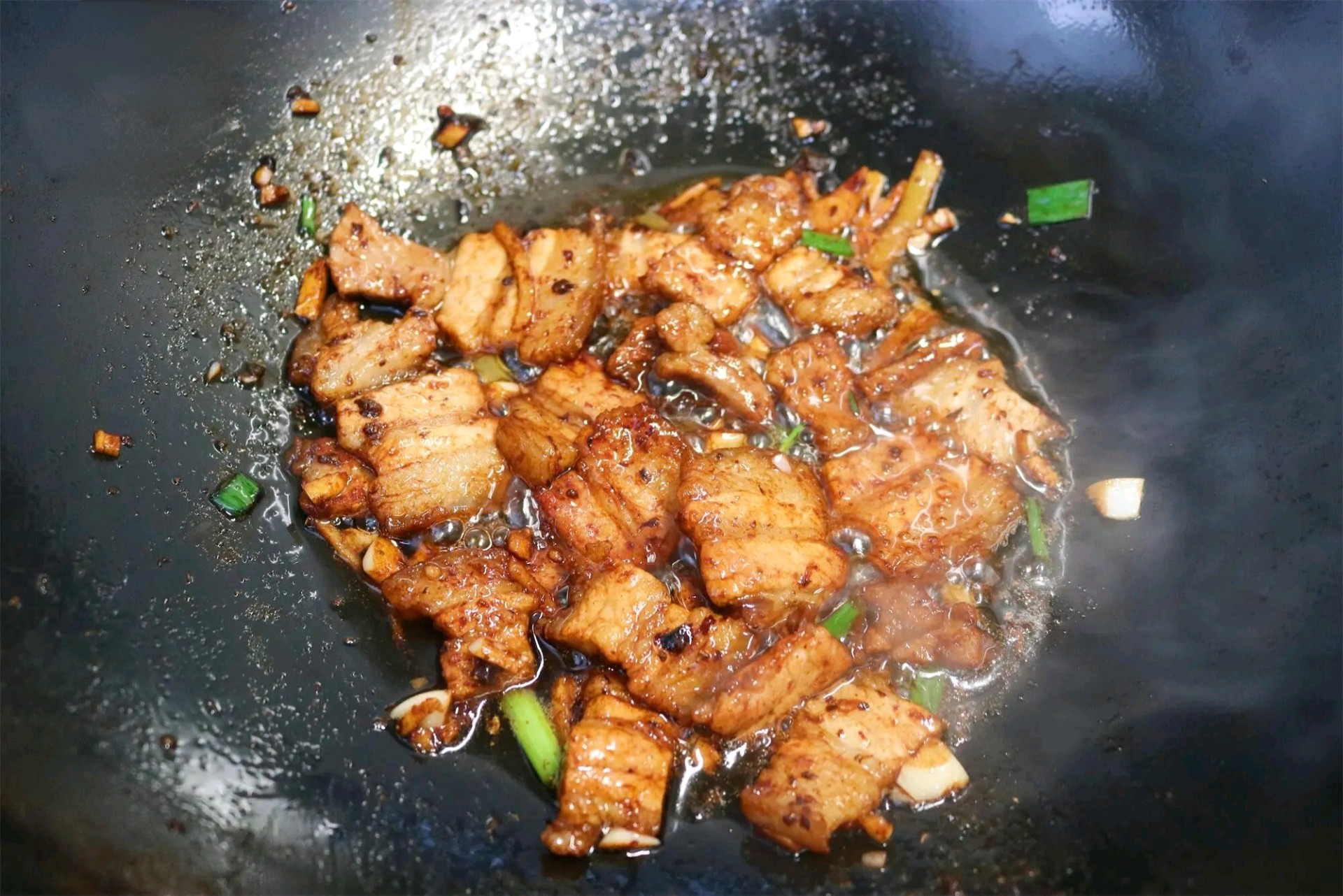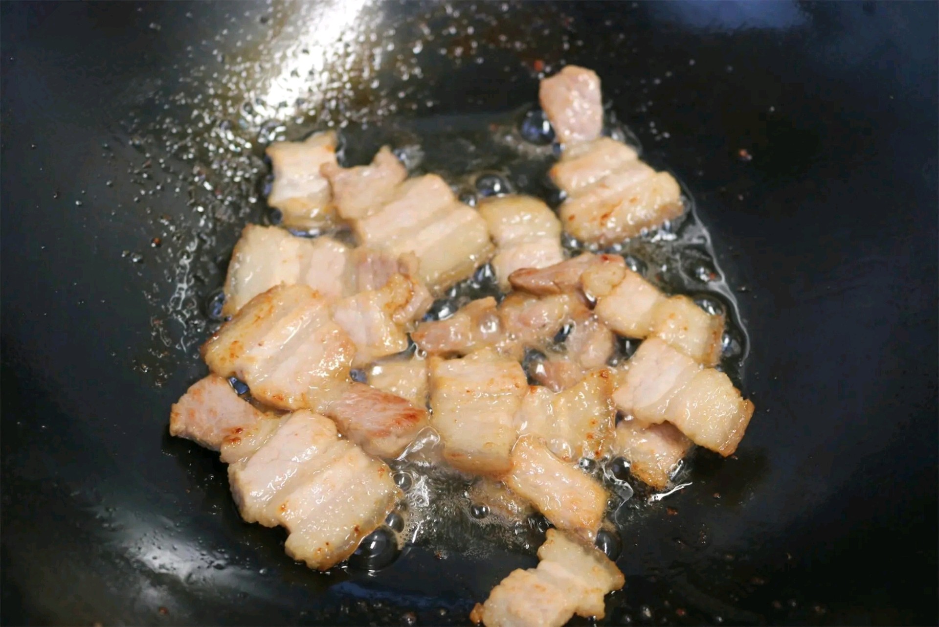 4、锅里再加少许油,放入五花肉,小火煸炒出油脂。