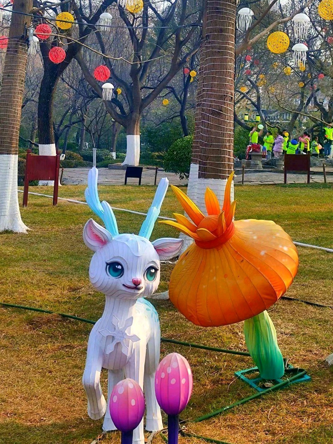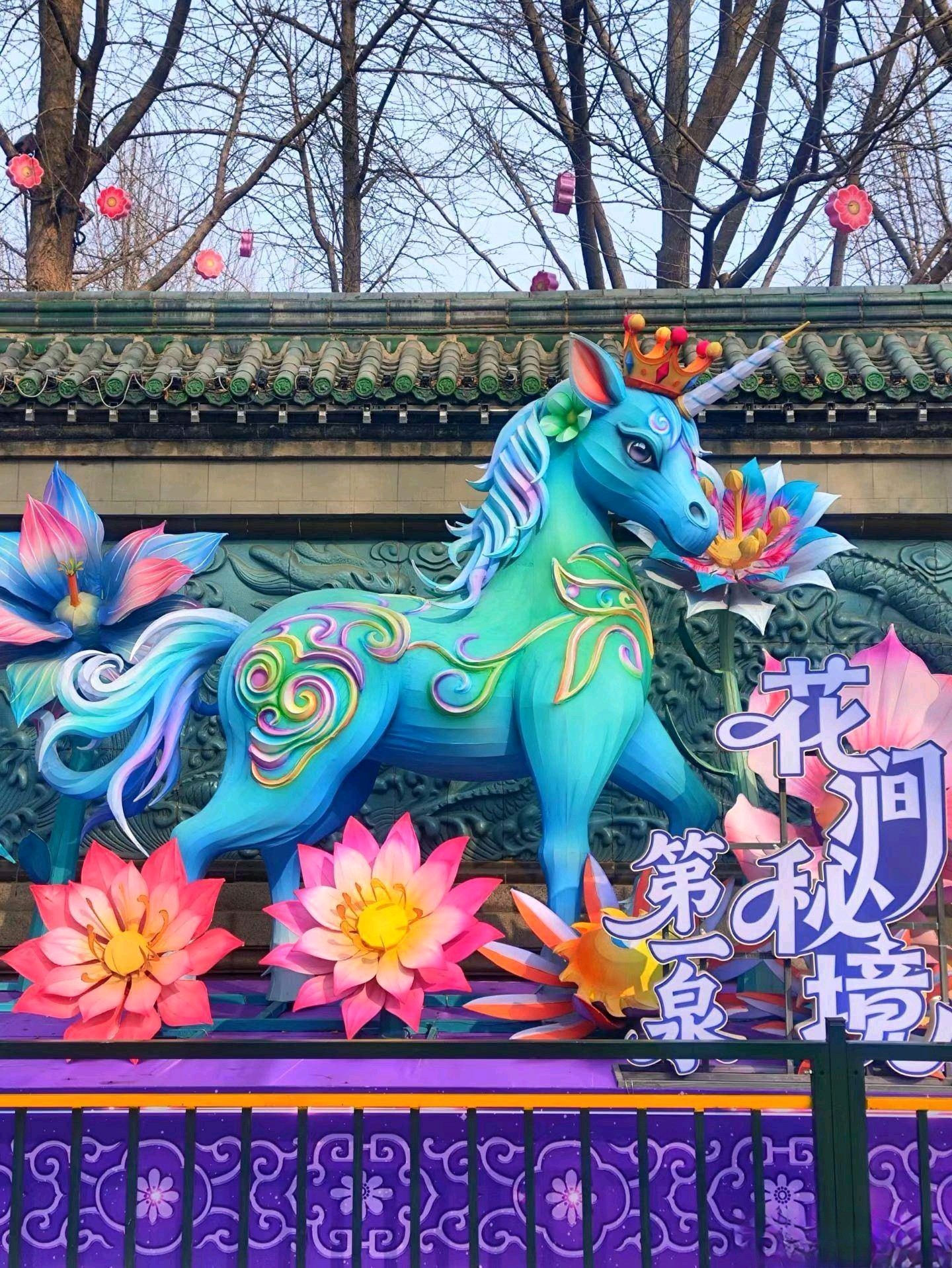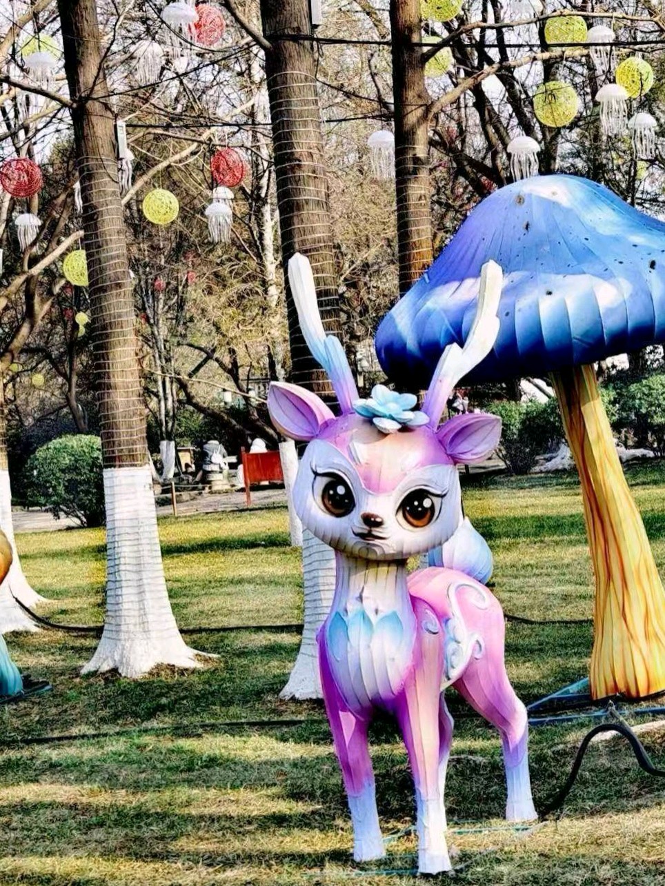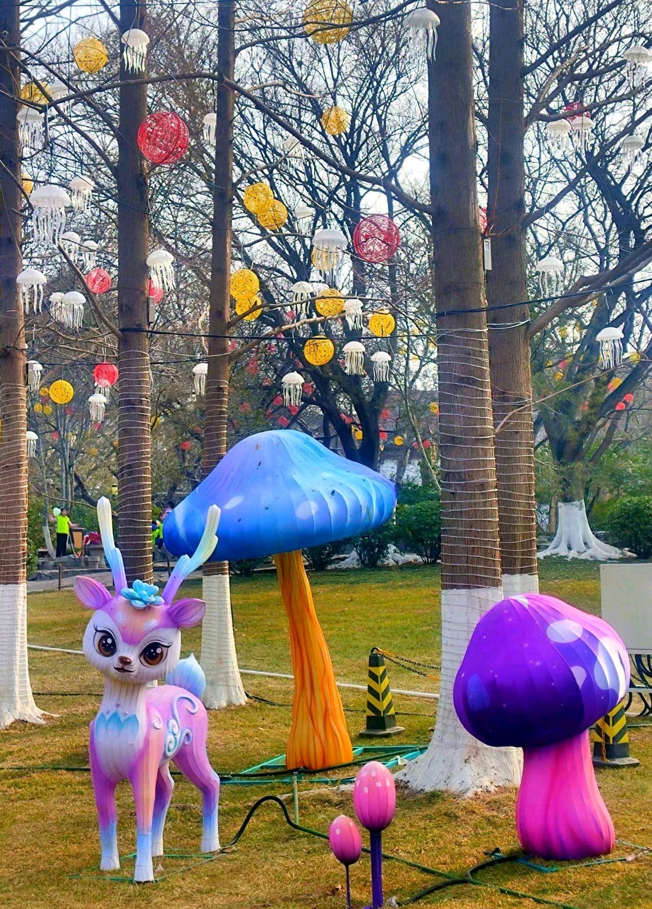 五龙潭水杉林间有粉蓝渐变的灵狐、独角兽等灯组,它们在夜色中灵动闪烁。还有巨型荷花与蘑菇装置,以及彩蝶、蜜蜂、水母等琉璃灯影,如林间精灵般沿小径蜿蜒伸展,与名泉碧水、玲珑亭阁巧妙融合,营造出了如梦如幻的童话氛围 。