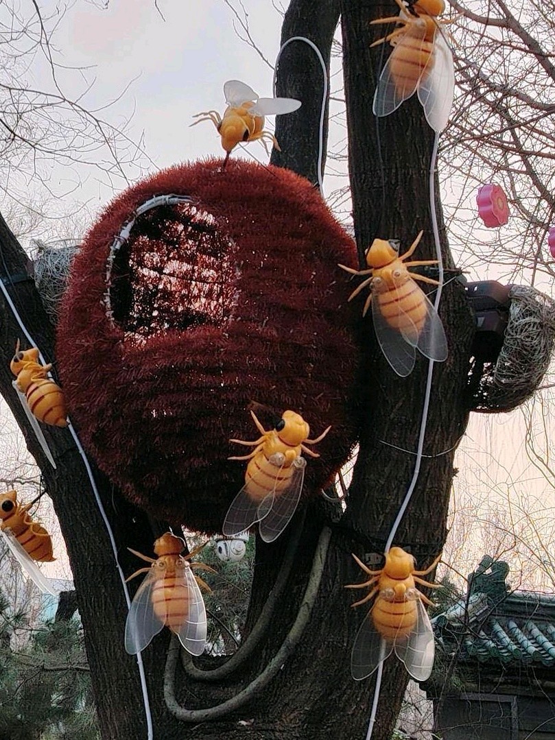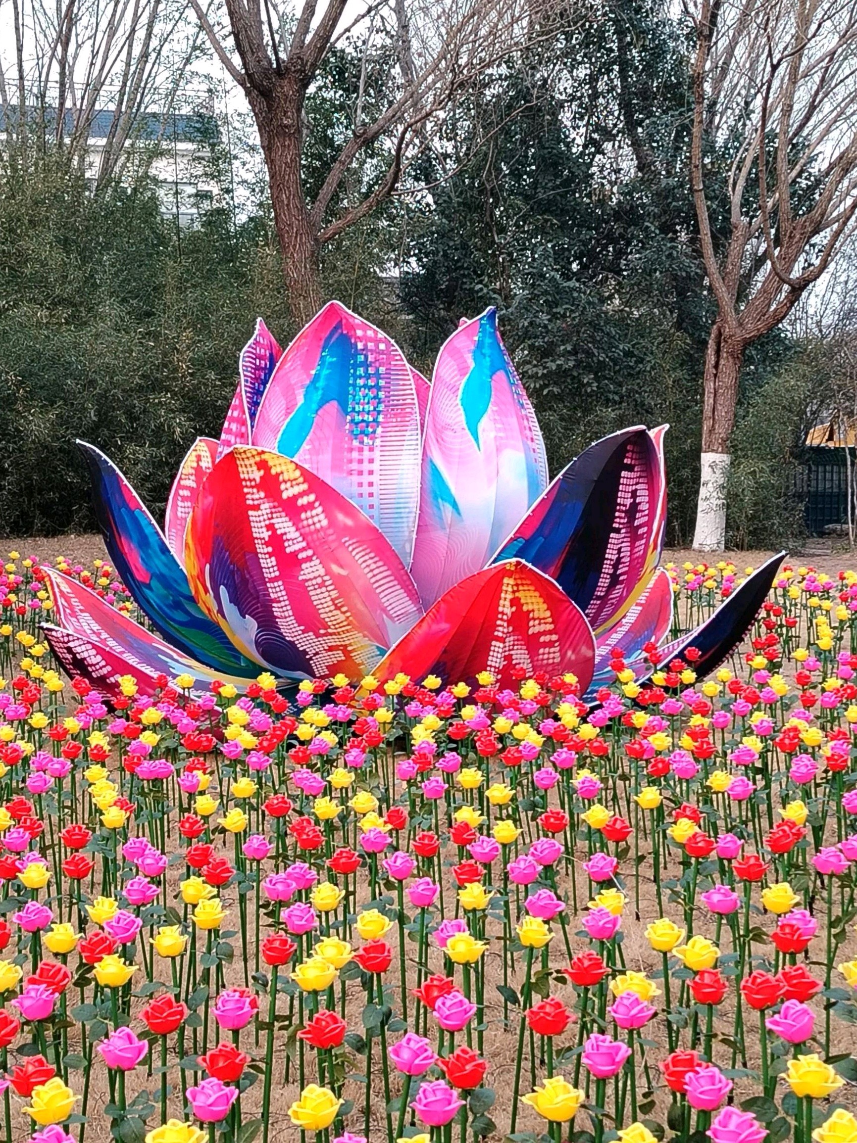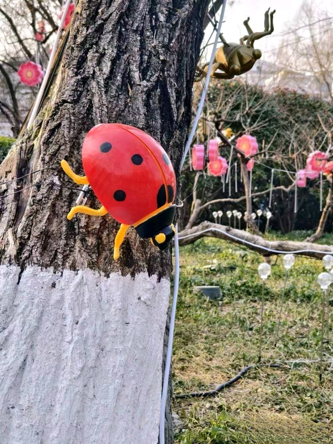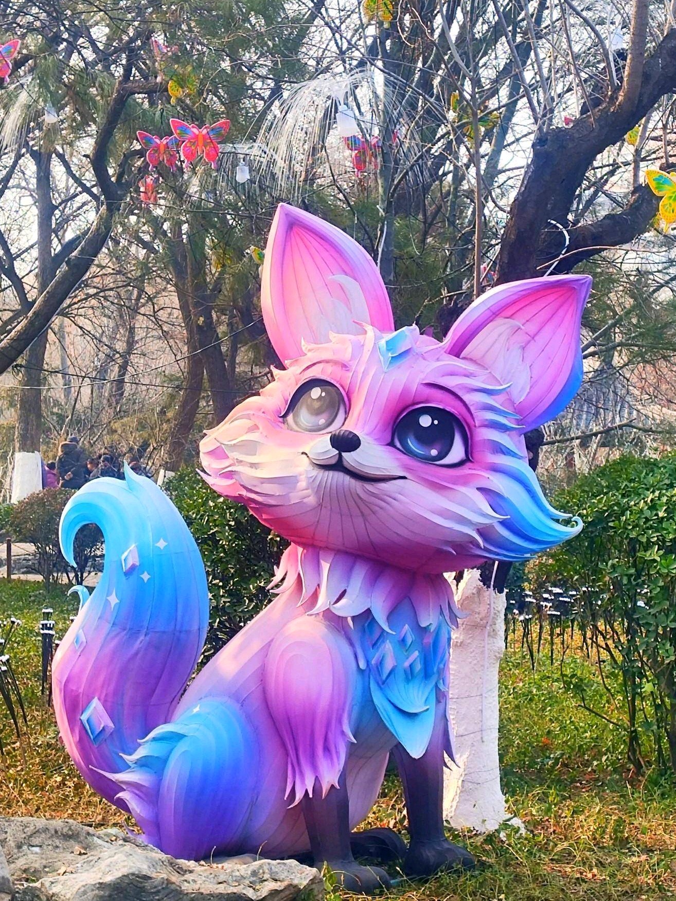 五龙潭水杉林间有粉蓝渐变的灵狐、独角兽等灯组,它们在夜色中灵动闪烁。还有巨型荷花与蘑菇装置,以及彩蝶、蜜蜂、水母等琉璃灯影,如林间精灵般沿小径蜿蜒伸展,与名泉碧水、玲珑亭阁巧妙融合,营造出了如梦如幻的童话氛围 。